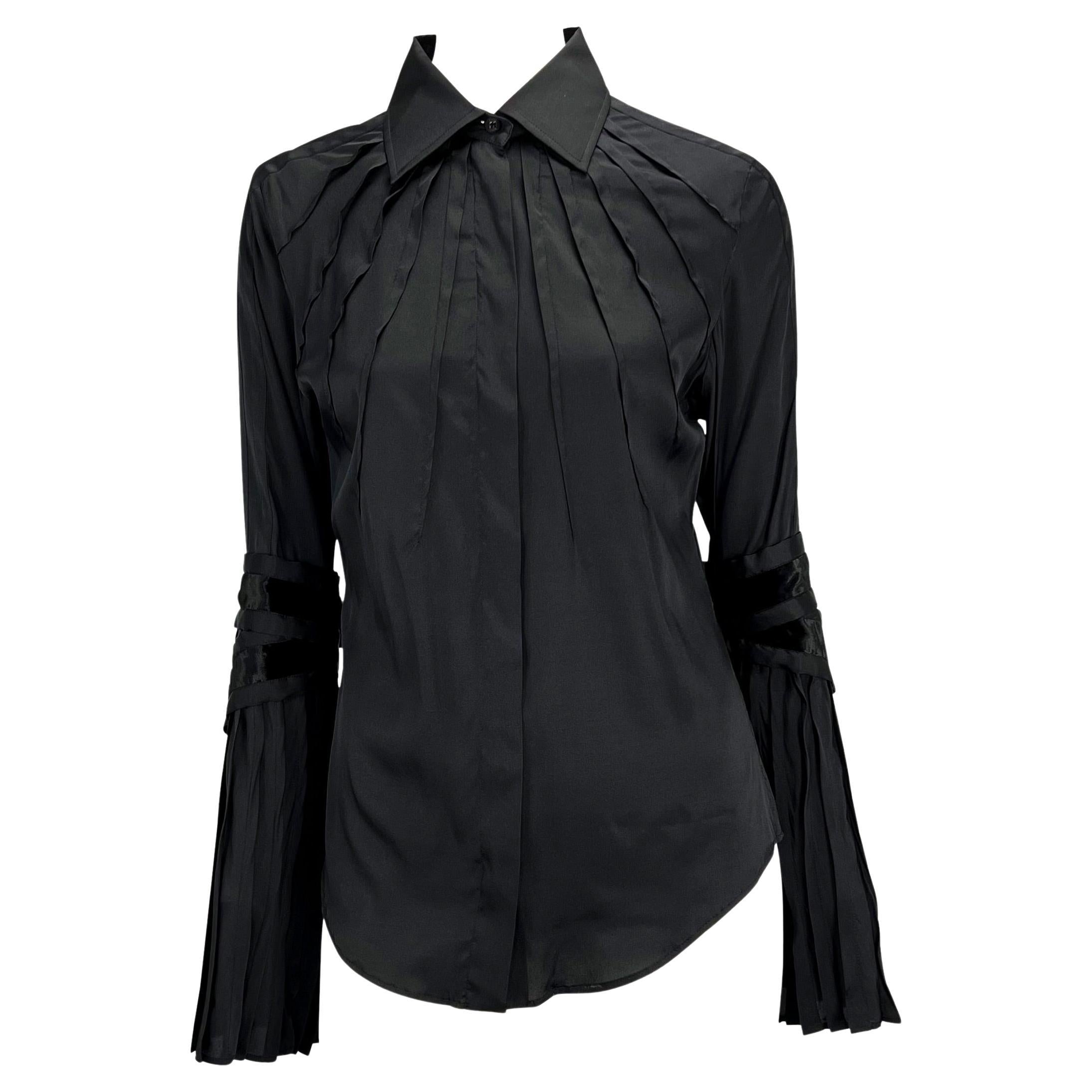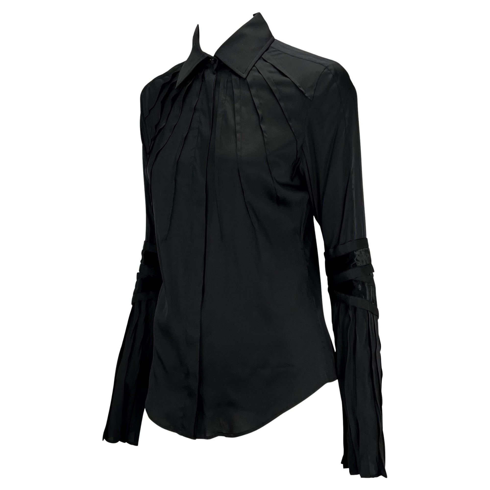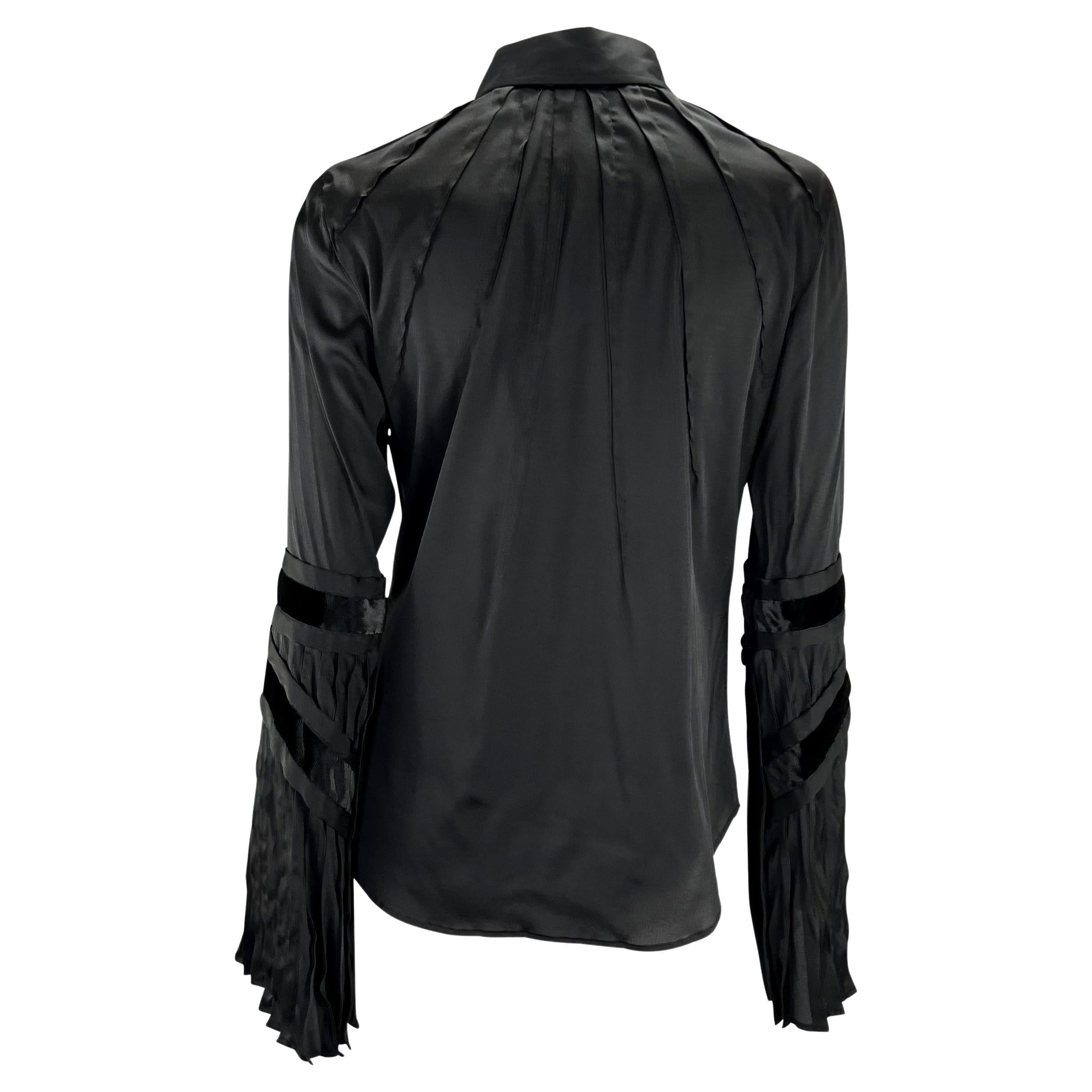 Presenting a black silk button-up Gucci shirt designed by Tom Ford. This incredible piece from the Fall/Winter 2004 collection is constructed of a silk-spandex blend and features pleats that jut from the neckline and elbow. The blouse is complete with black velvet ribbons that wrap part of the arms. From Ford's final collection with Gucci, this piece can be worn day or night!