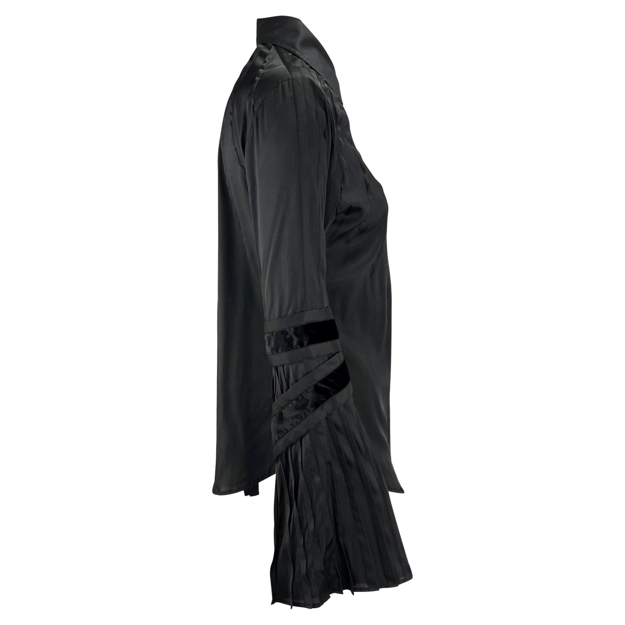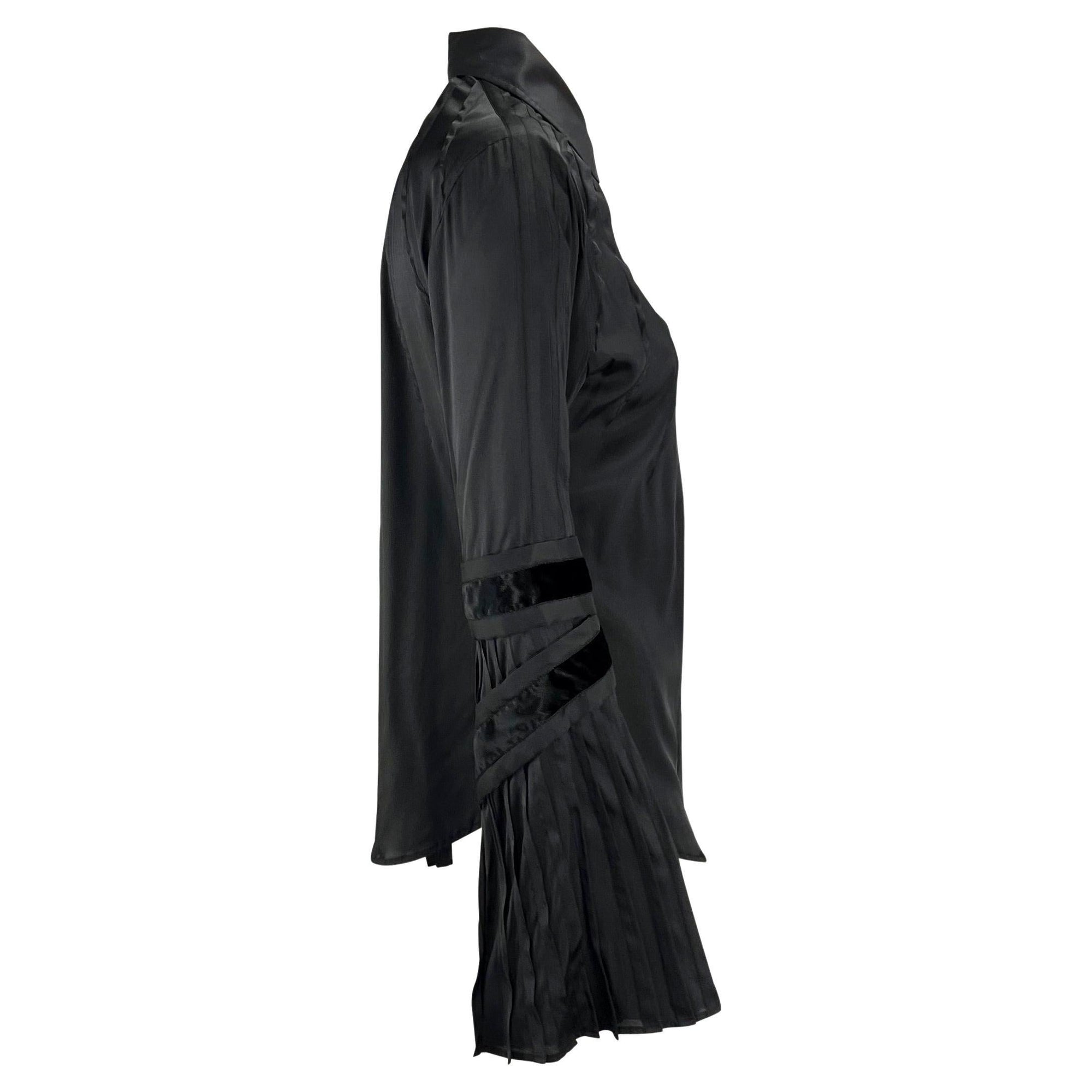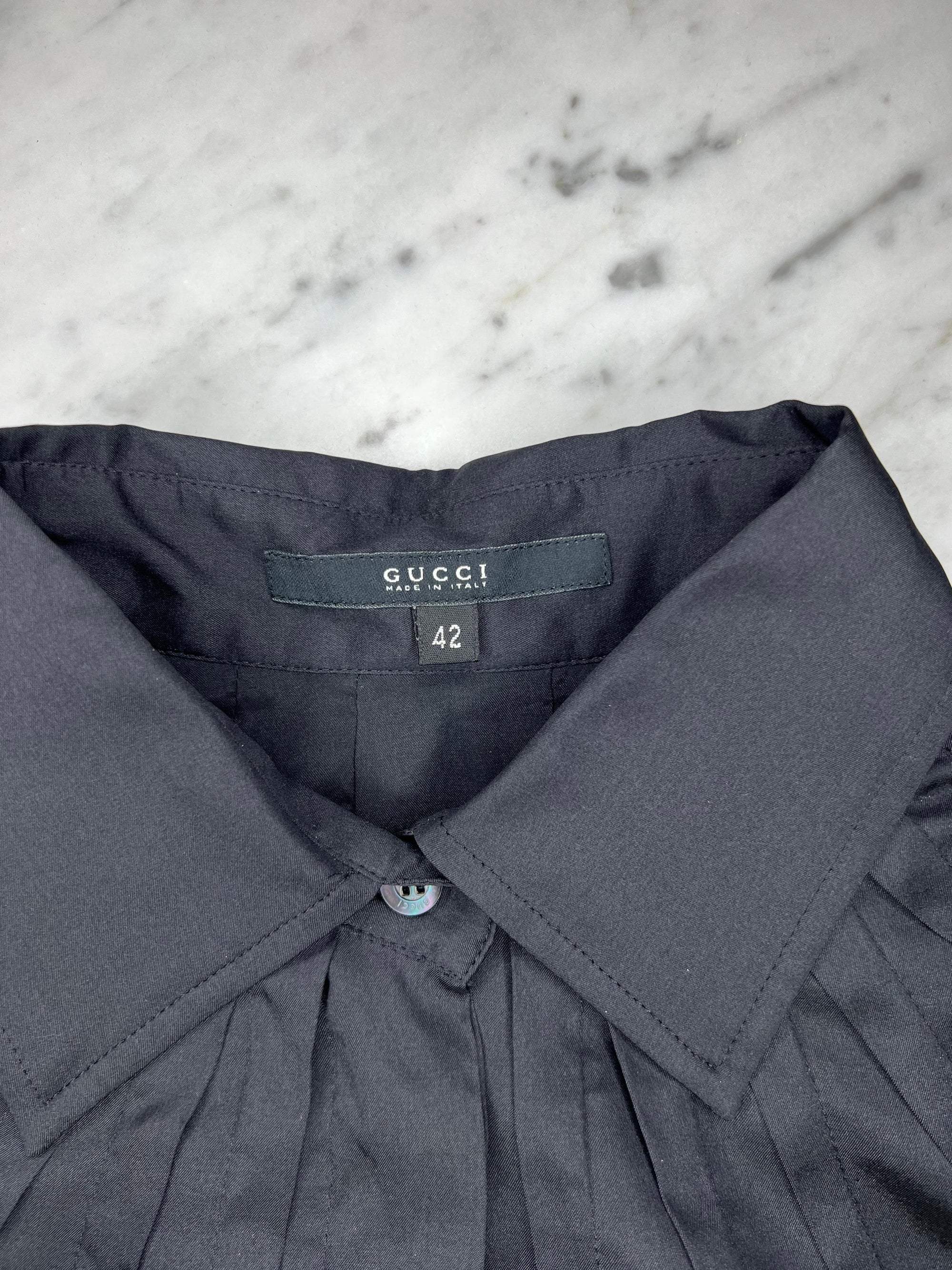 Presenting a black silk button-up Gucci shirt designed by Tom Ford. This incredible piece from the Fall/Winter 2004 collection is constructed of a silk-spandex blend and features pleats that jut from the neckline and elbow. The blouse is complete with black velvet ribbons that wrap part of the arms. From Ford's final collection with Gucci, this piece can be worn day or night!