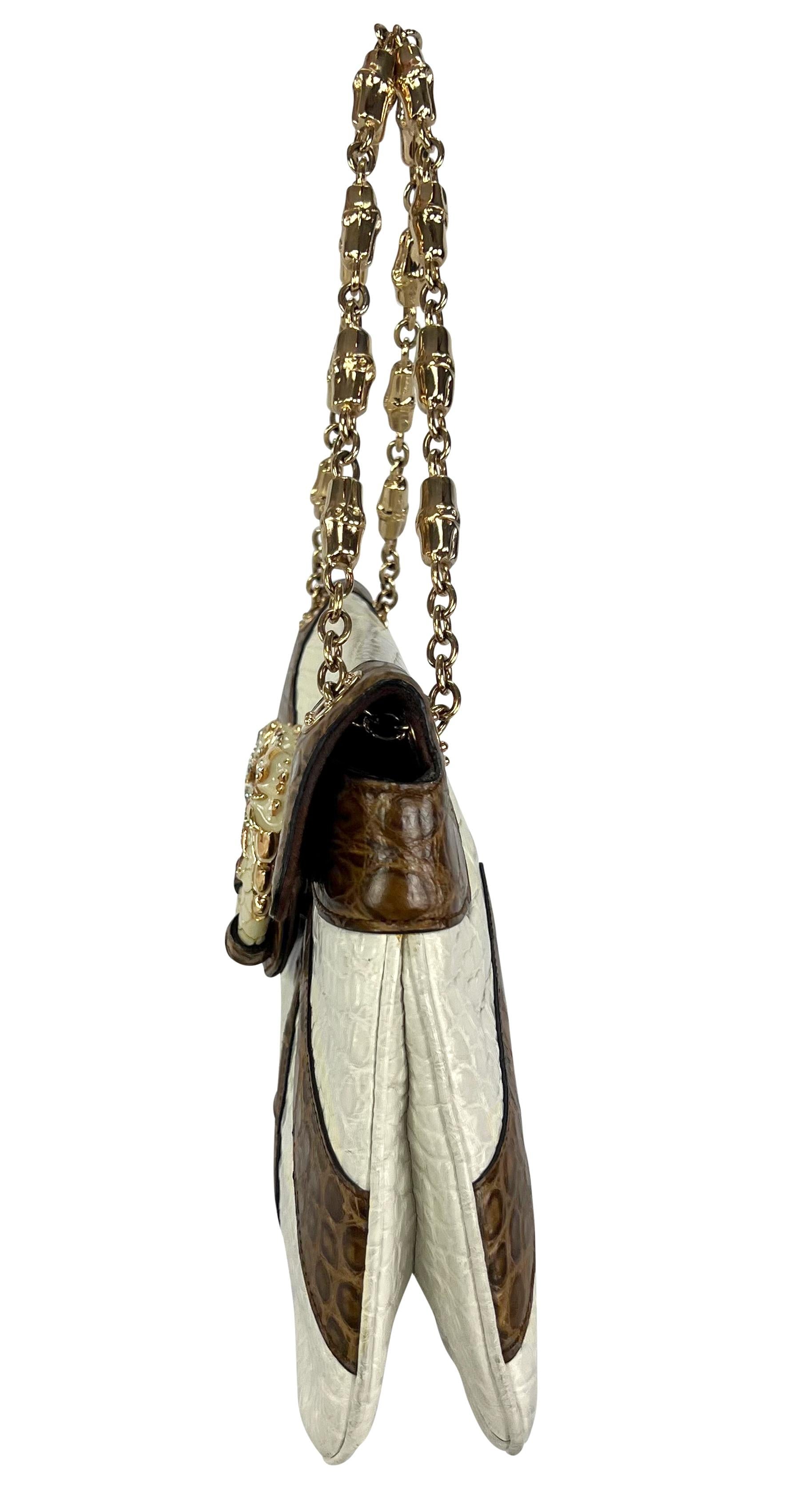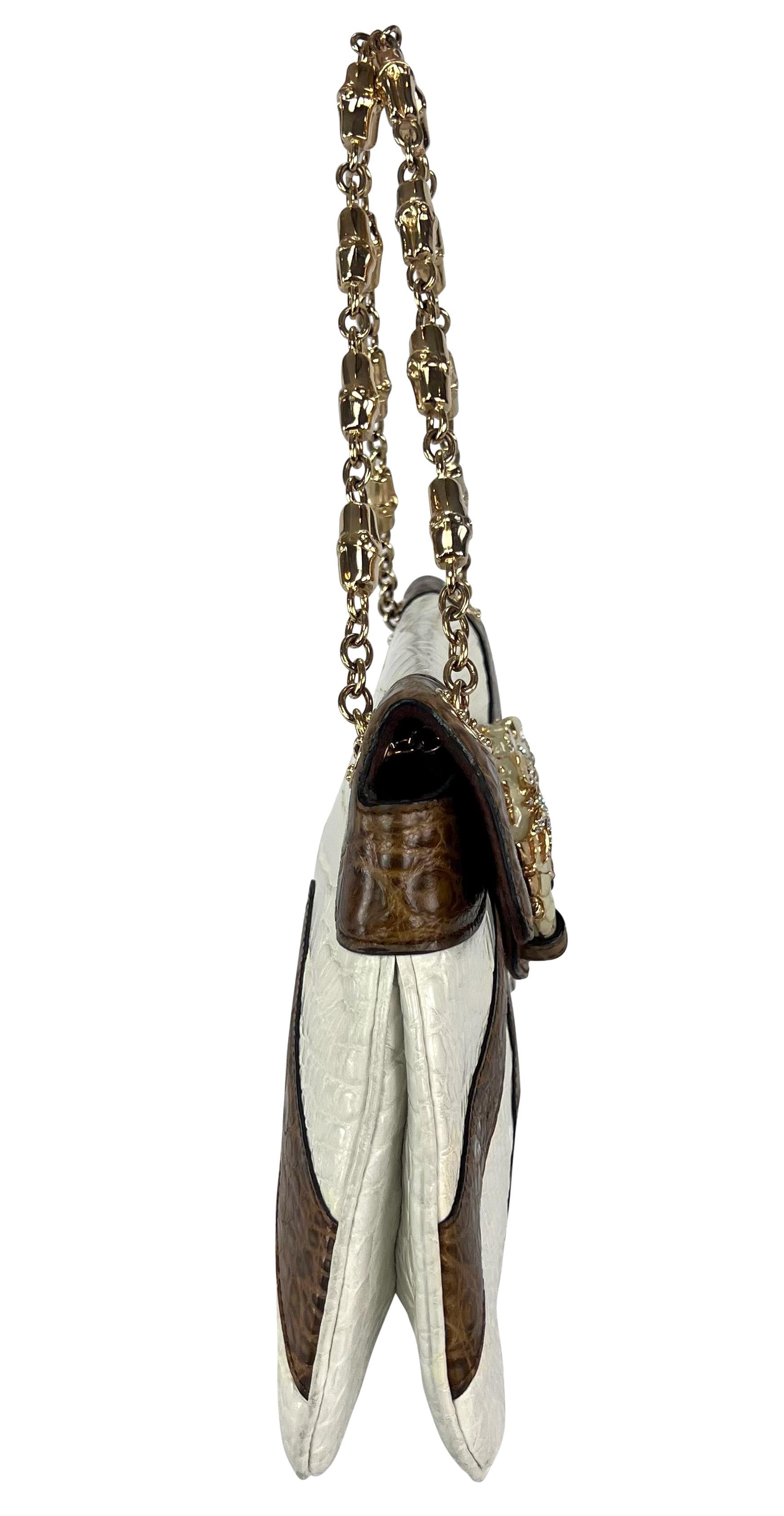Designed by Tom Ford for his final collection as Gucci's creative director, this white and brown two-tone crocodile bag from the Fall/Winter 2004 collection is an ultra-luxurious must-have. Making its debut in multiple variations on the season's runway, the python version was highlighted in the season's ad campaign on Daria Werbowy, shot by Mario Testino. This incredible bag is constructed entirely of off-white and brown genuine crocodile leather and is completed with a gold and white enamel dual dragon head closure and a gold bamboo link chain. This rare colorway is seldom seen, making this a must-have for any Gucci by Tom Ford lover.