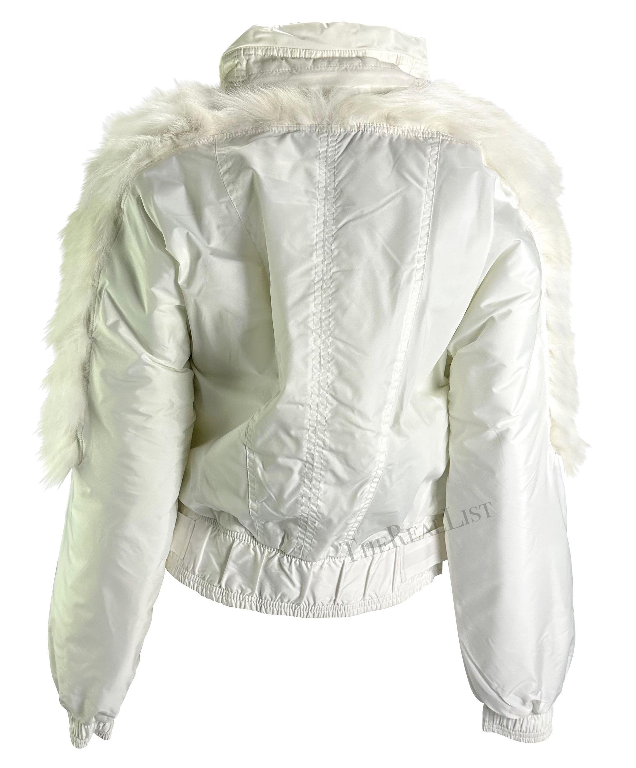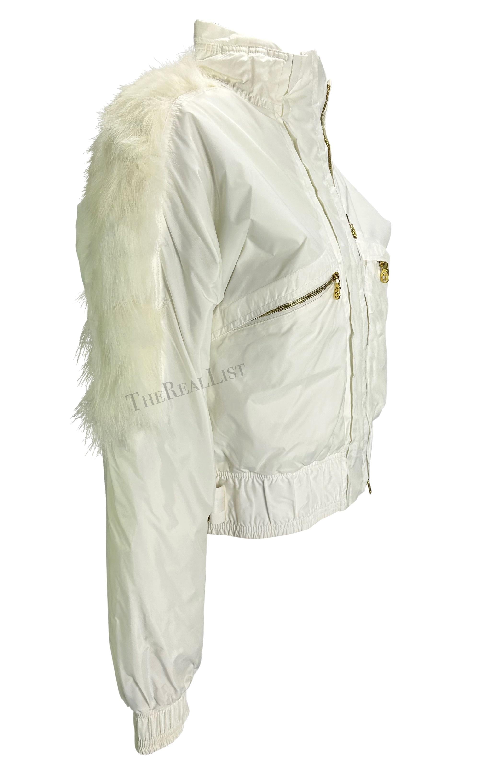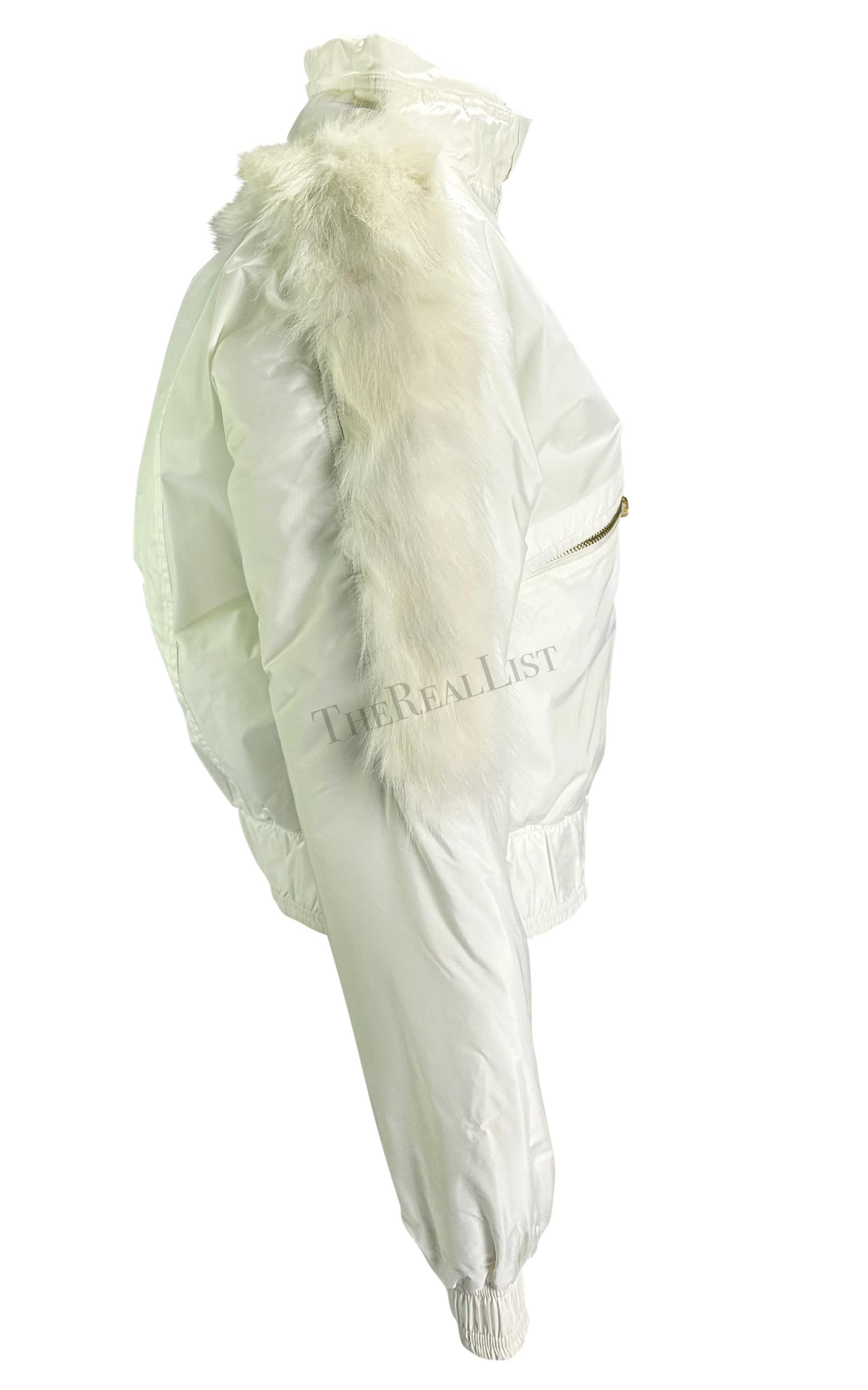Presenting a beautiful white Gucci puffer jacket designed by Tom Ford. This winter jacket from the Fall/Winter 2004 collection features a fur trim, embroidered Gucci logo, gold-tone GG hardware, and a hidden hood. A rare piece from Ford's last collection at Gucci, this jacket is a cold-weather essential.
