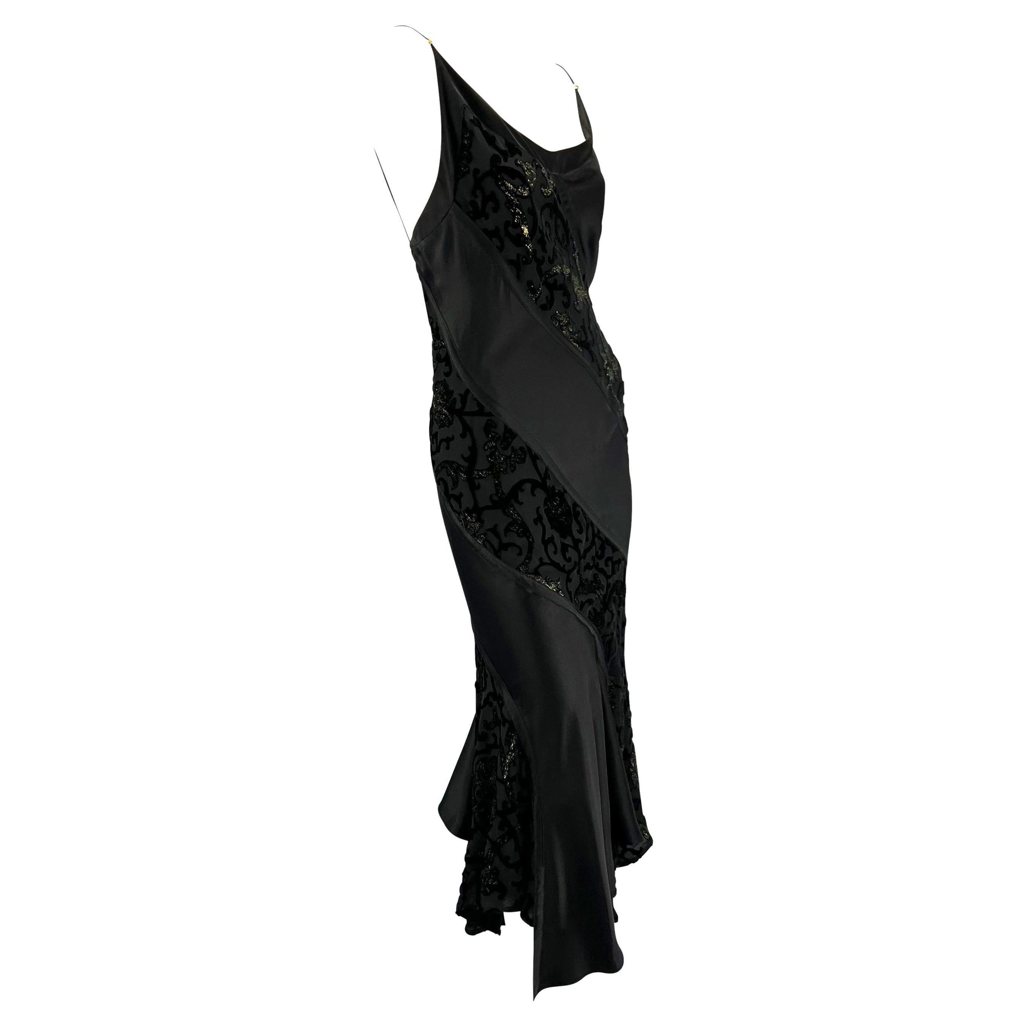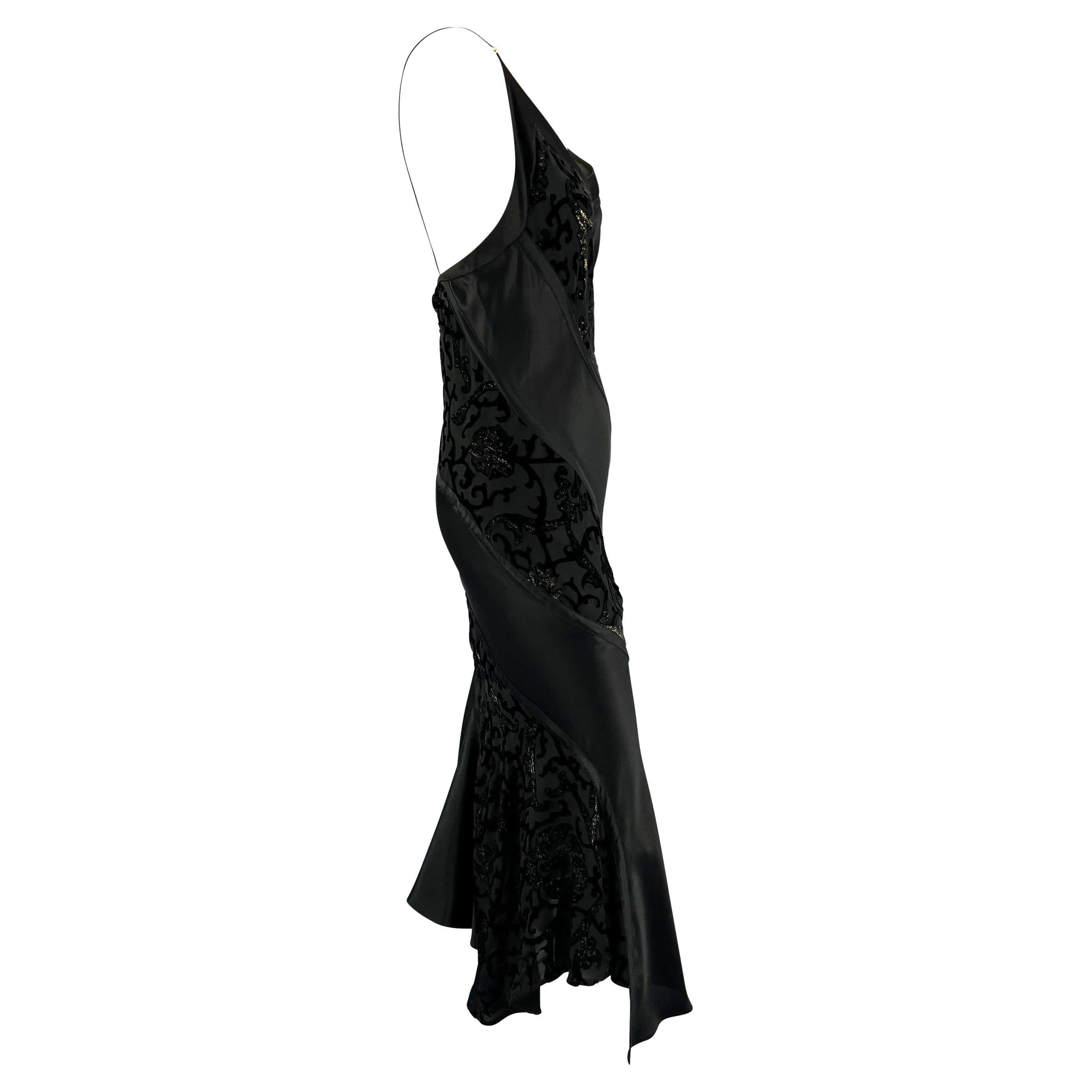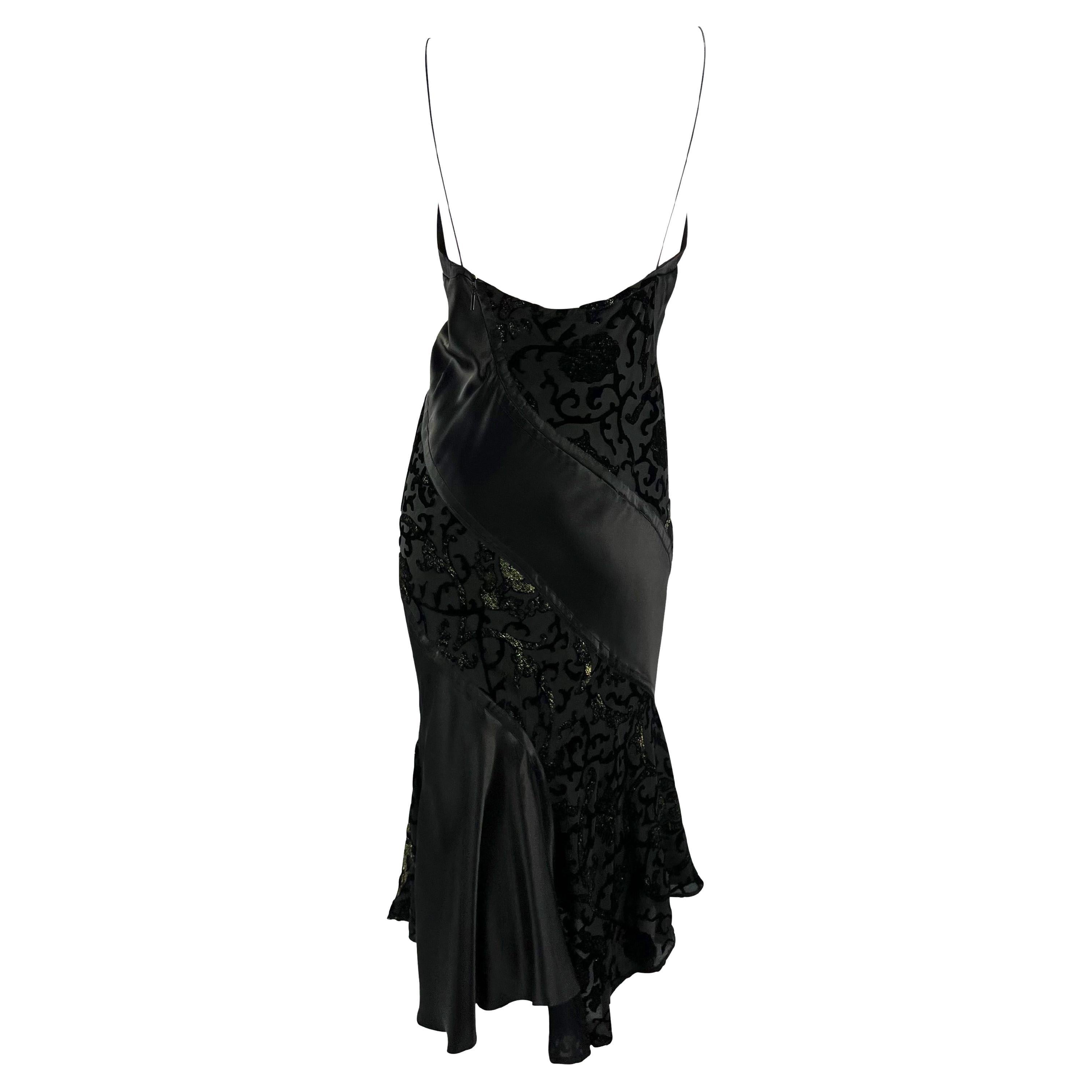 F/W 2004 Roberto Cavalli Black Velvet Satin Panel Flare Slip Dress