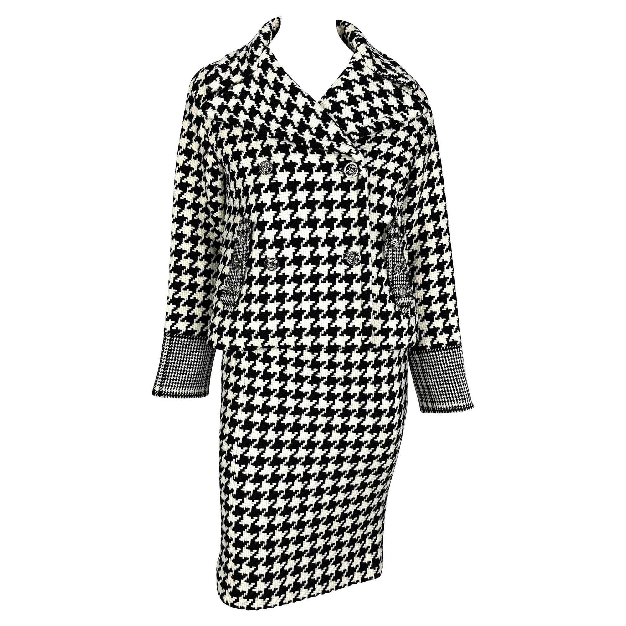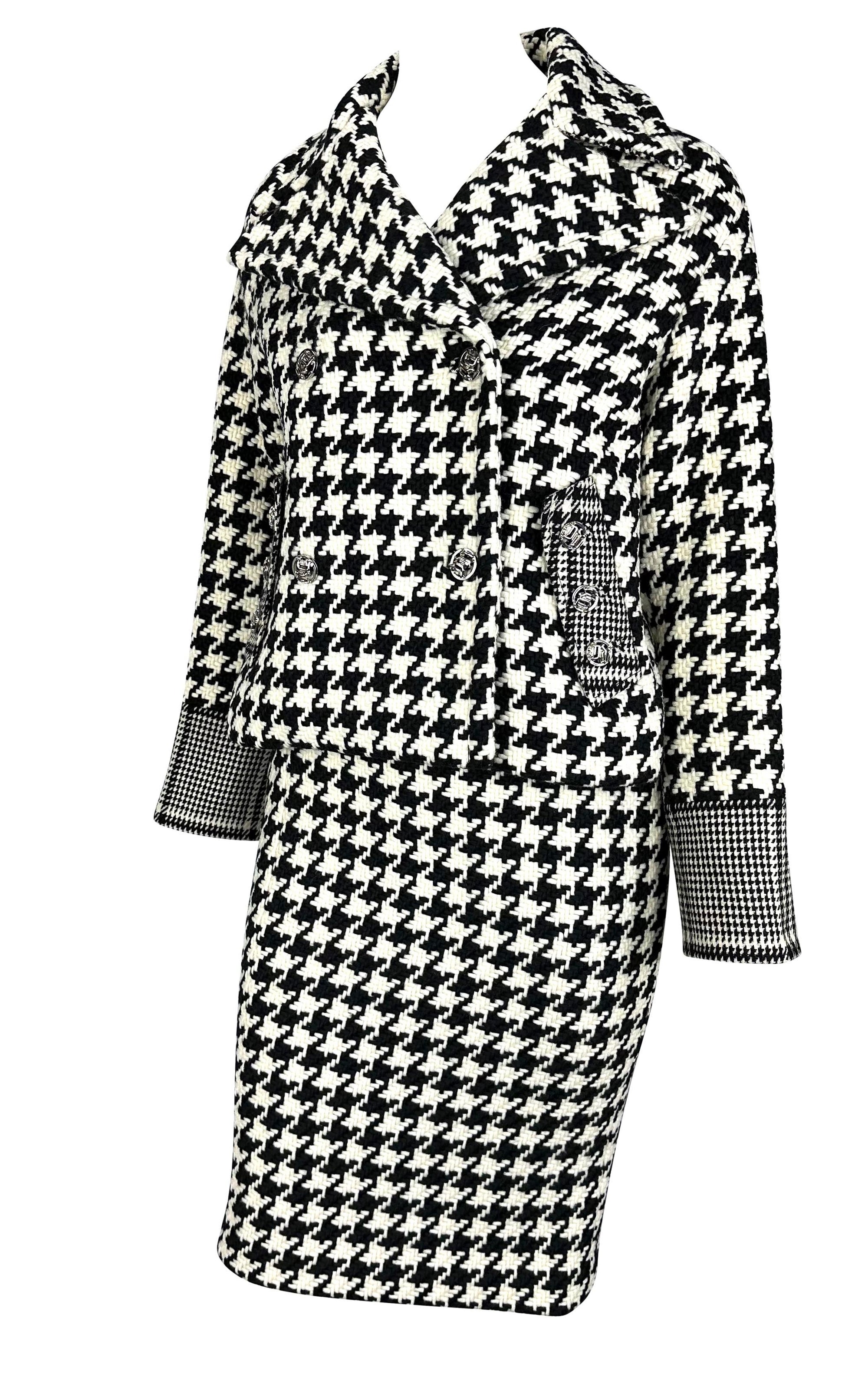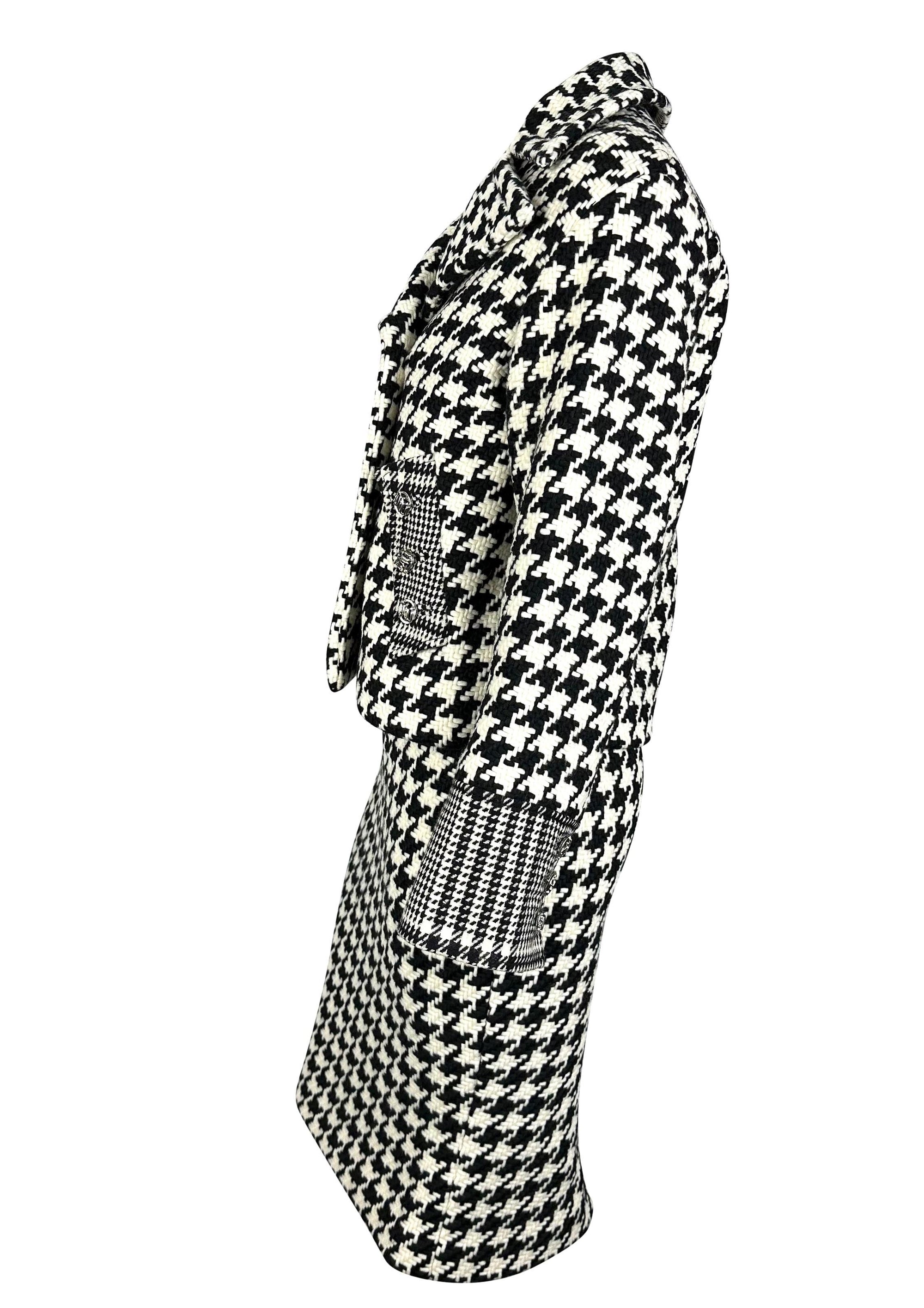 Presenting an incredible black and white Versace houndstooth tweed skirt set designed by Donatella Versace. From the Fall/Winter 2004 collection, this set debuted on the season's runway as part of Look 13, modeled by Erin Wasson. This fabulous set is made up of a double-breasted jacket and matching skirt. This set is complete with silver-tone 'DV' monogram buttons and constructed of thick tweed.