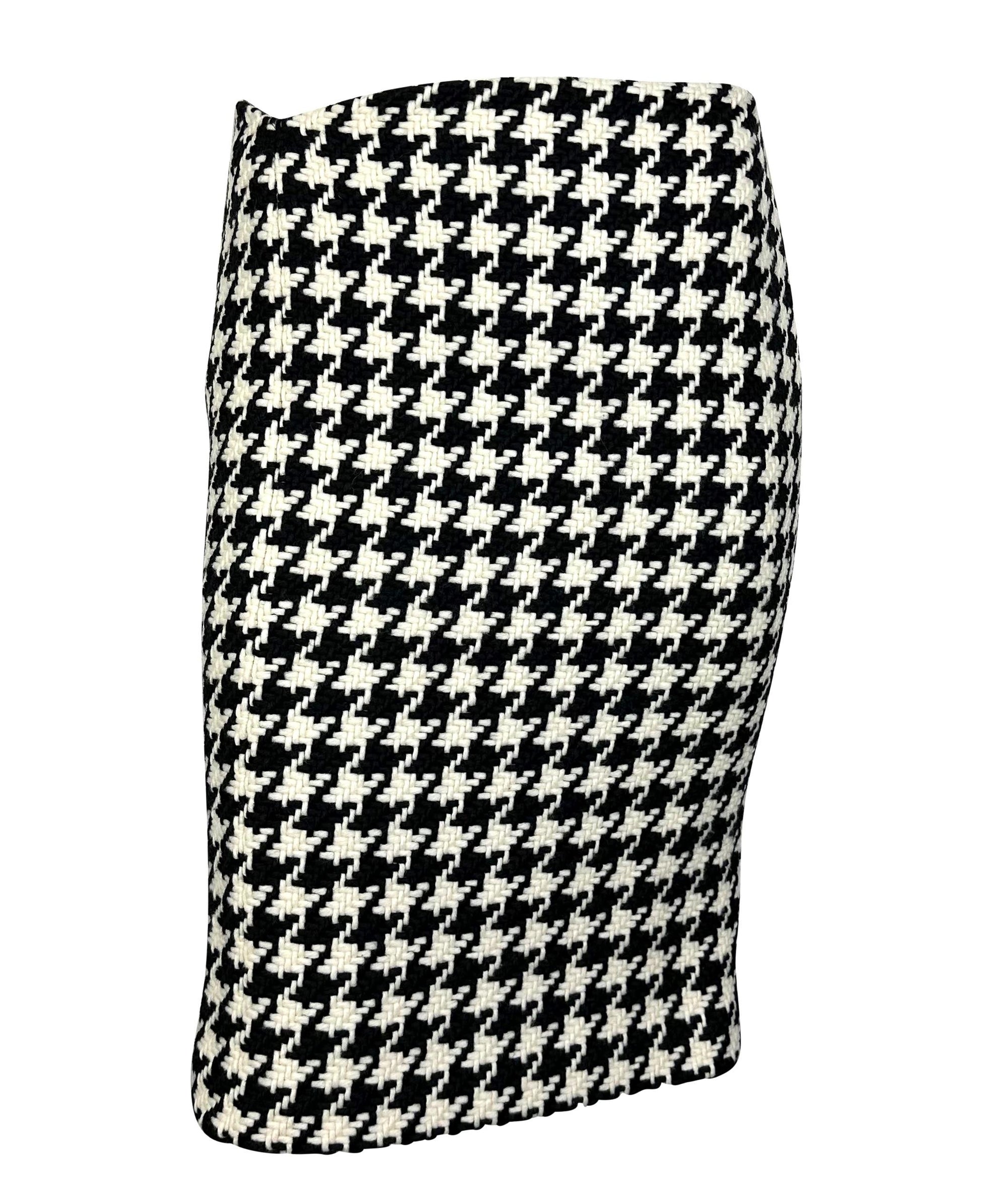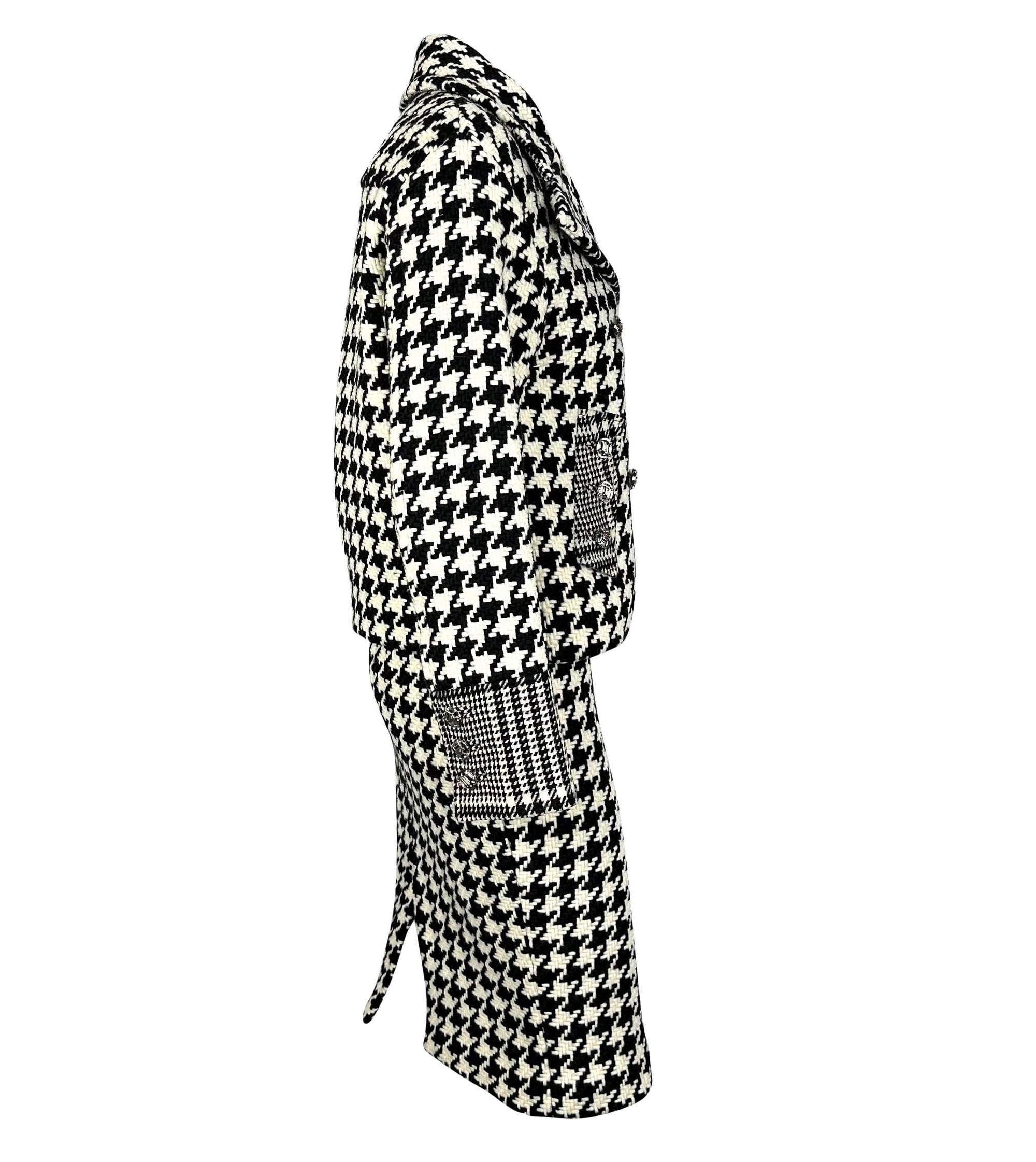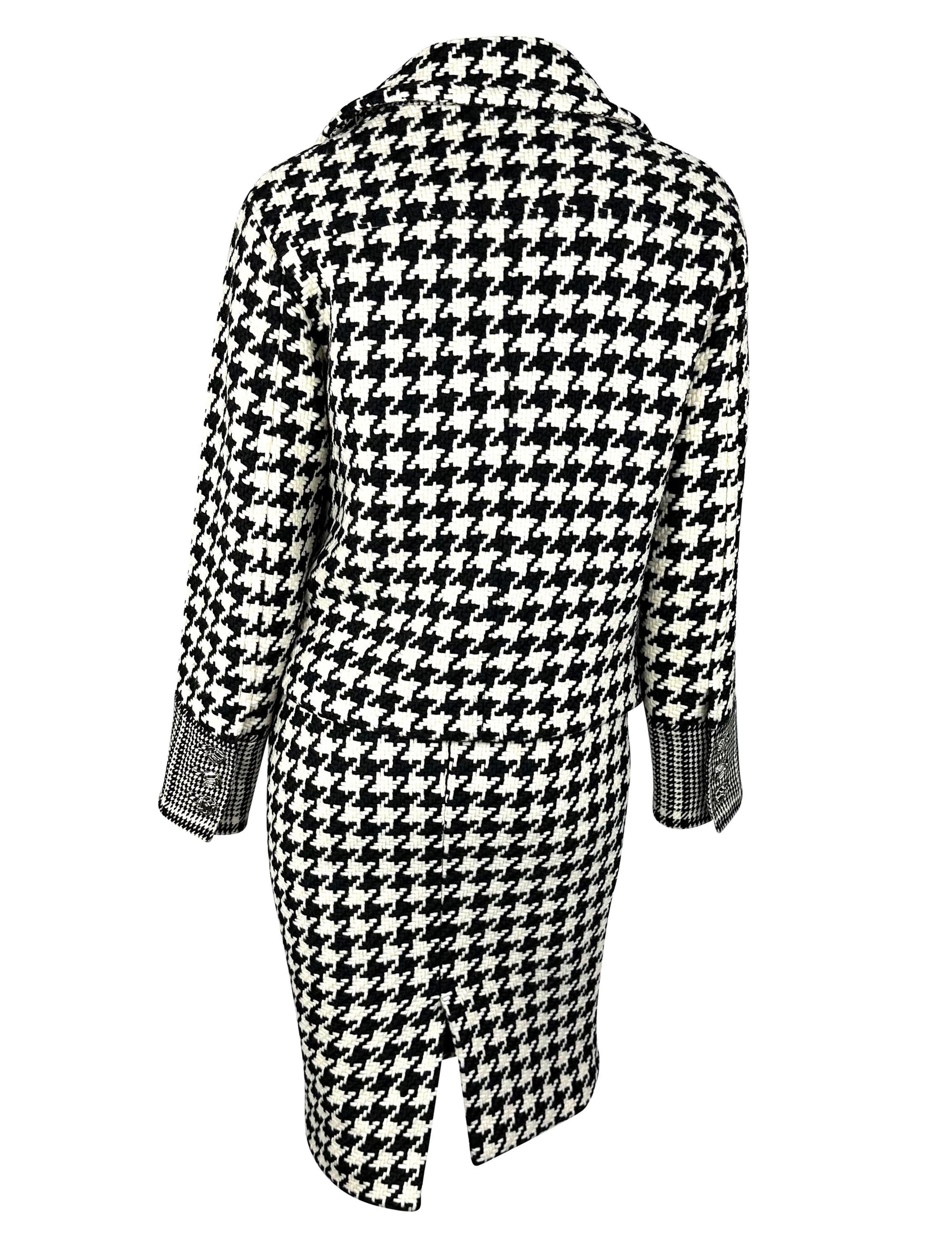 Presenting an incredible black and white Versace houndstooth tweed skirt set designed by Donatella Versace. From the Fall/Winter 2004 collection, this set debuted on the season's runway as part of Look 13, modeled by Erin Wasson. This fabulous set is made up of a double-breasted jacket and matching skirt. This set is complete with silver-tone 'DV' monogram buttons and constructed of thick tweed.
