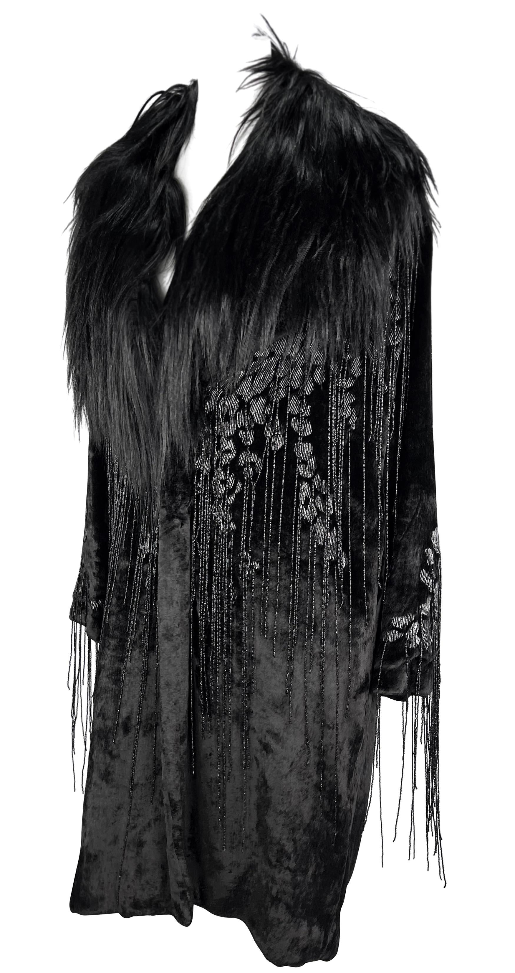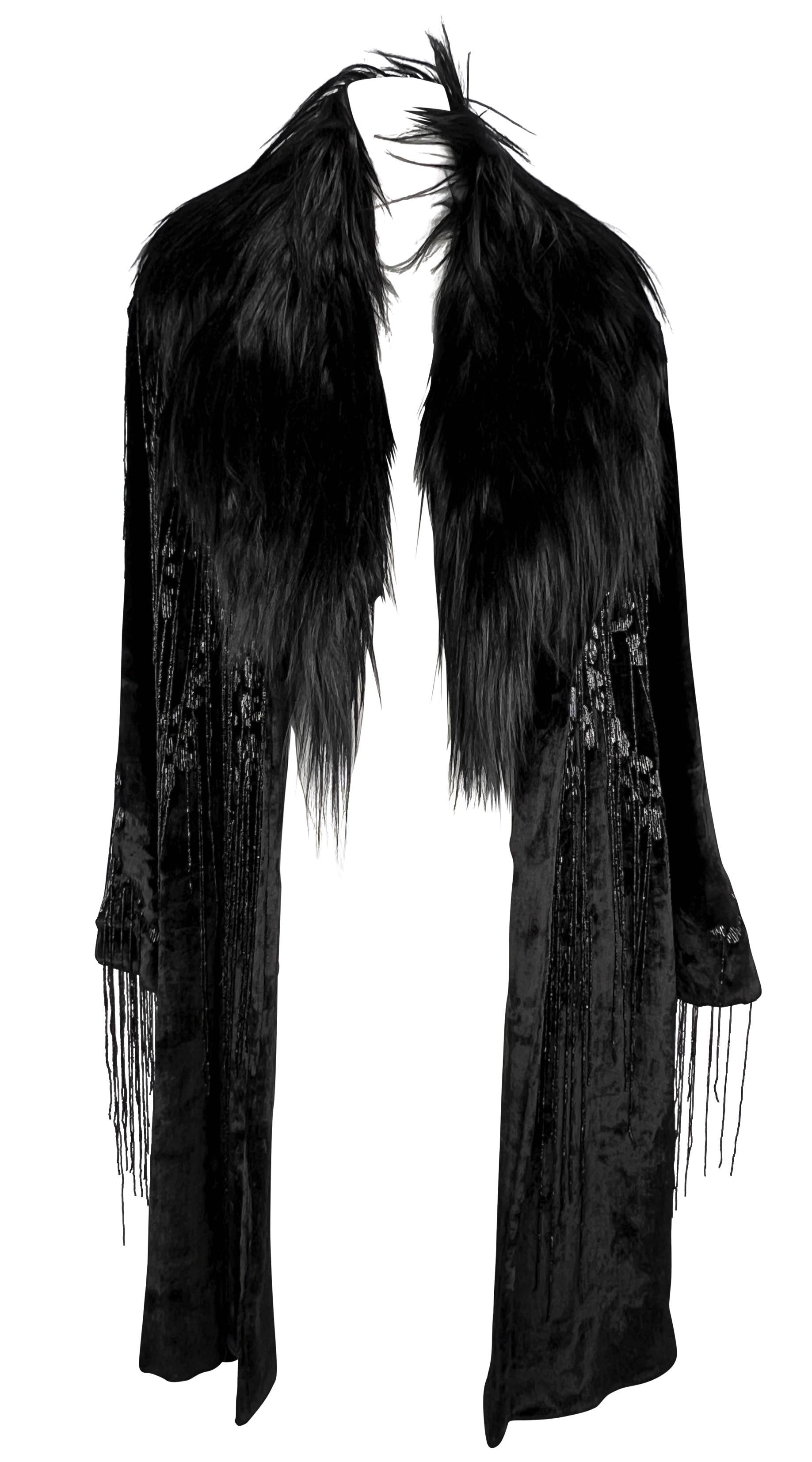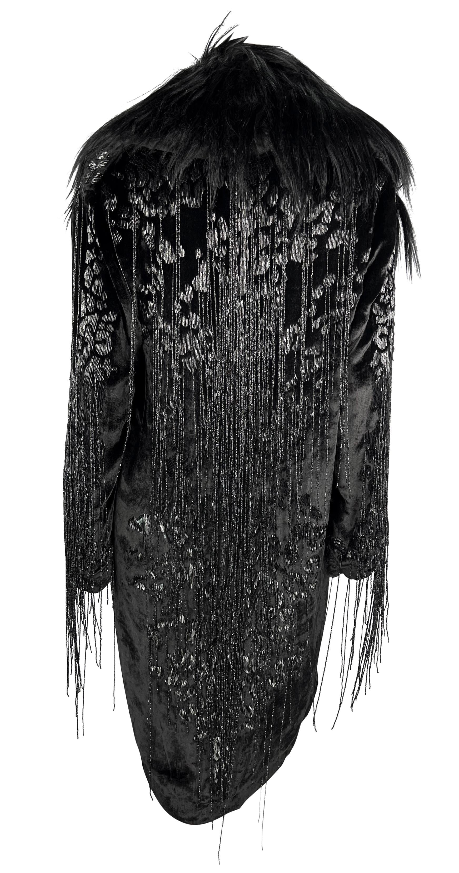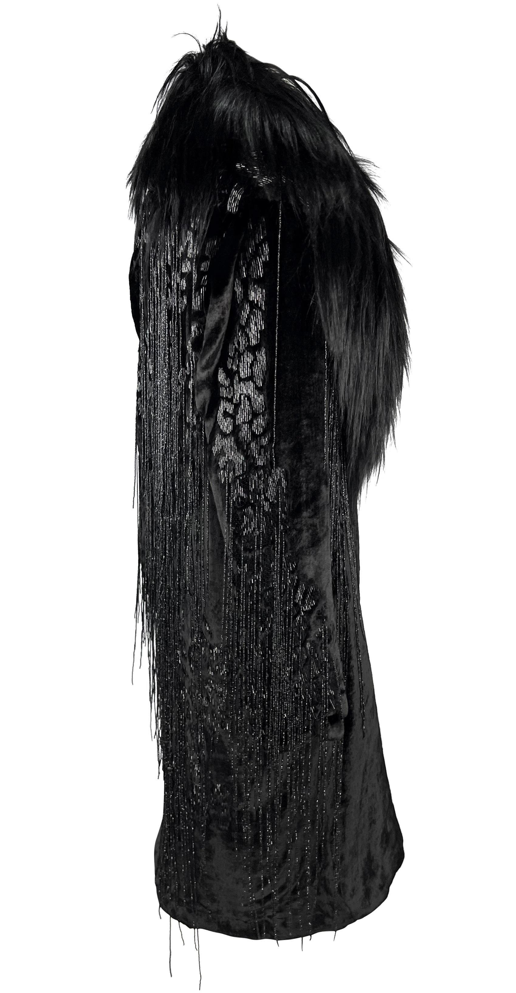 From the Fall/Winter 2004 collection, this truly fabulous black velvet Versace coat was designed by Donatella Versace. Debuting on the season's runway as part of look 41, modeled by Leticia Birkheuer, this knee-length coat is constructed of crushed black velvet with a removable thick black fur lapel. This coat is made complete with a hand-beaded leopard pattern and dripping black beaded fringe throughout. Fit for a rock star, this heavy coat is a rare find and is sure to be a coveted addition to any Versace lover's wardrobe.