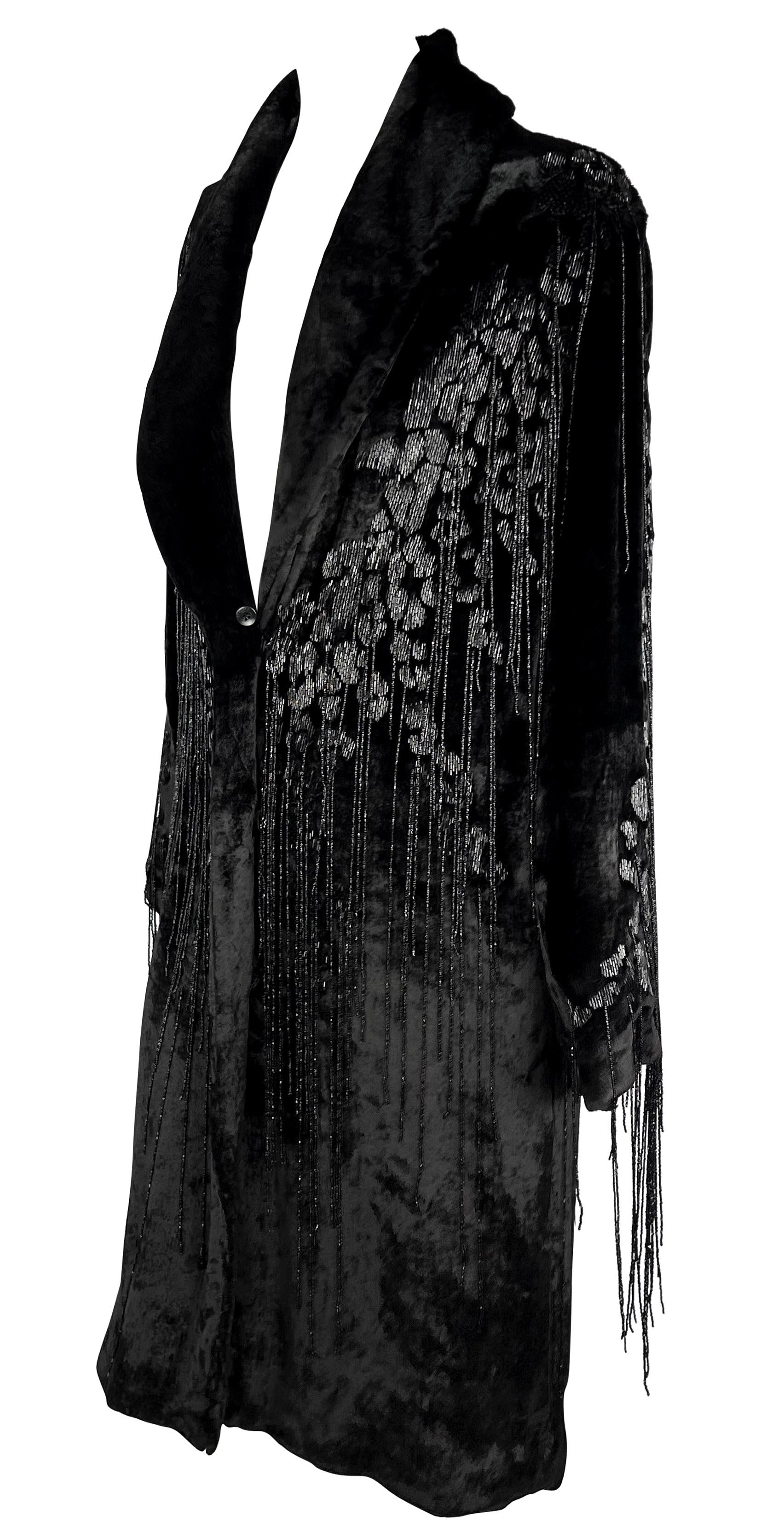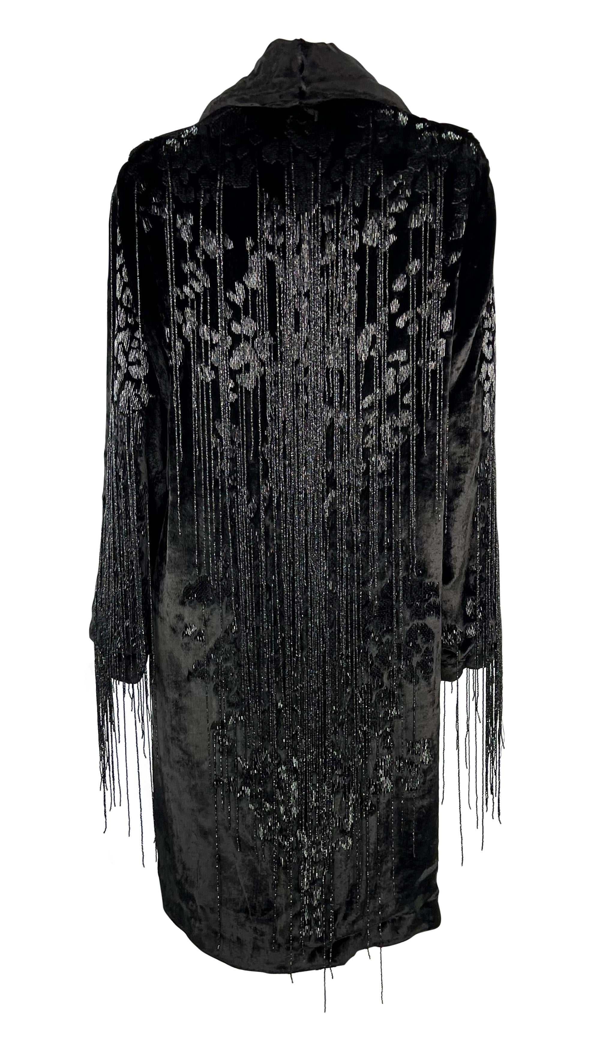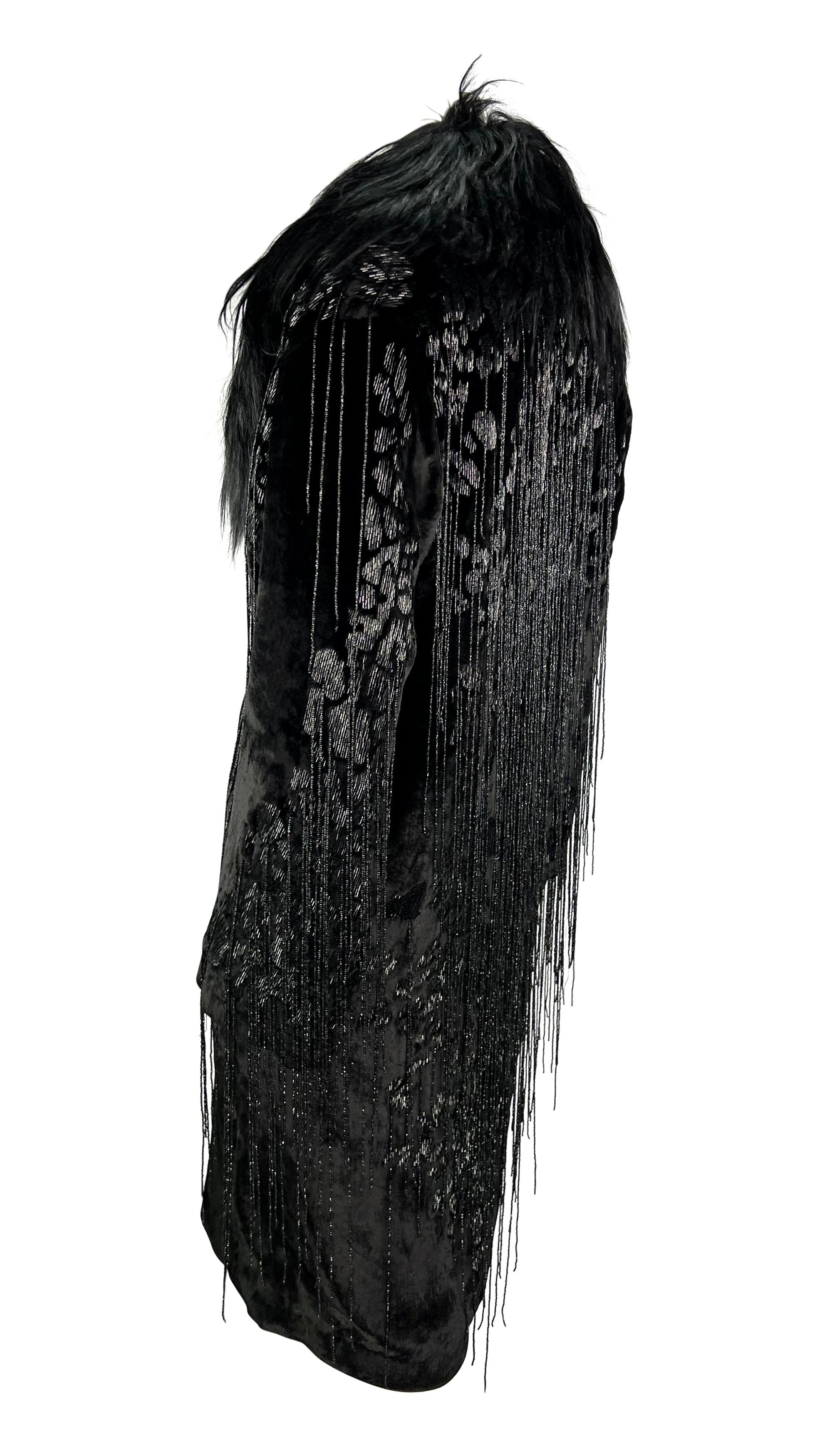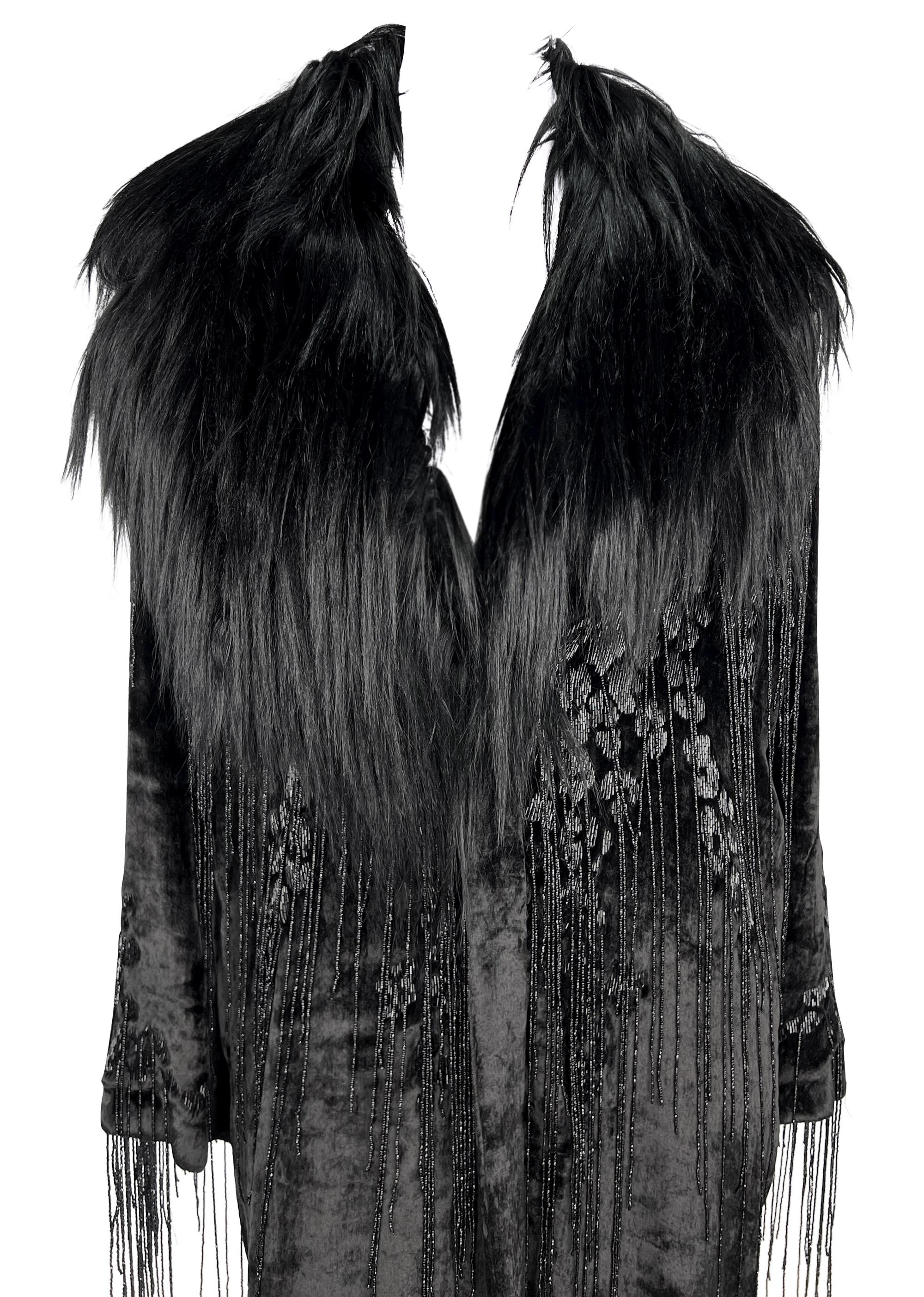 From the Fall/Winter 2004 collection, this truly fabulous black velvet Versace coat was designed by Donatella Versace. Debuting on the season's runway as part of look 41, modeled by Leticia Birkheuer, this knee-length coat is constructed of crushed black velvet with a removable thick black fur lapel. This coat is made complete with a hand-beaded leopard pattern and dripping black beaded fringe throughout. Fit for a rock star, this heavy coat is a rare find and is sure to be a coveted addition to any Versace lover's wardrobe.