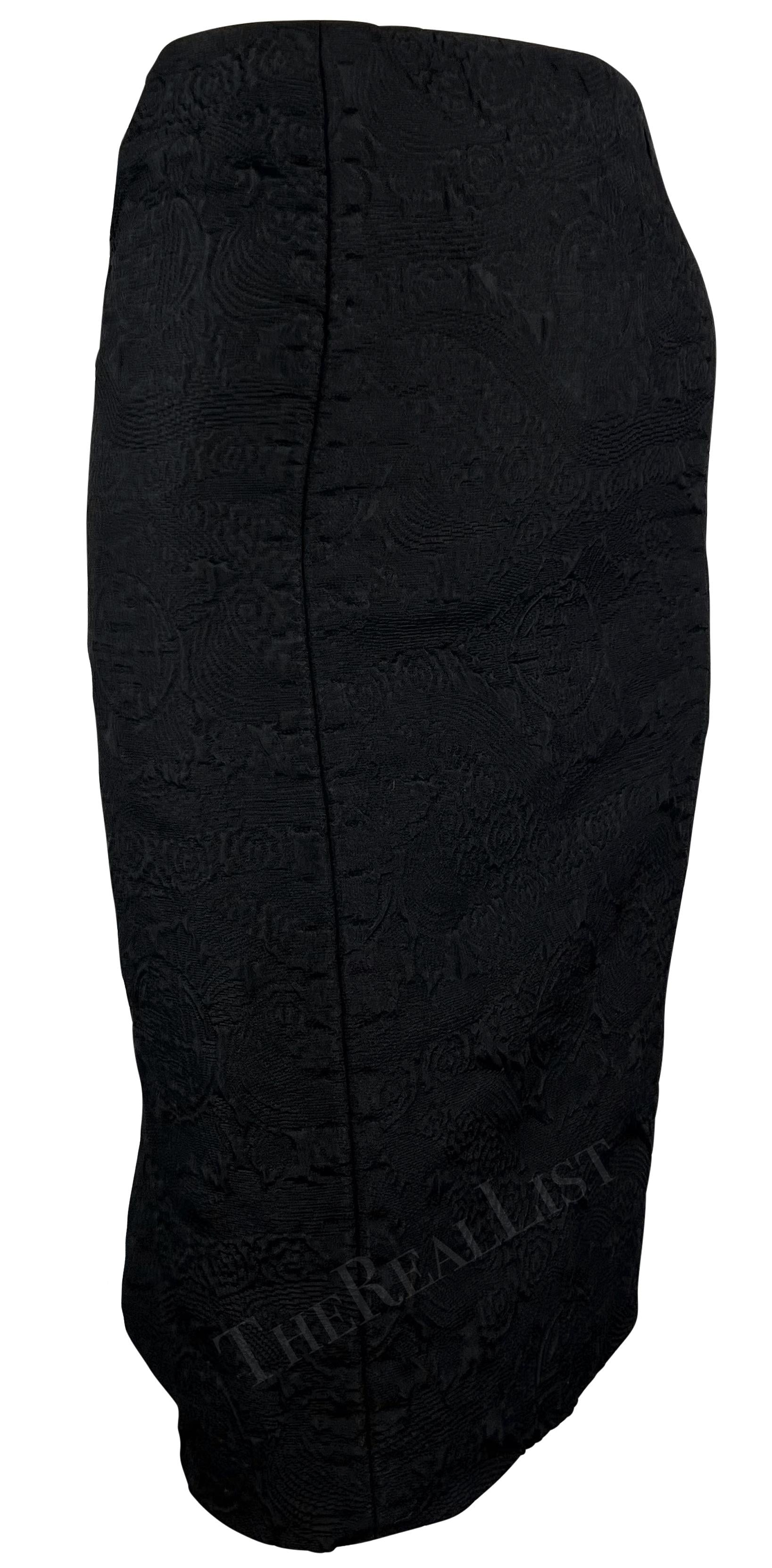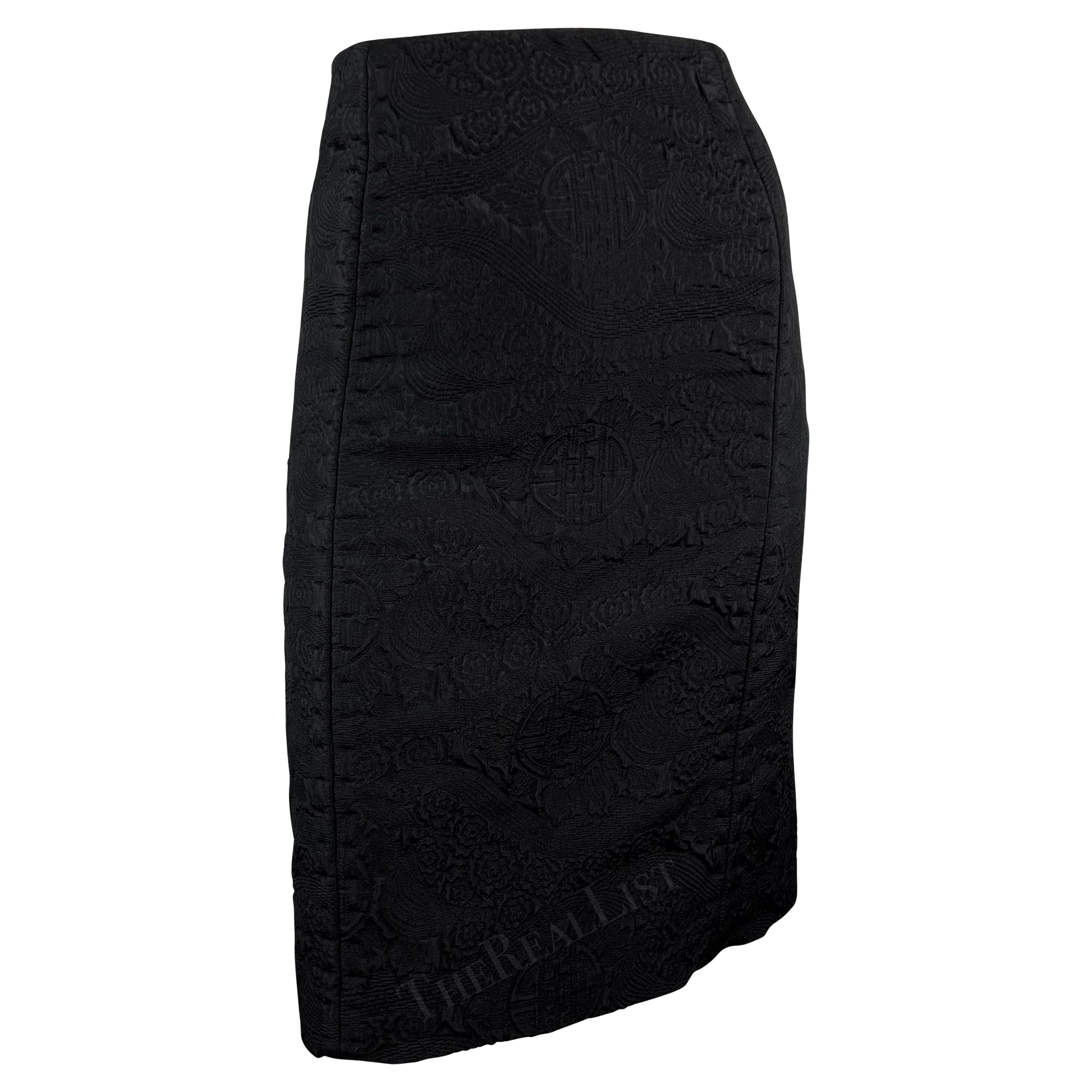 This sophisticated black chinoiserie textured pencil skirt by Yves Saint Laurent, was designed by Tom Ford for the Fall/Winter 2004 collection, marking Ford's final season at YSL. This high-waisted skirt showcases a woven chinoiserie pattern and includes a subtle rear hem slit for added detail.