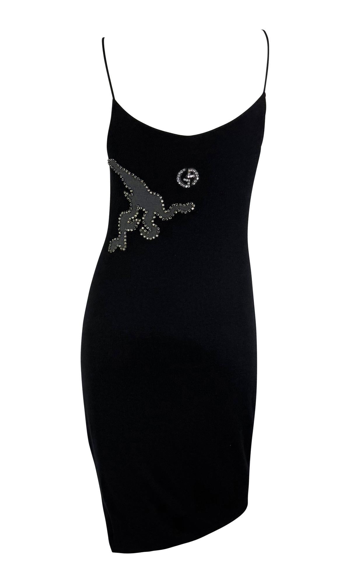 From Giorgio Armani’s Fall/Winter 2005 collection, this black knit cocktail dress features a fitted silhouette with thin straps and multicolor rhinestone embellishments forming hands, a flower, and a smoking cigarette motif. This striking design debuted on the season's runway.