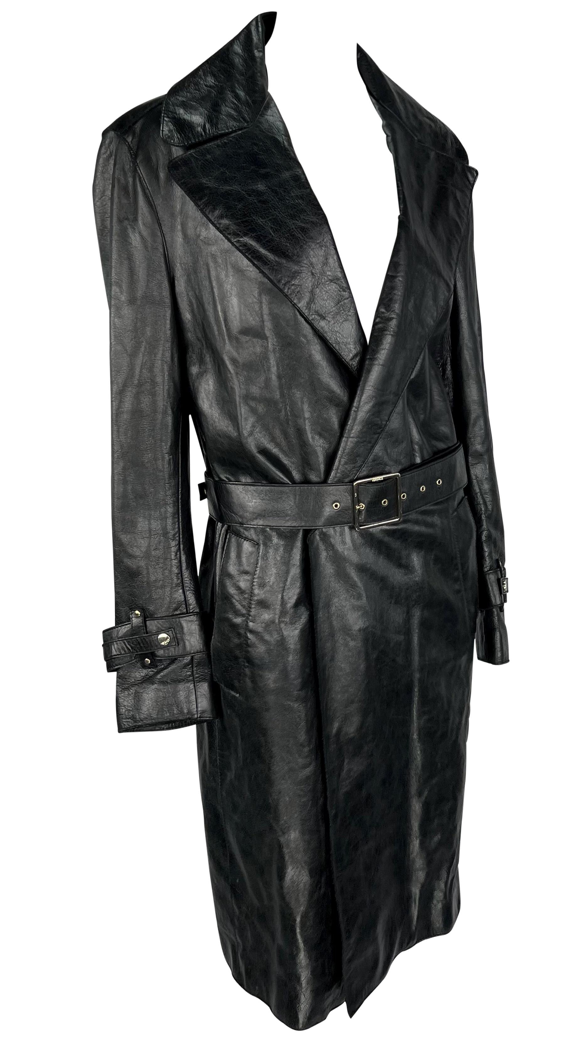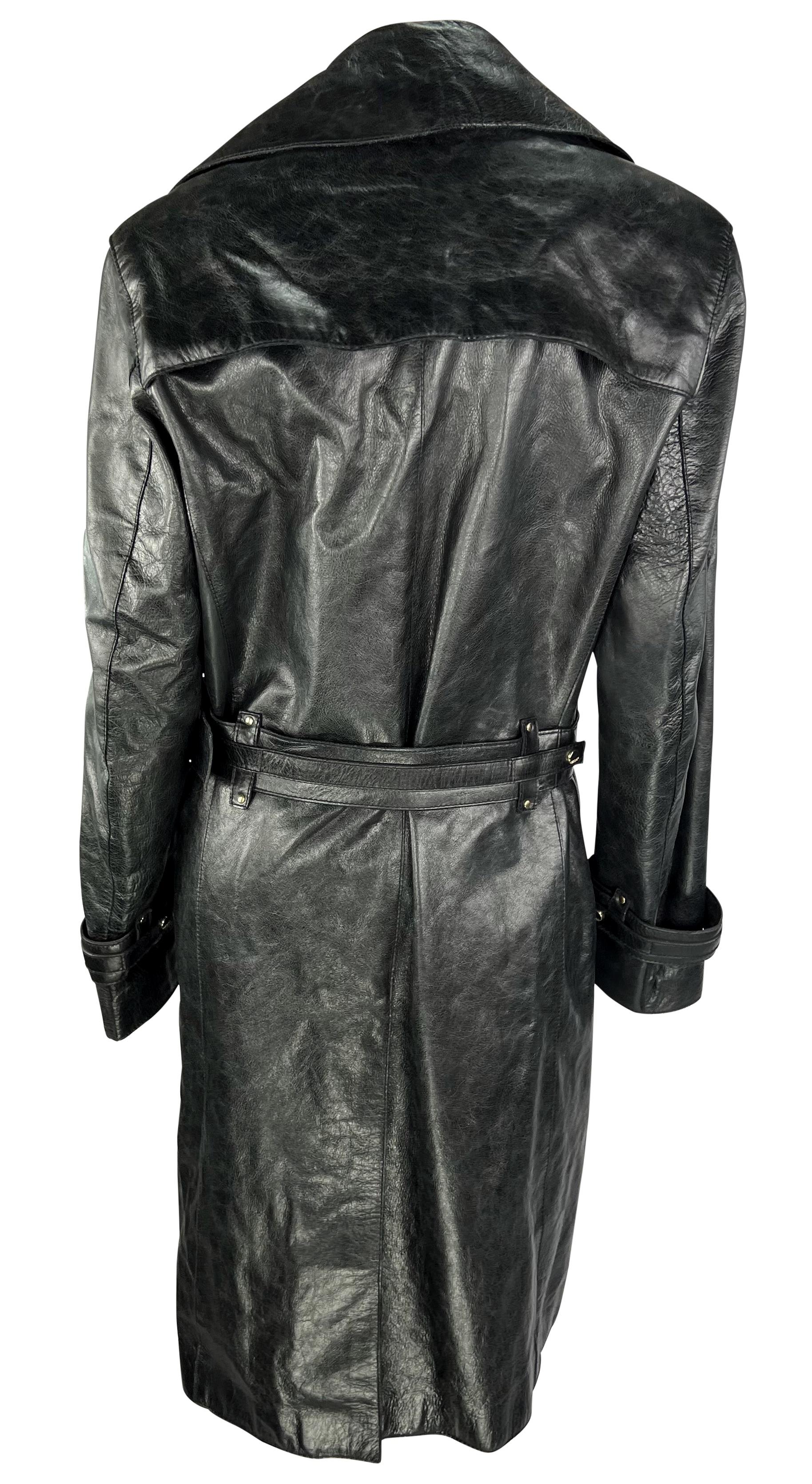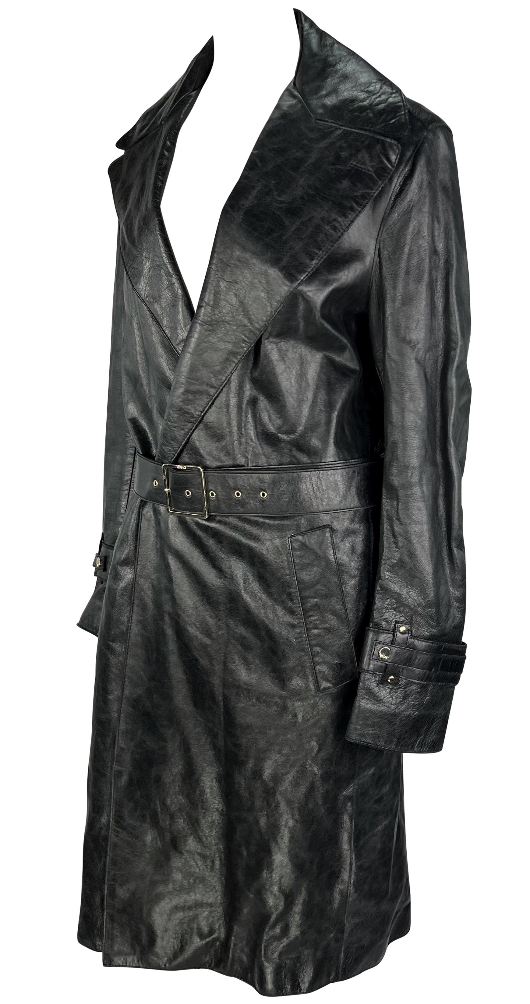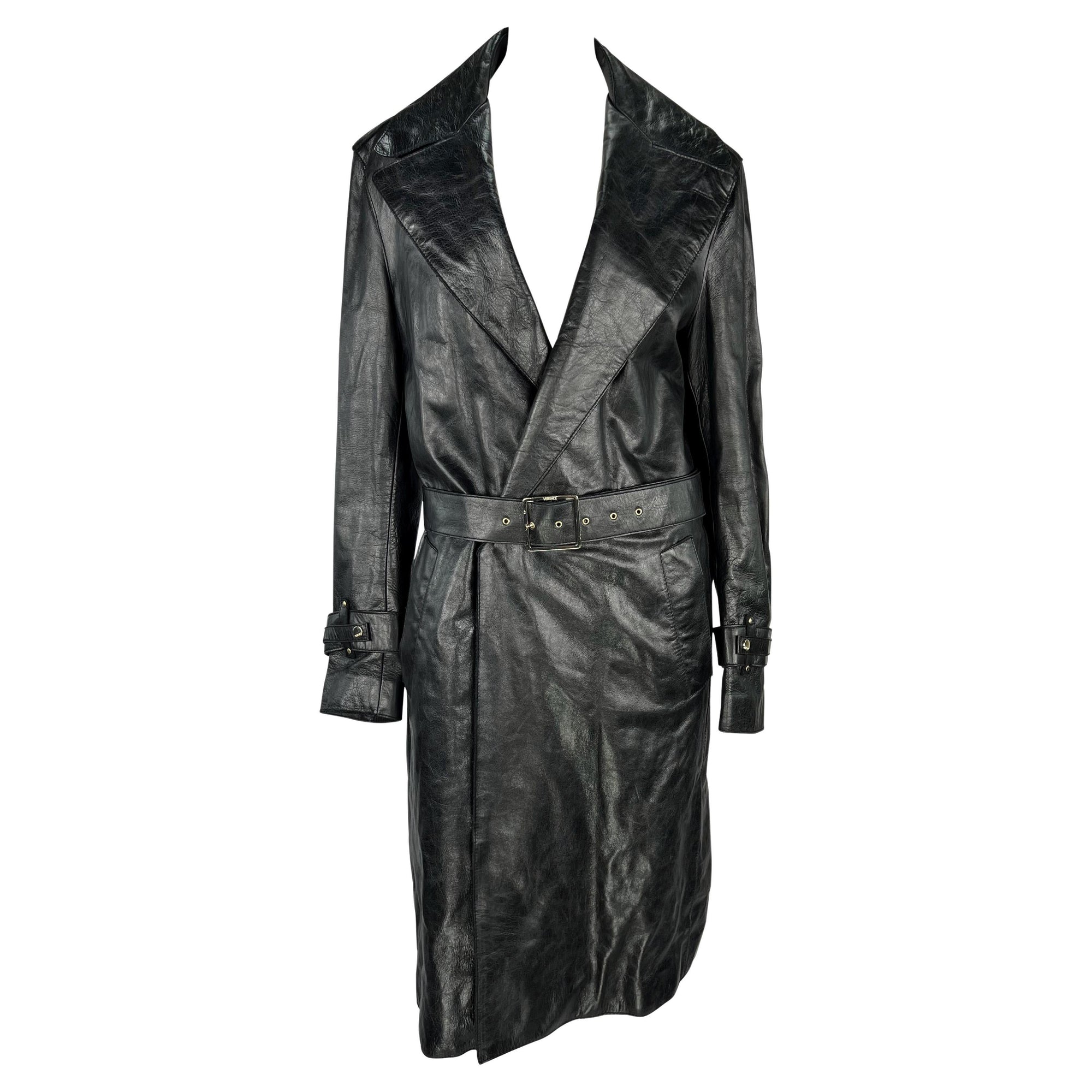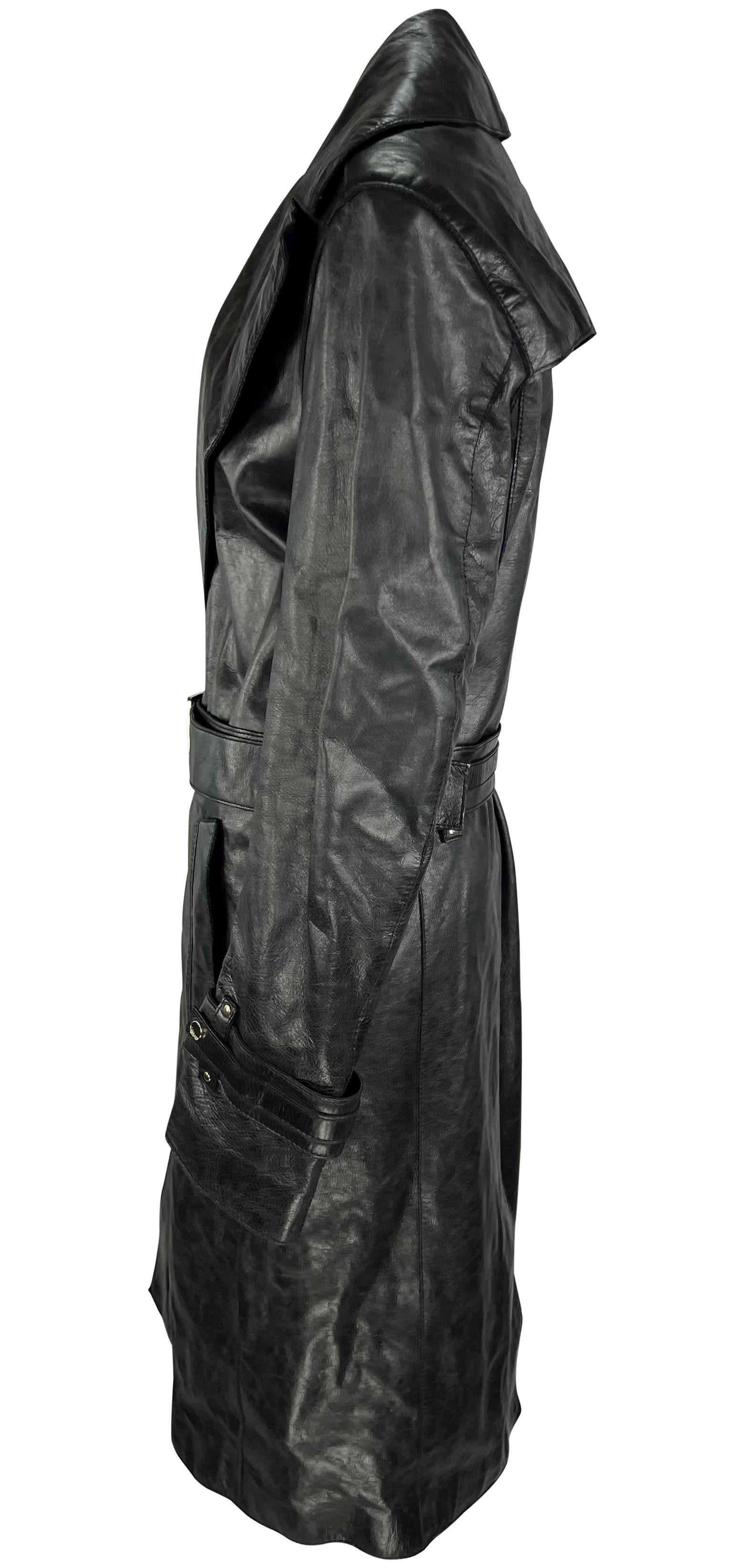 Designed by Donatella Versace for Versace's Fall/Winter 2005 men's collection, this coat debuted on the season's men's runway as part of look 5, modeled by Tyson Ballou. Constructed entirely of black leather, this sharp coat features a wide lapel, buckles at each wrist and is made complete with a matching belt.