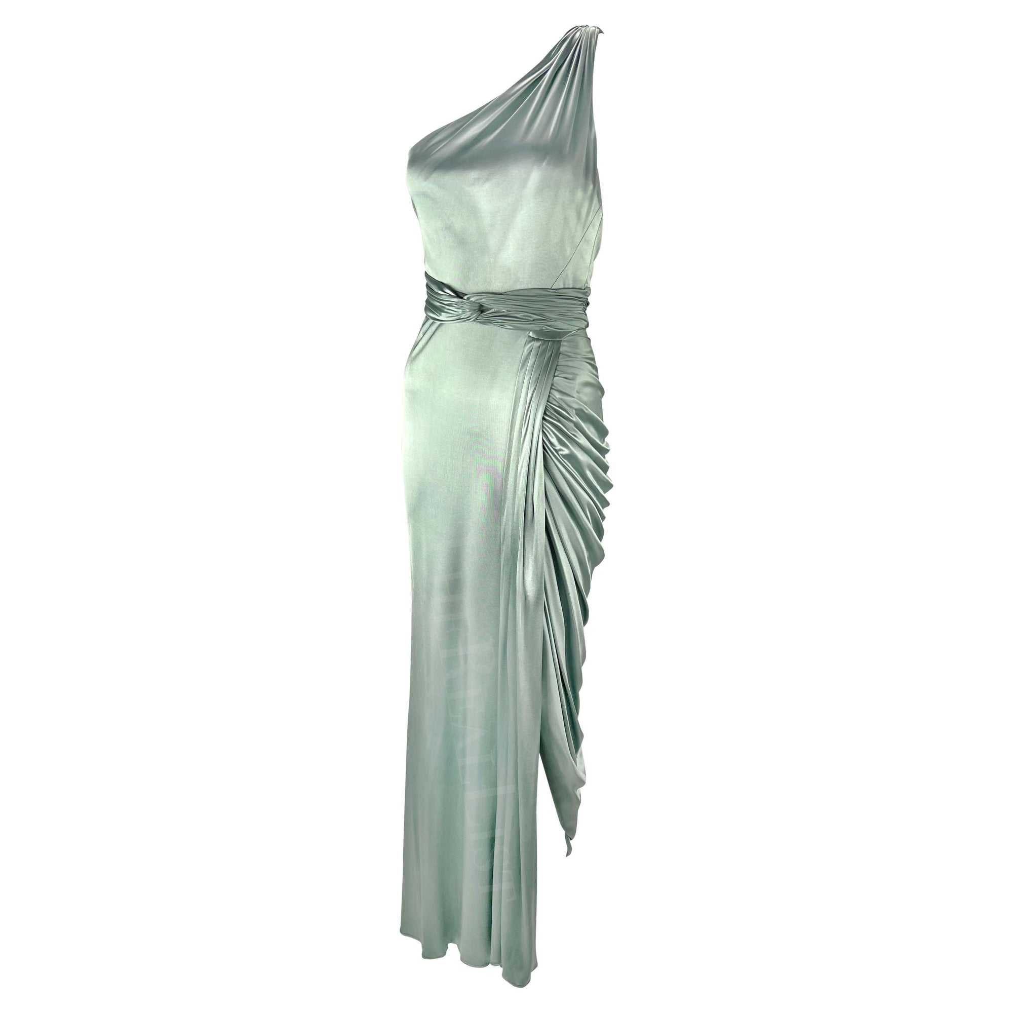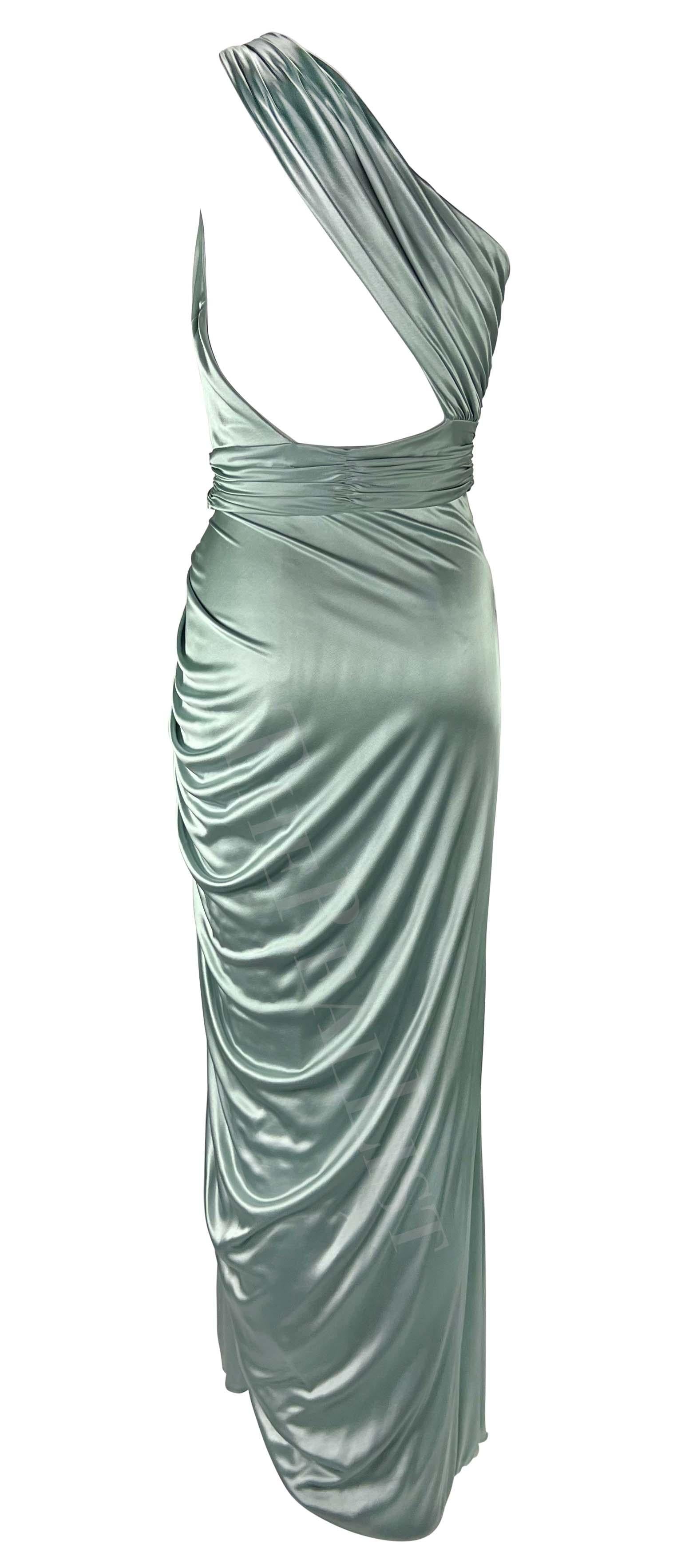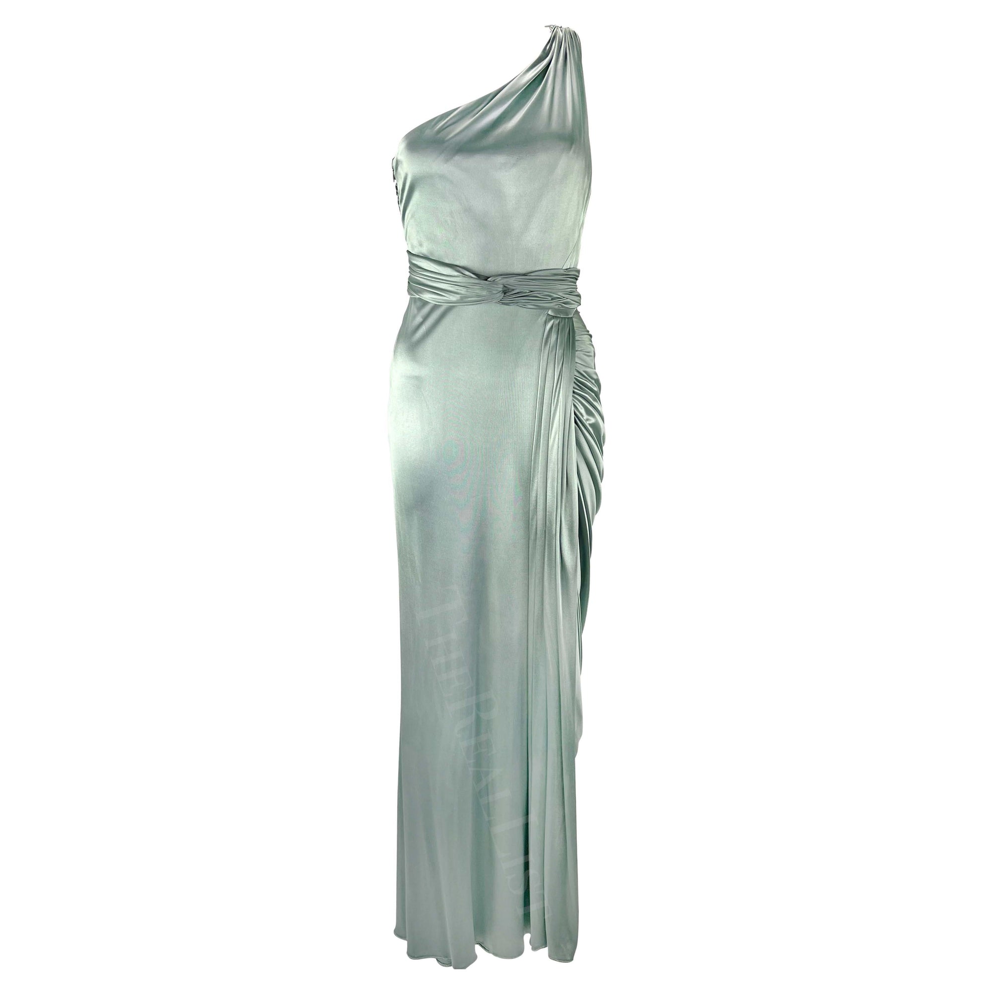 Presenting a gorgeous light blue stretch Versace gown, designed by Donatella Versace. From the Fall/Winter 2006 collection, this high-slit dress debuted on the season's runway as look 43 modeled by Mariacarla Boscono. The dress was also highlighted in the season's ad campaign, modeled by Kate Moss and captured by Mario Testino. This slinky single-shoulder gown perfectly hangs from the body with drape details at the shoulder strap and hips.