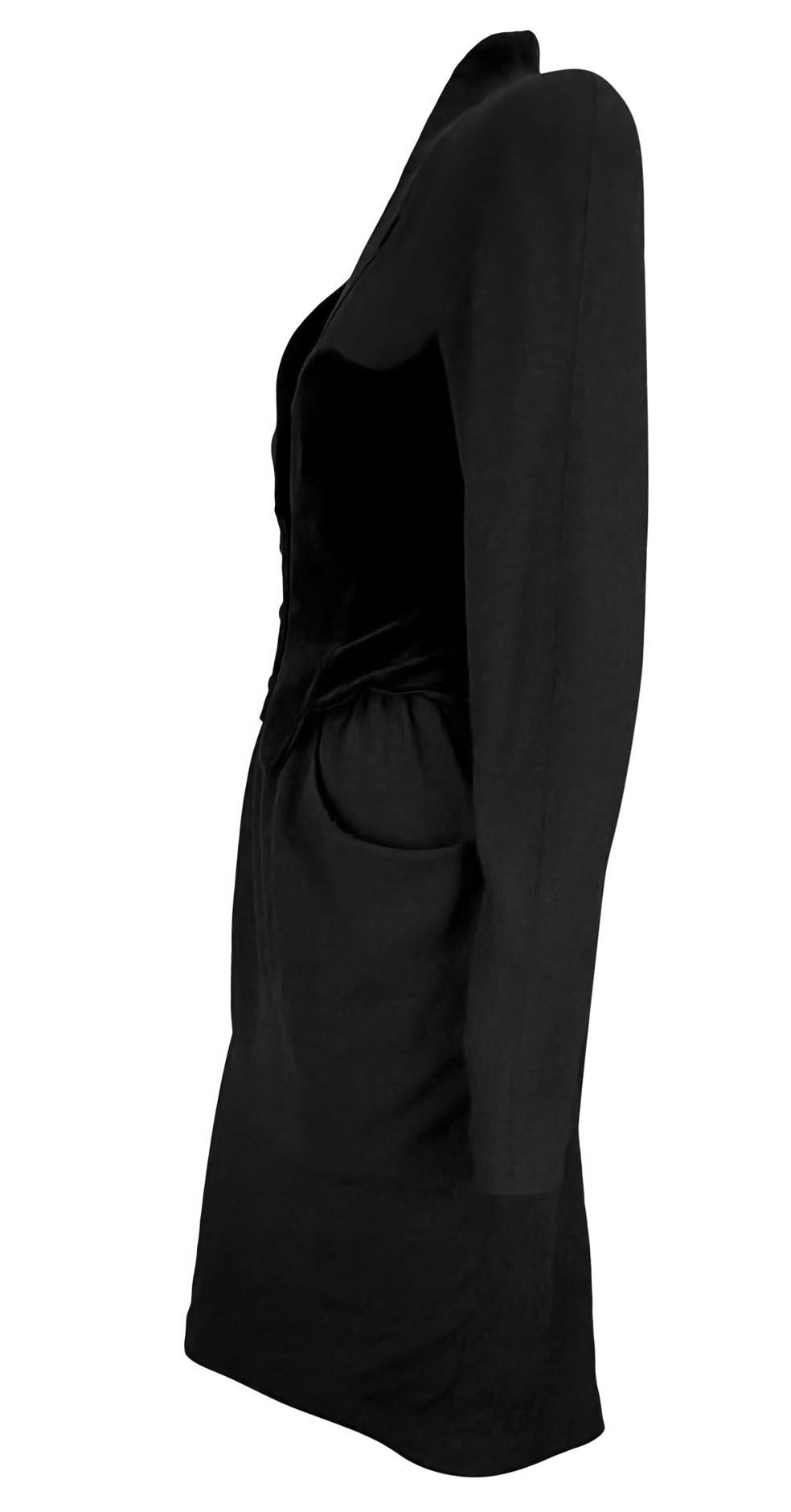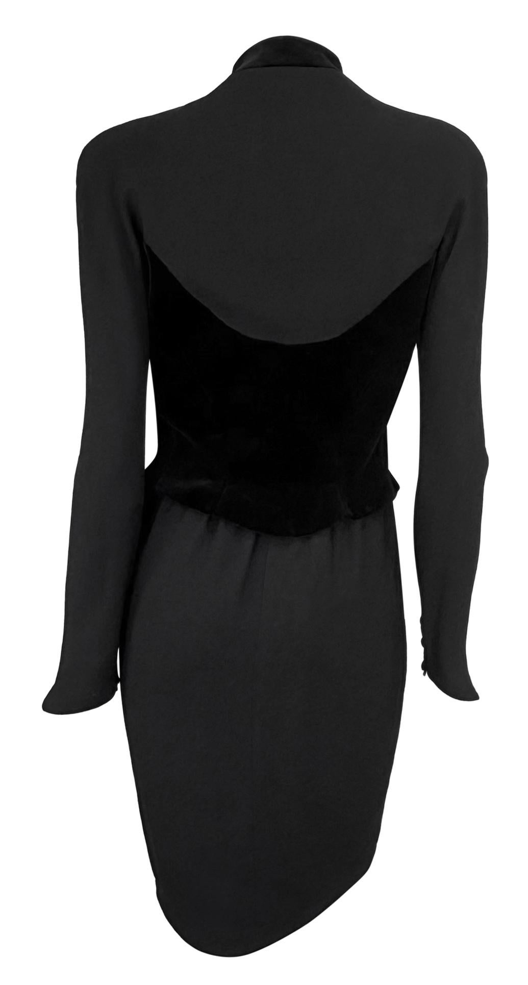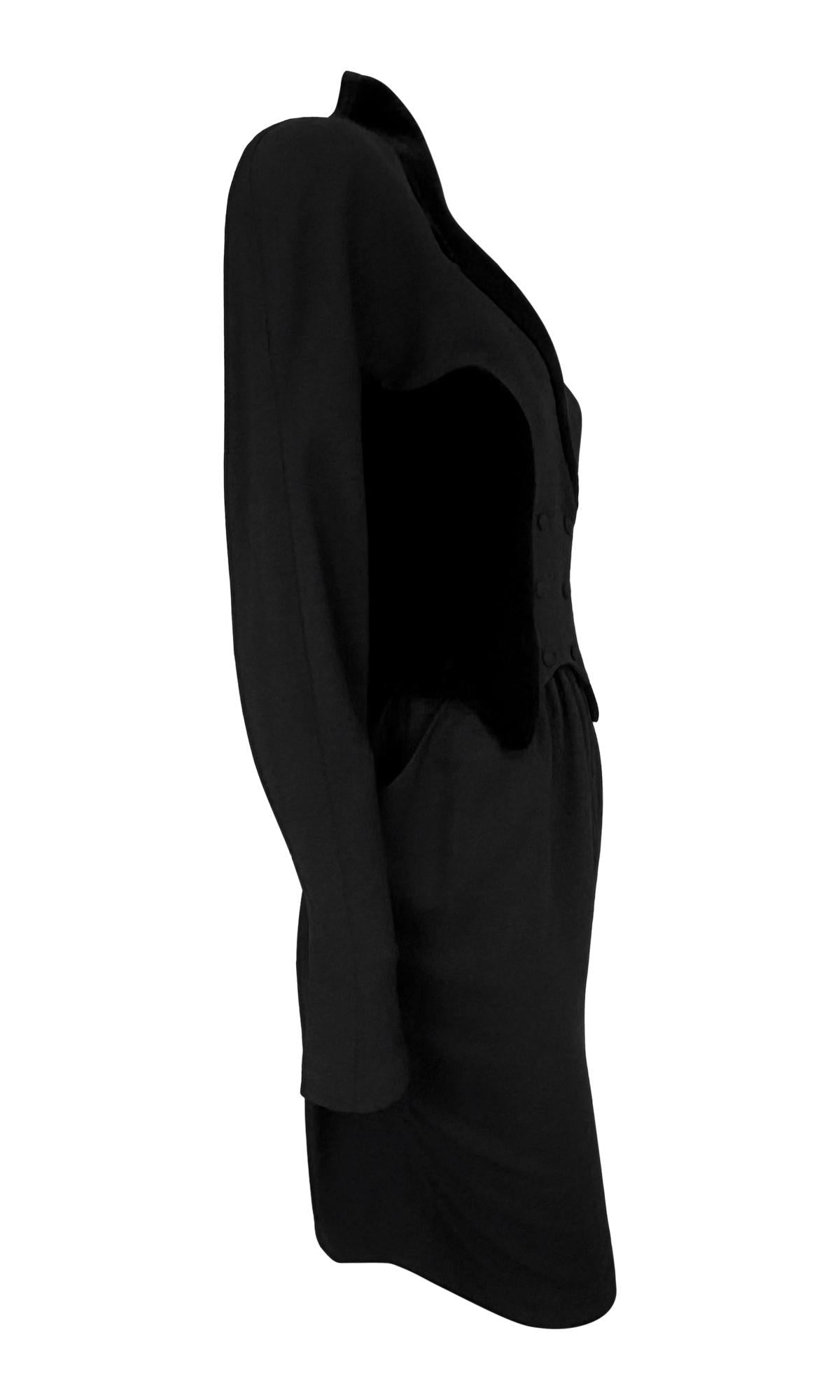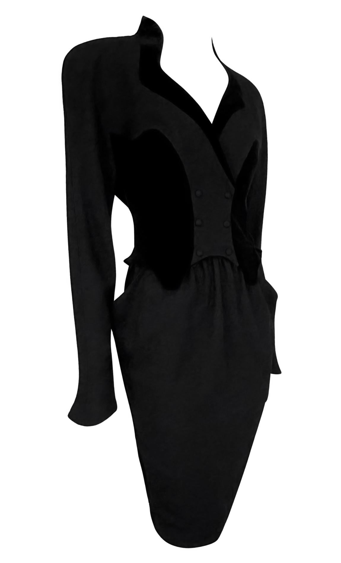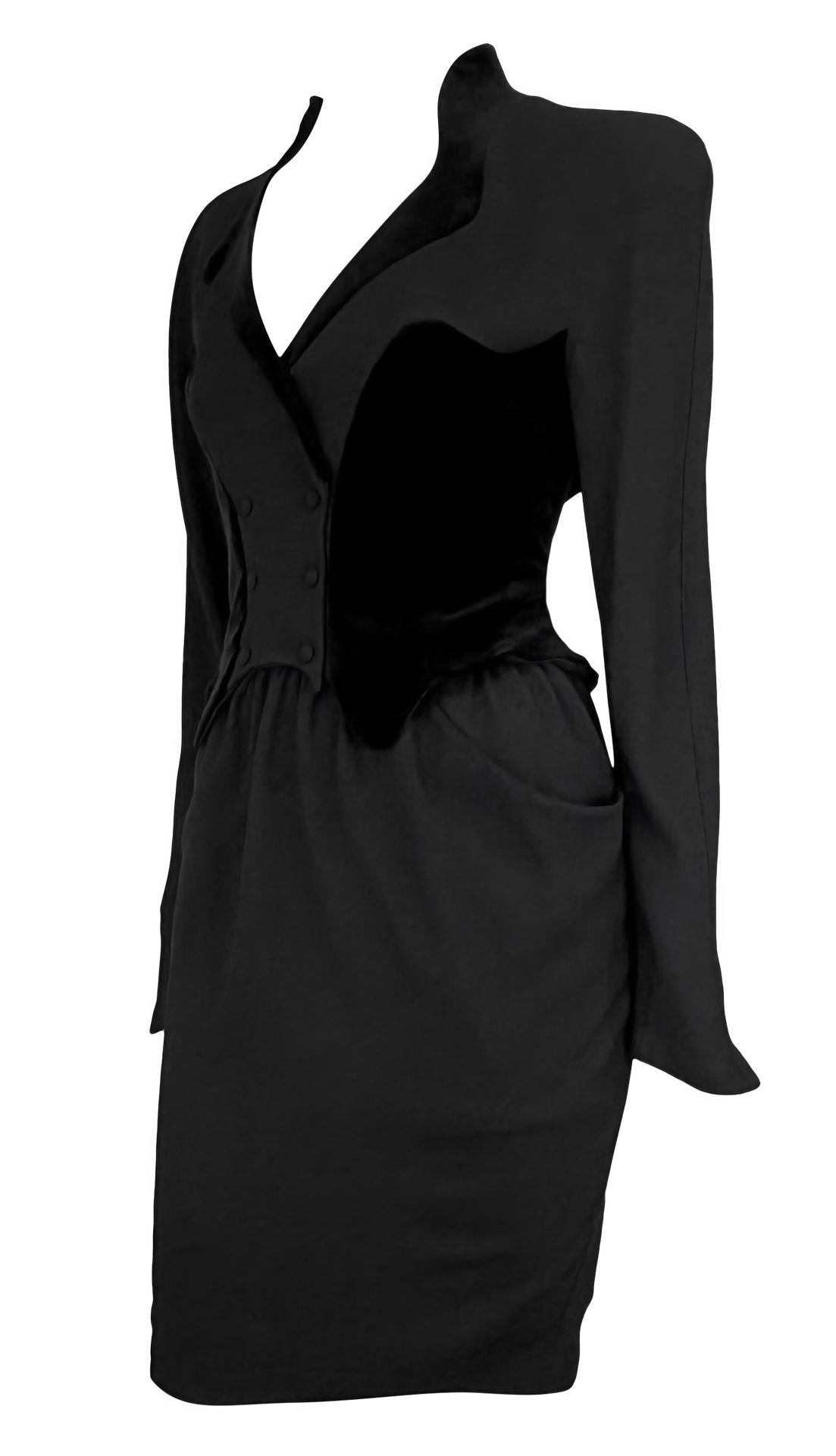 This late 1980s Thierry Mugler black midi dress features a sculptural design with velvet accents, mimicking a skirt suit. The structured silhouette includes exaggerated lapels, a double-breasted bodice, and a cinched waist, highlighting Mugler's signature architectural tailoring and dramatic elegance.