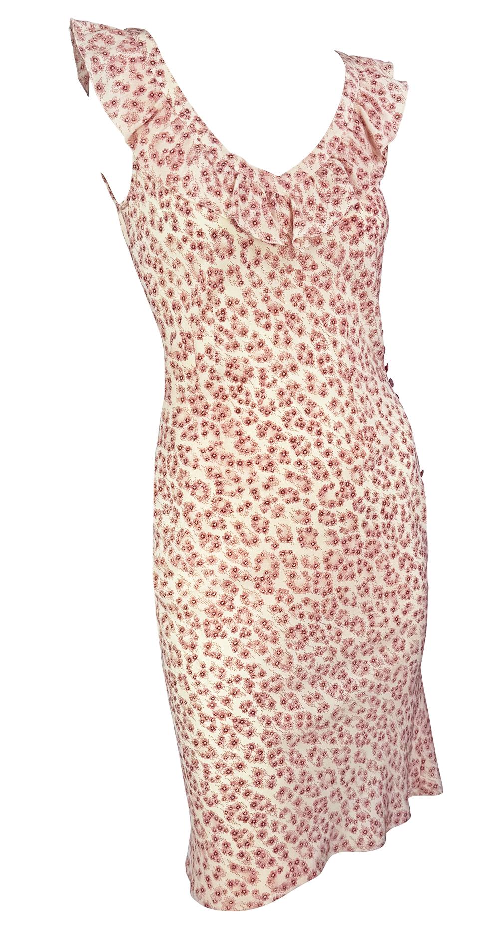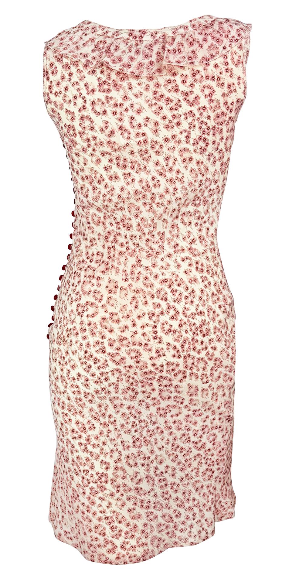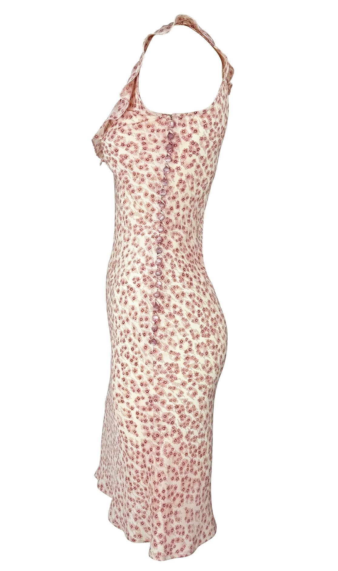 Designed in the late 1990s during Stella McCartney's tenure at Chloé, this sleeveless midi dress features a soft pink floral print on cream silk. Details include a ruffled neckline and a row of floral-covered buttons along the side of the dress.
