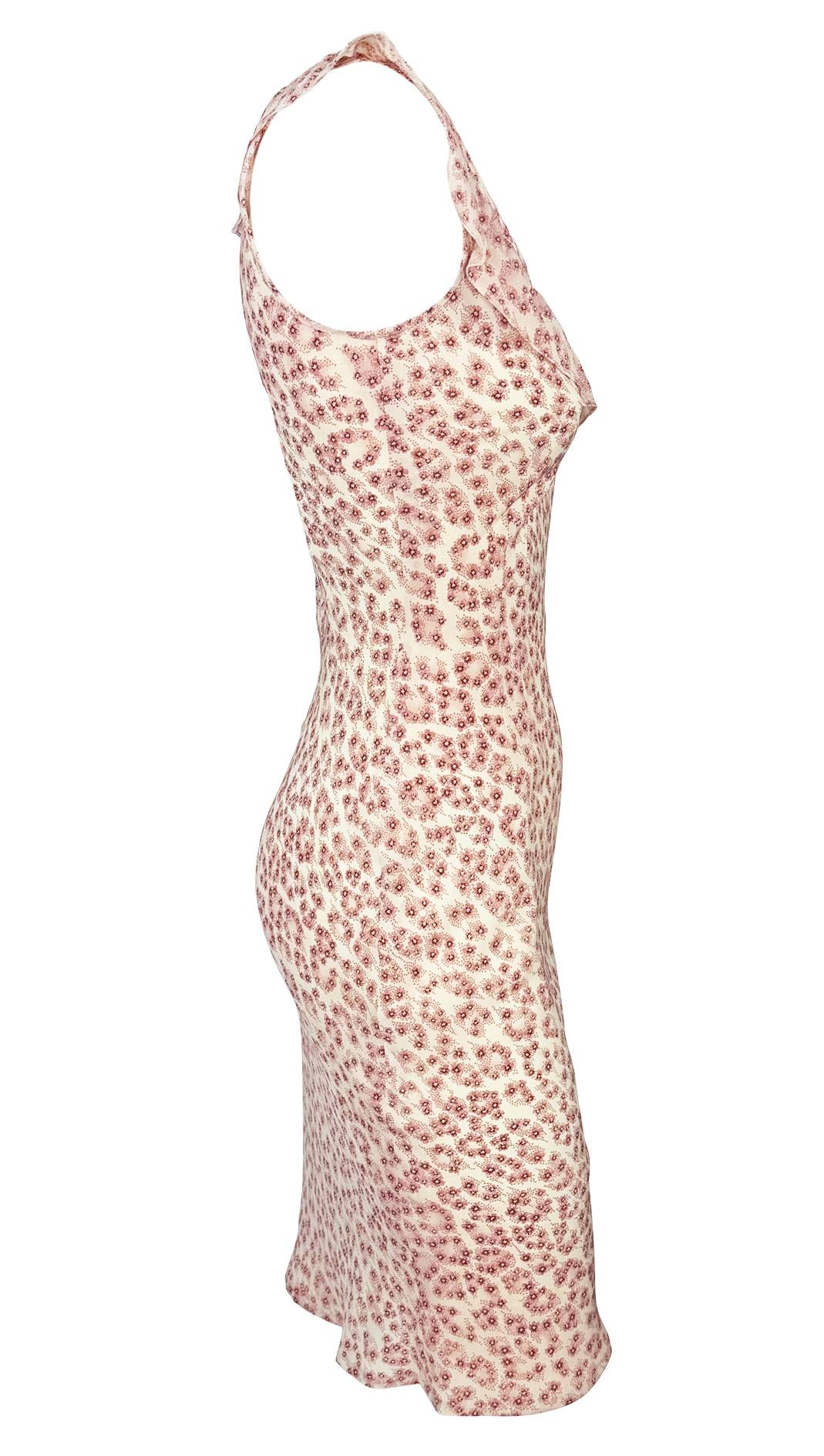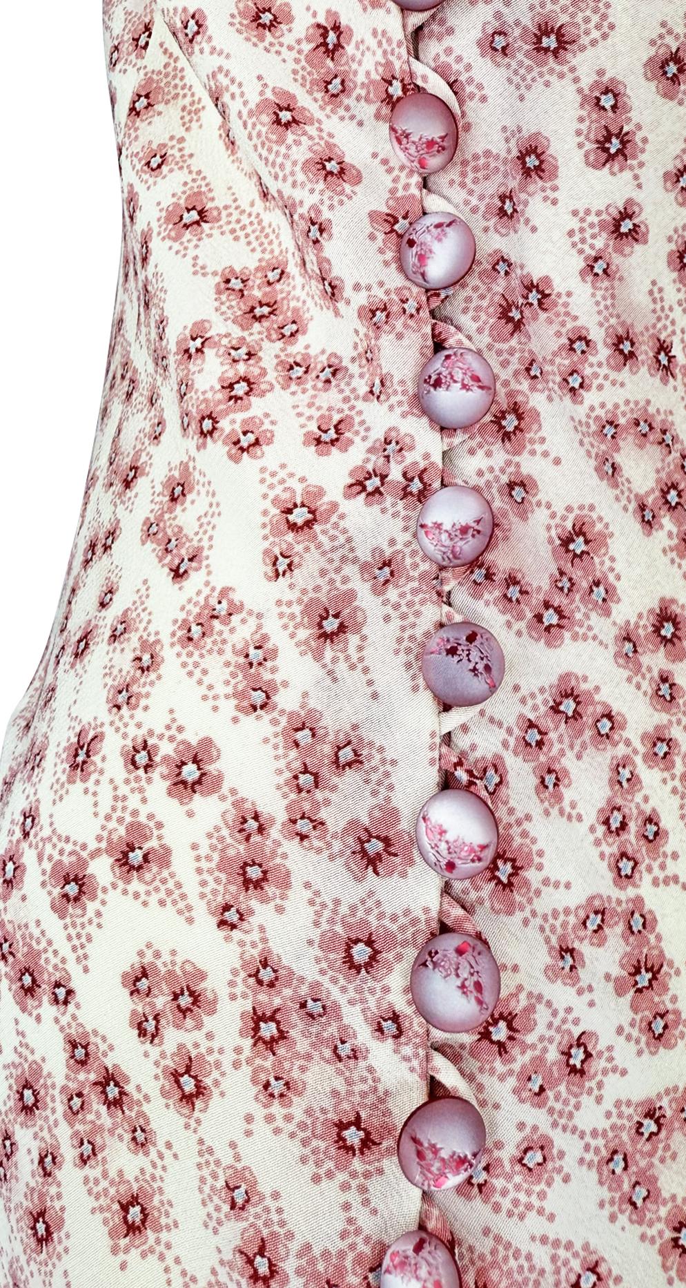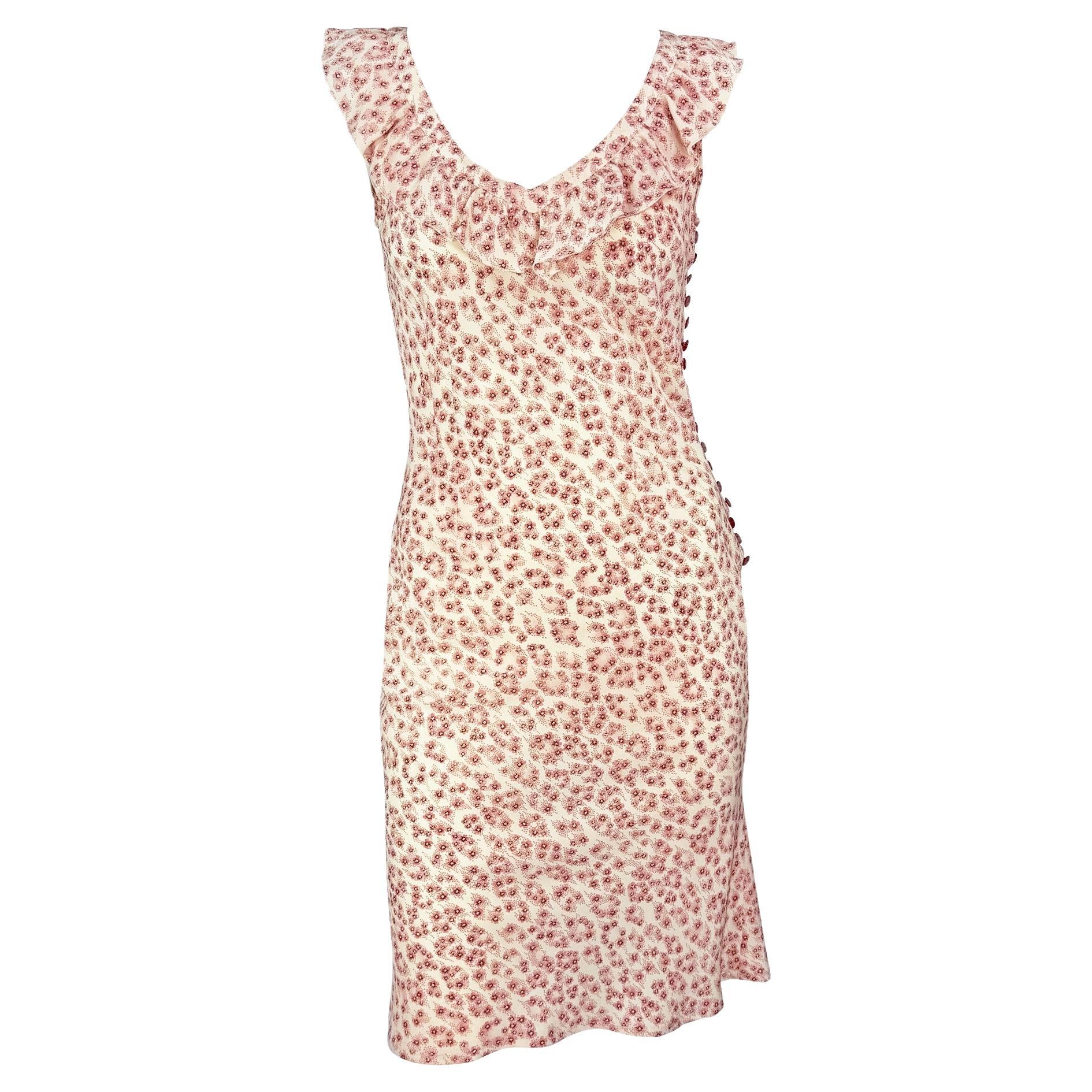 Designed in the late 1990s during Stella McCartney's tenure at Chloé, this sleeveless midi dress features a soft pink floral print on cream silk. Details include a ruffled neckline and a row of floral-covered buttons along the side of the dress.