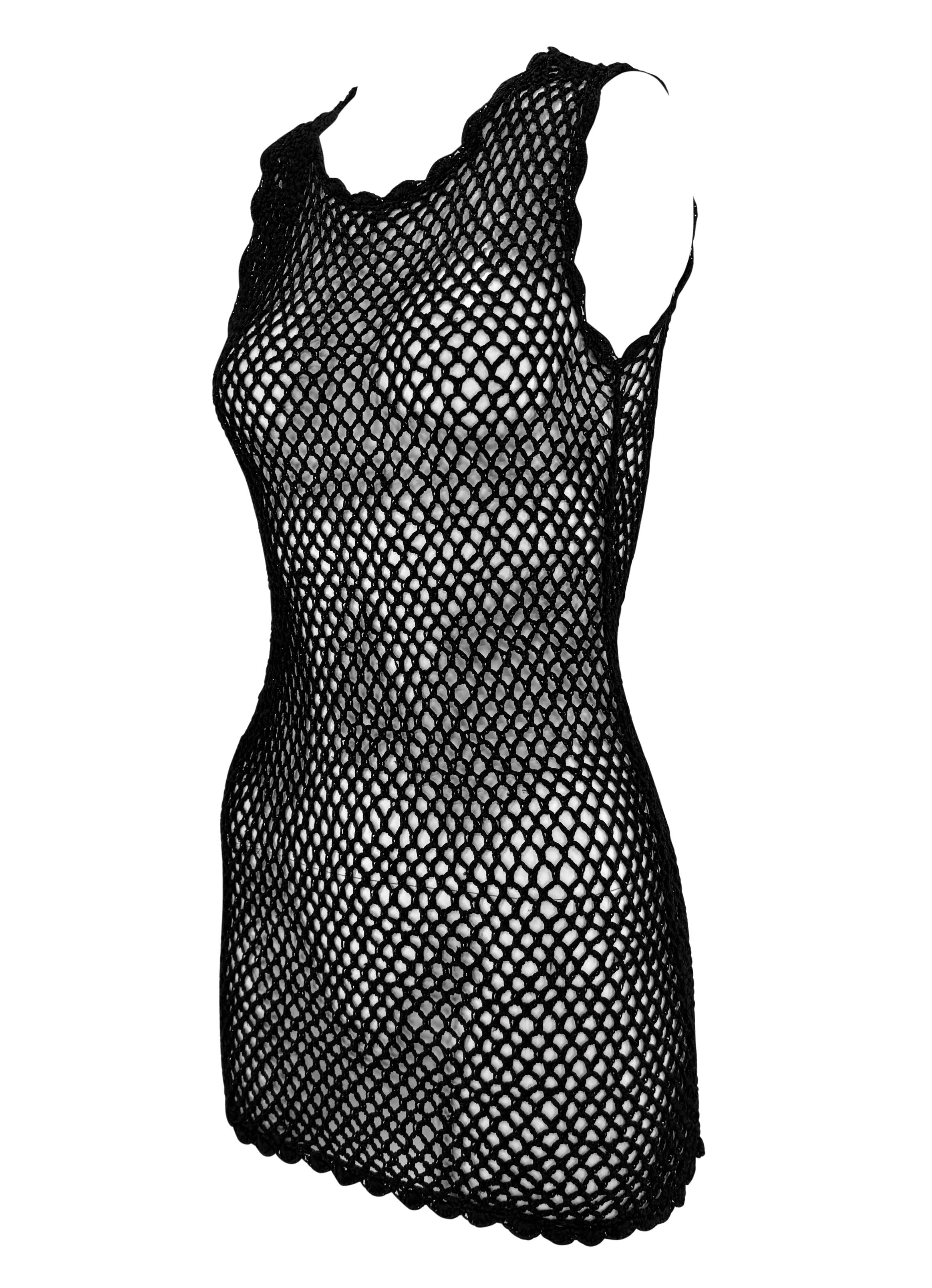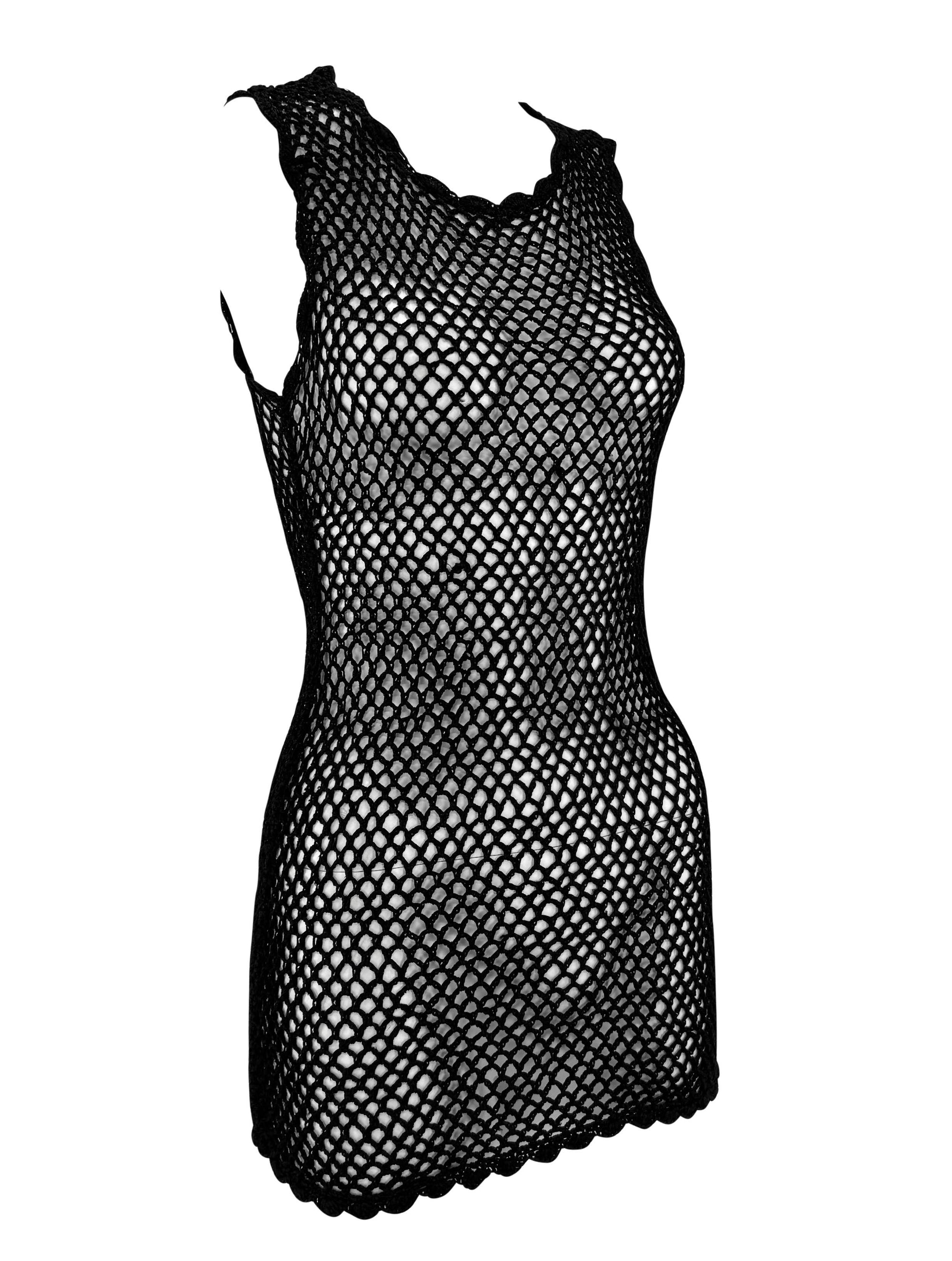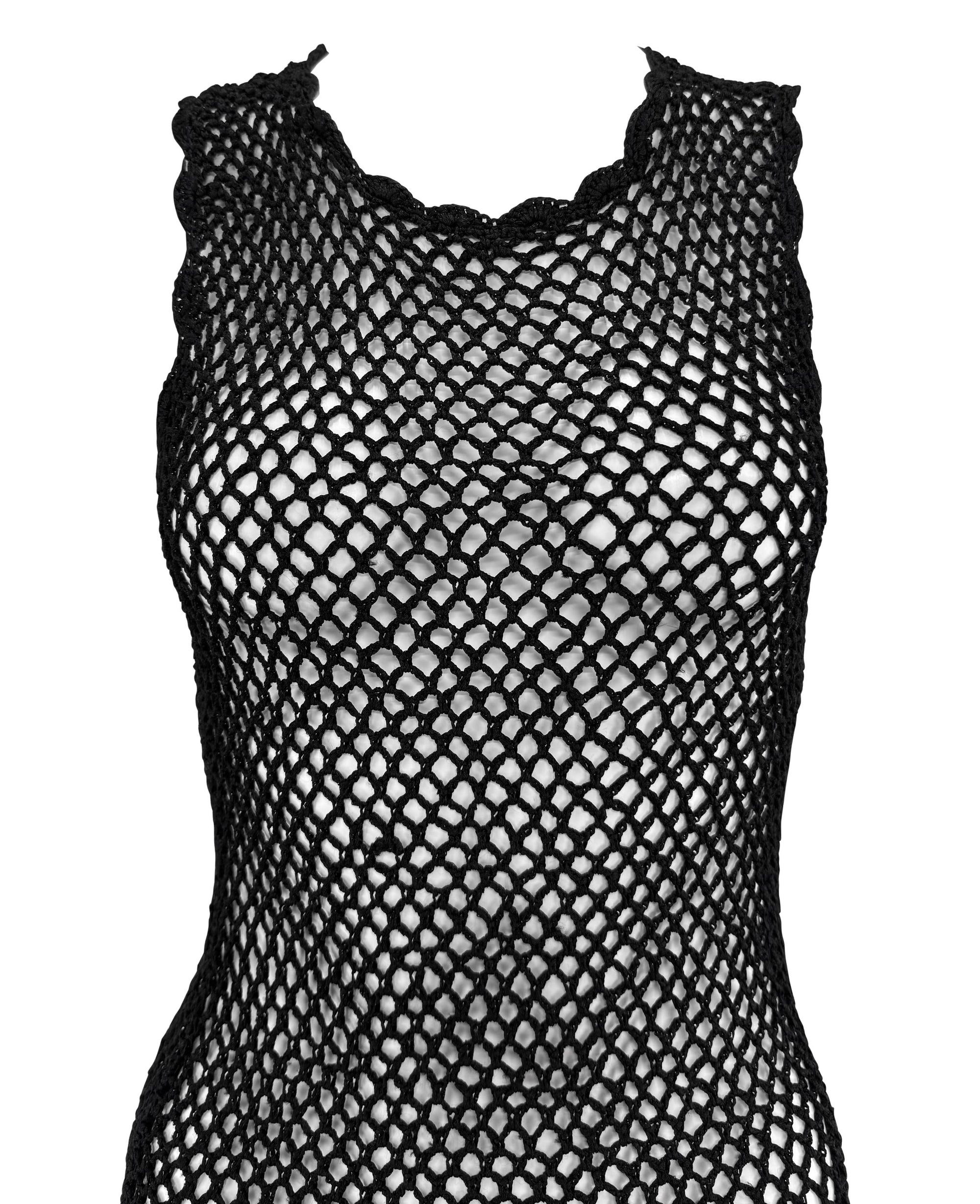 This late 1990s Dolce & Gabbana mini dress is crafted from black crochet knit, creating a sheer, netted silhouette that hugs the body. The design is complete with scalloped edges at the neckline and hem.