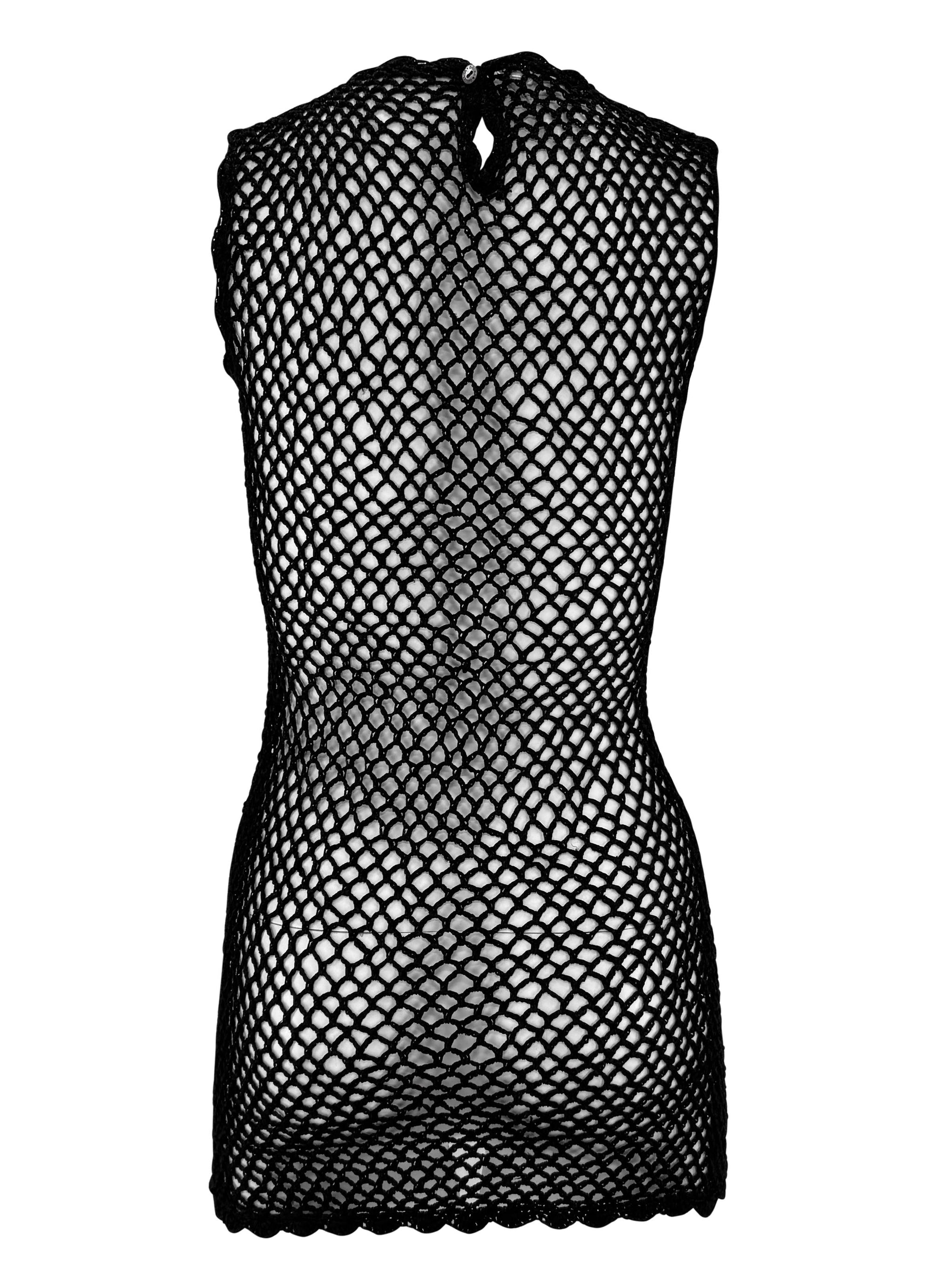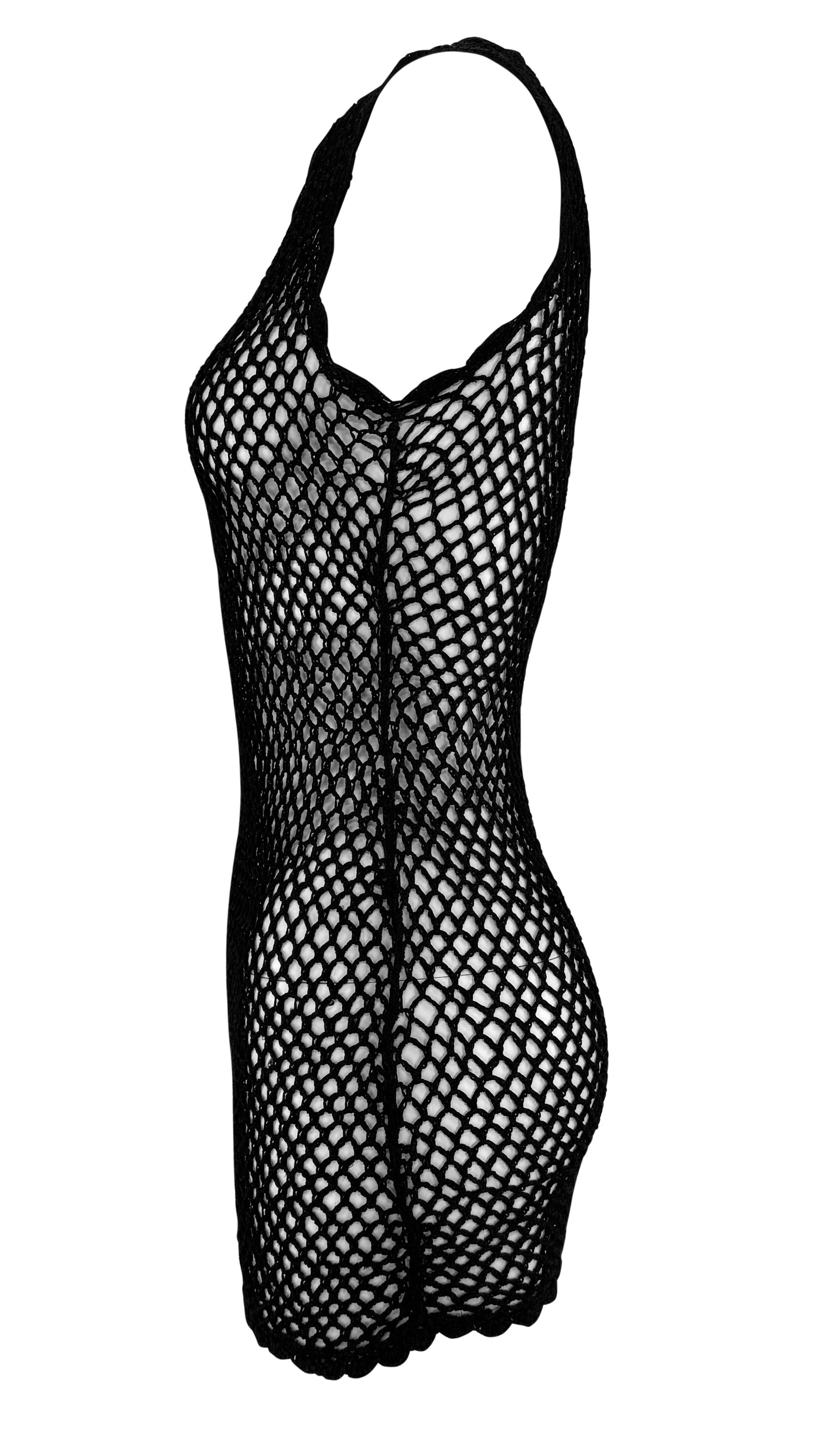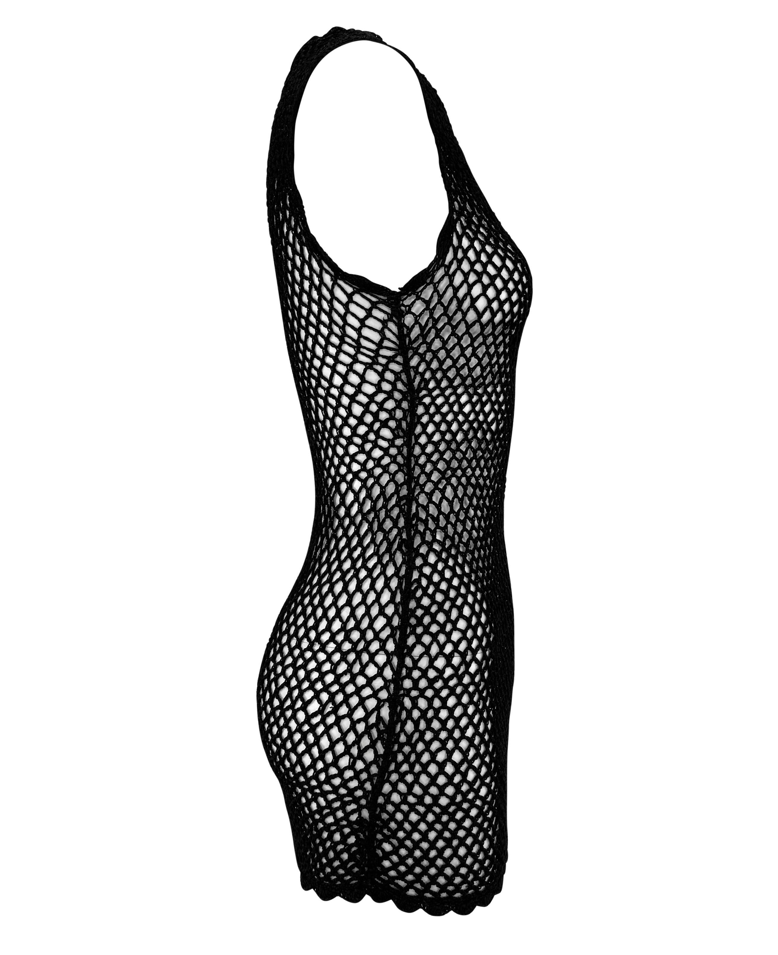 This late 1990s Dolce & Gabbana mini dress is crafted from black crochet knit, creating a sheer, netted silhouette that hugs the body. The design is complete with scalloped edges at the neckline and hem.