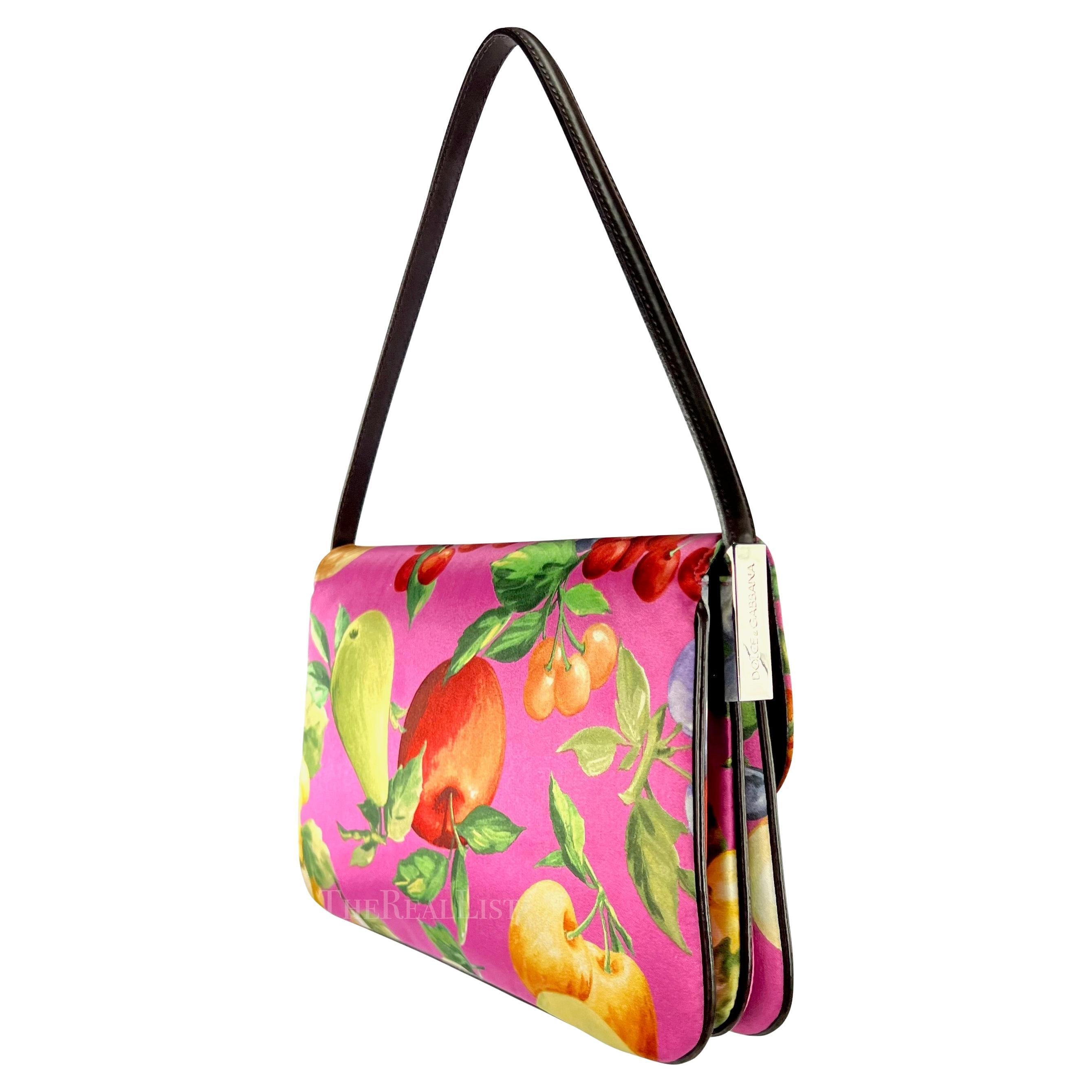 Presenting a fabulous pink satin fruit print Dolce & Gabbana flap shoulder bag. Experience the fabulous allure of this satin pink fruit print Dolce & Gabbana flap shoulder bag, a remarkable treasure from the late 1990s / early 2000s. With its simple yet chic design, this bag effortlessly exudes timeless elegance. Featuring a leather strap, vibrant fruit pattern against a pink background, and metal branded accents on each side, it is the perfect accessory to elevate your ensemble for any occasion.