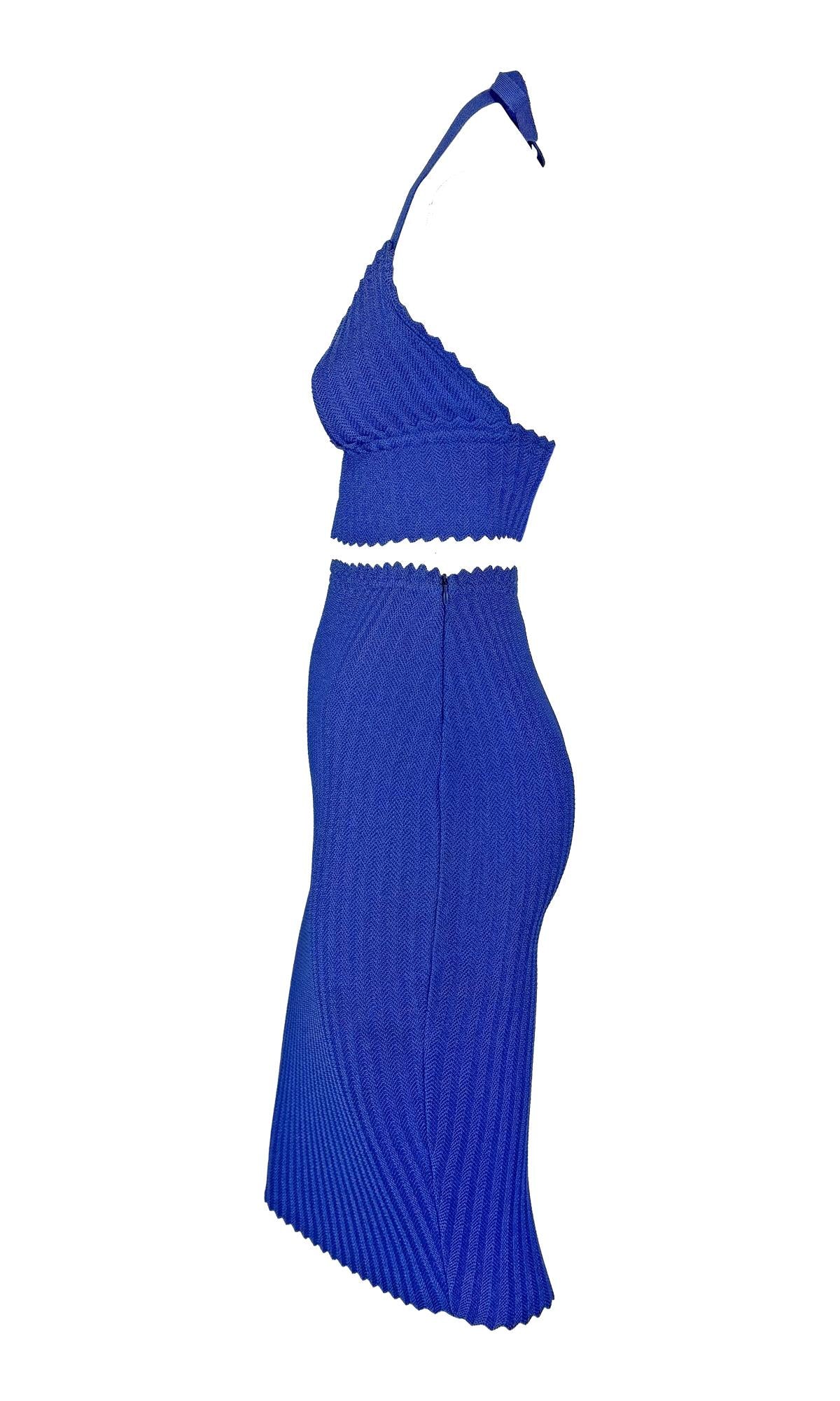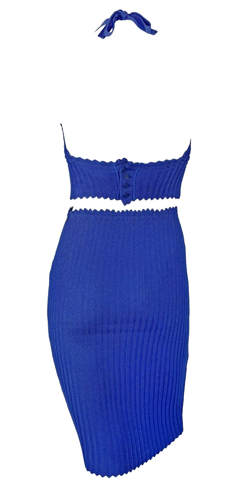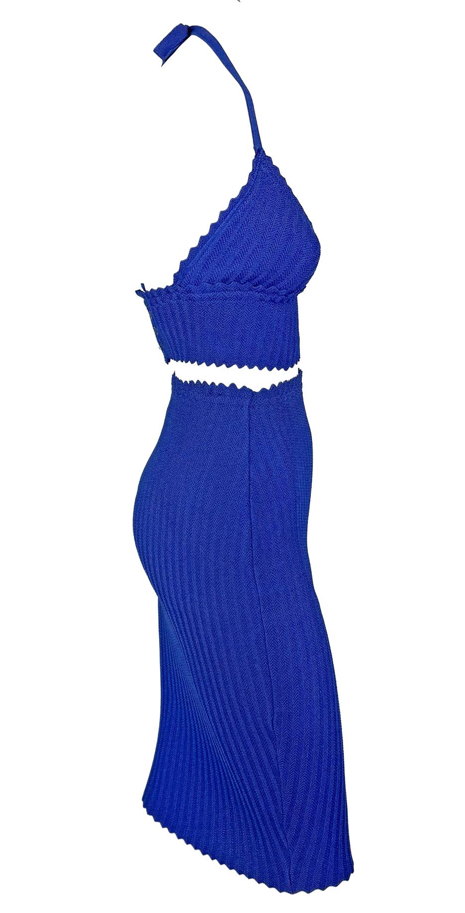 This vibrant cobalt blue set by Fendi, designed by Karl Lagerfeld in the late 1990s, includes a ribbed knit halter bralette and a matching pencil skirt. The bralette features scalloped trim, back button closures, and a tie at the neck.