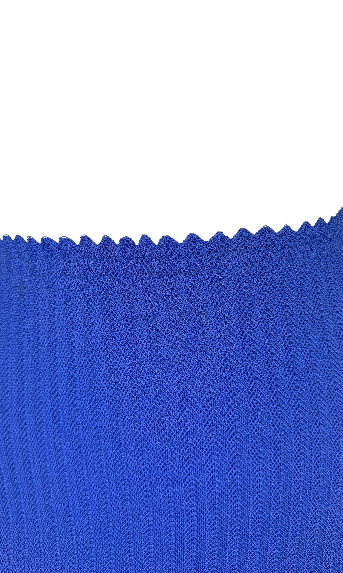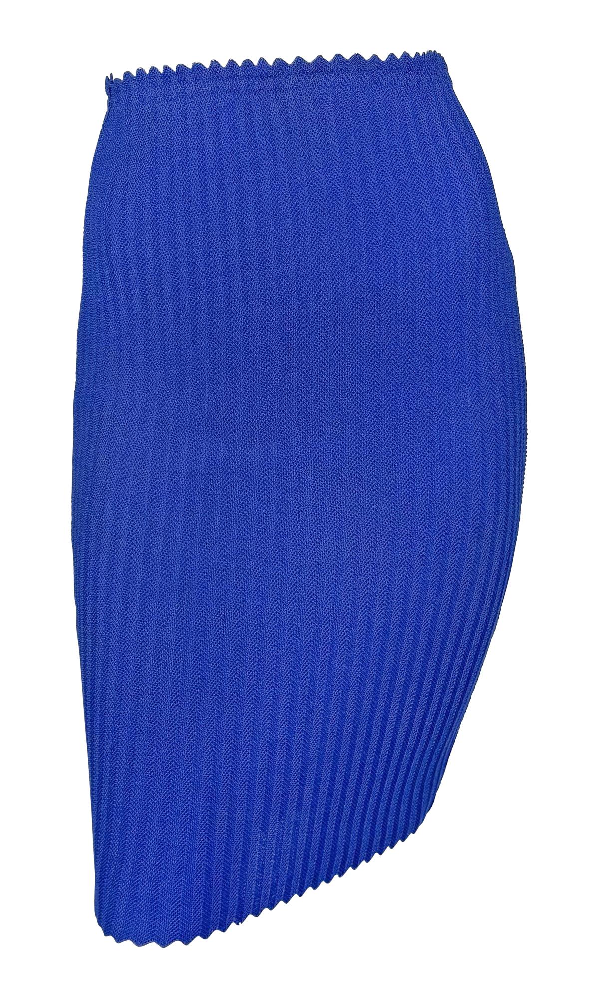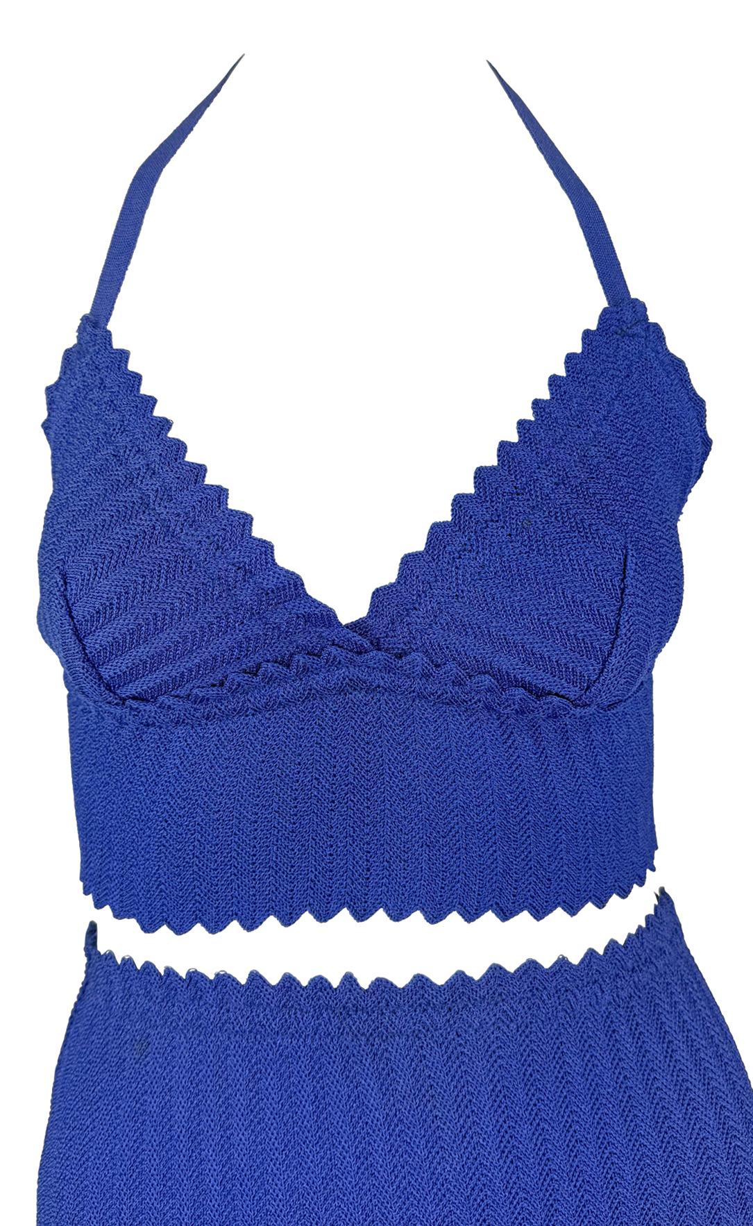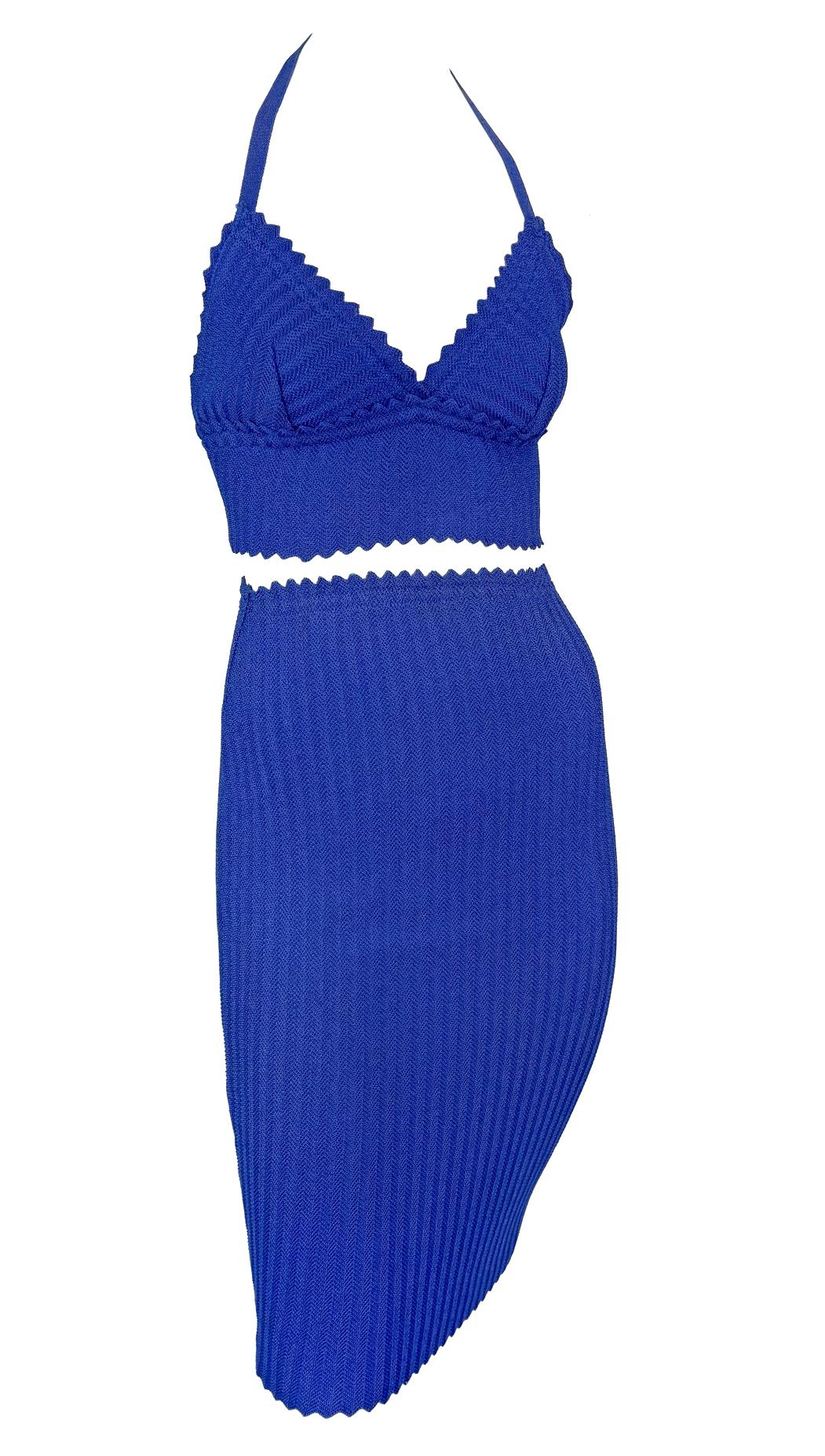This vibrant cobalt blue set by Fendi, designed by Karl Lagerfeld in the late 1990s, includes a ribbed knit halter bralette and a matching pencil skirt. The bralette features scalloped trim, back button closures, and a tie at the neck.