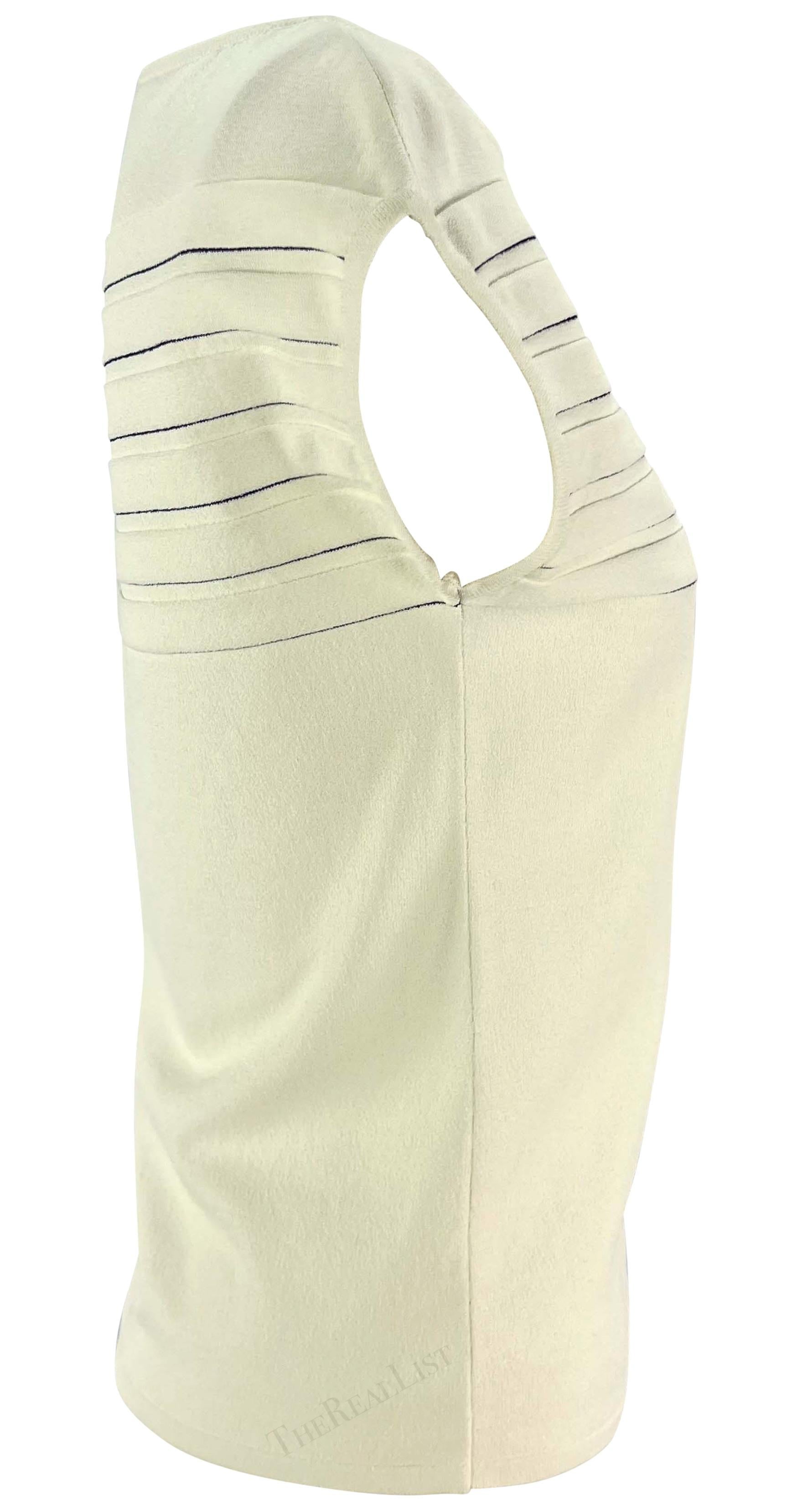 Presenting an off-white knit Salvatore Ferragamo striped top. From the 1990s, this off-white top features thin navy stripes that run across the bust and petal sleeves. The top is made complete with a small metal Ferragamo logo accent at the front of the top.