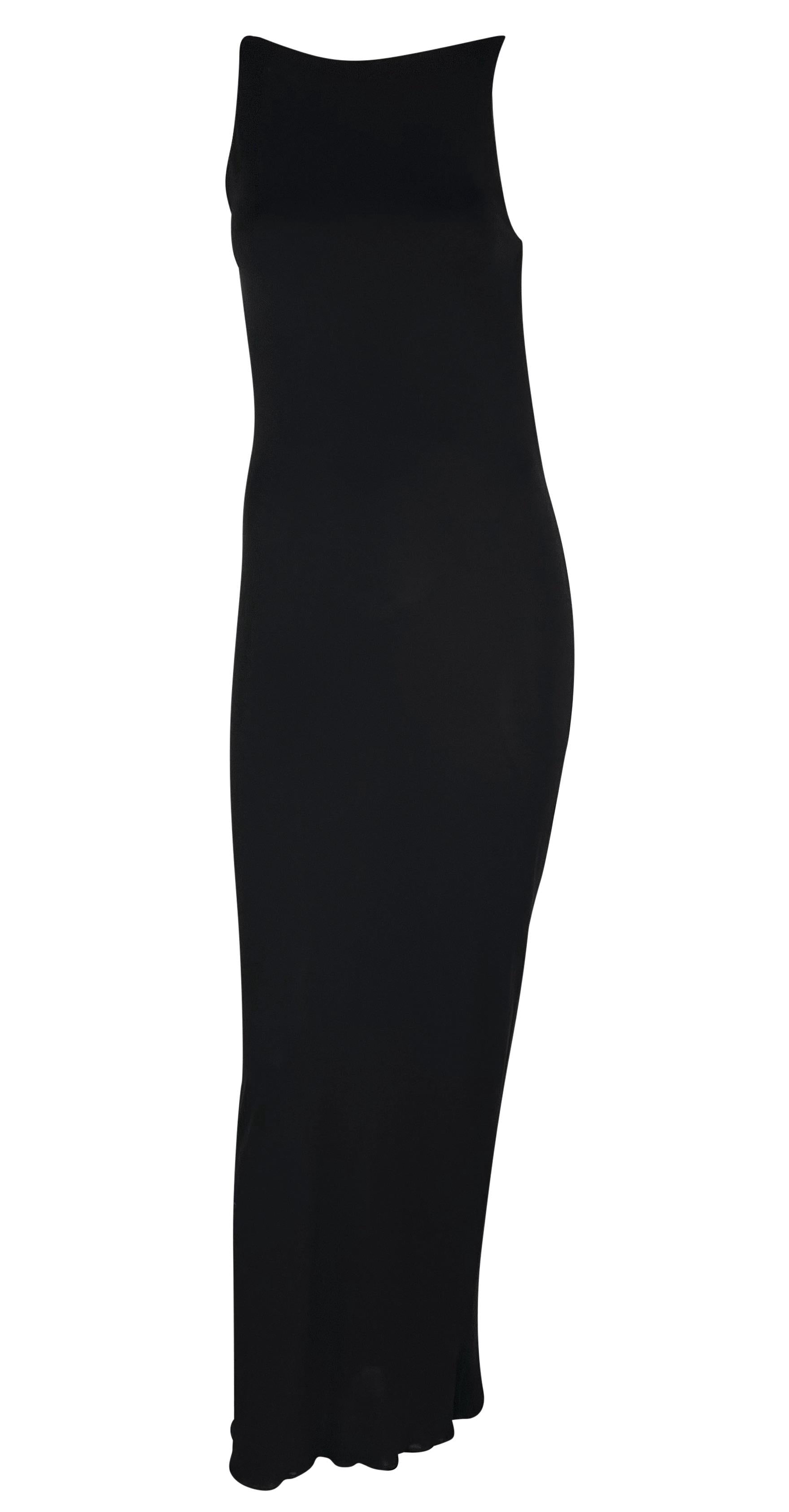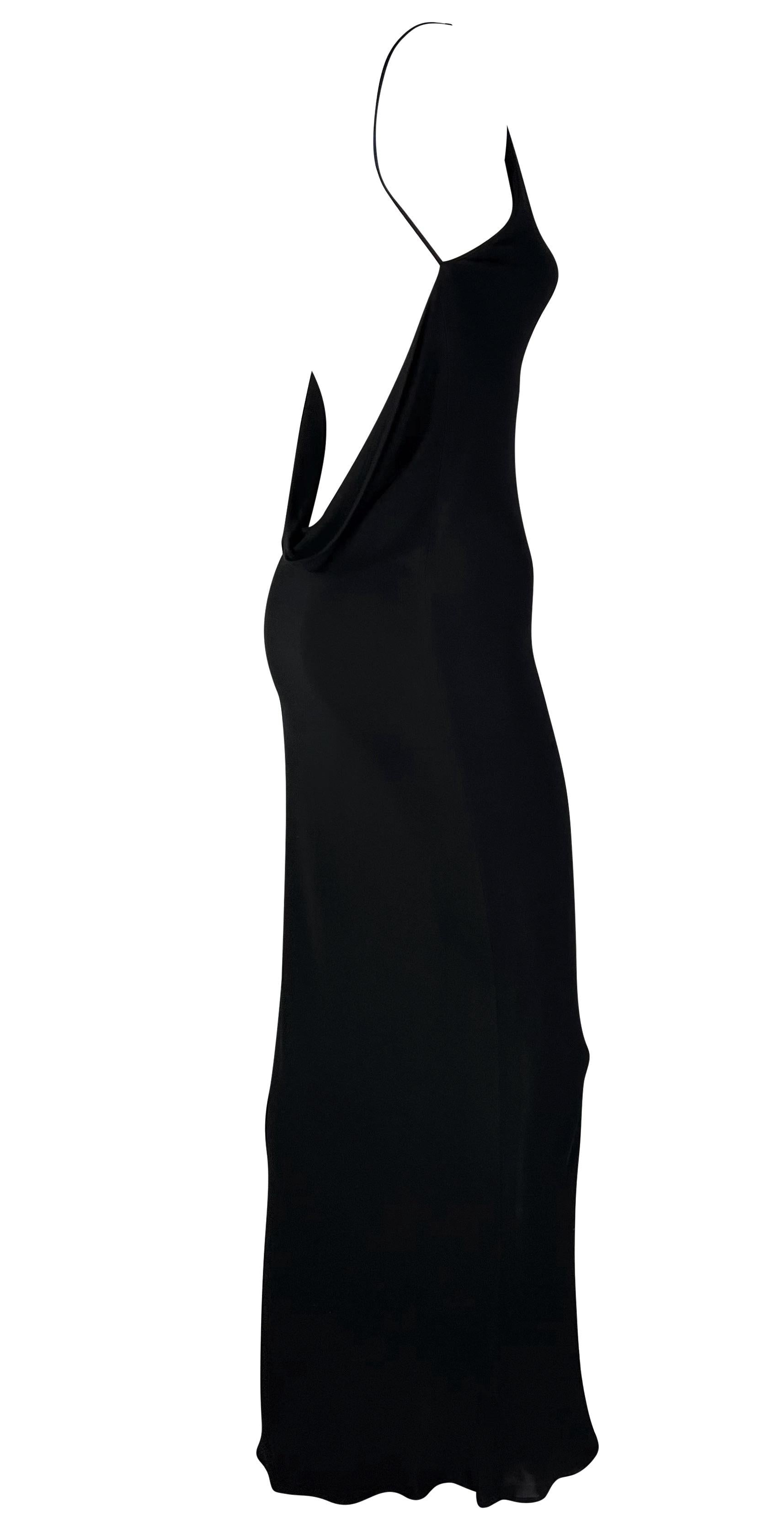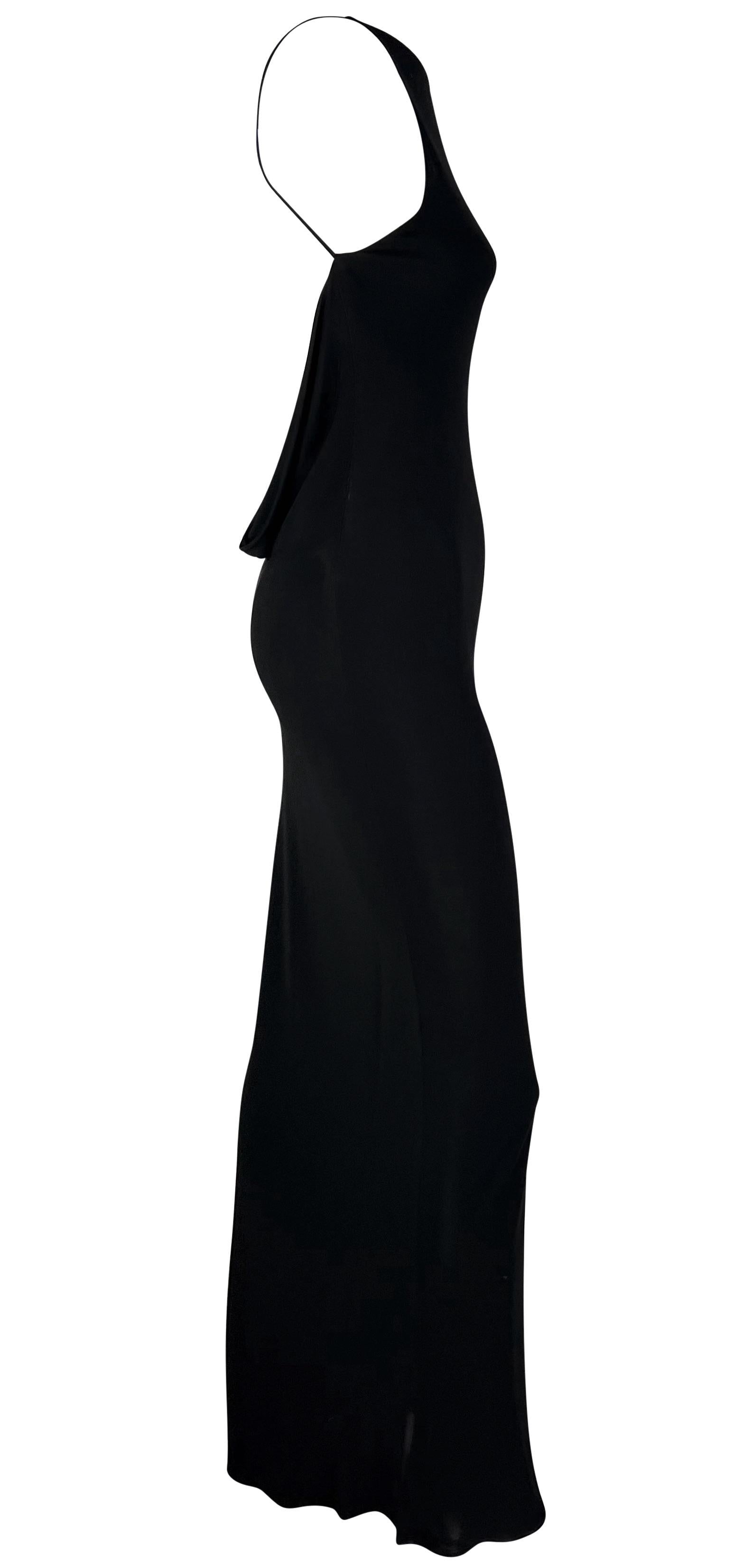 This backless black gown by Israeli-American designer Yigal Azrouël, dating back to the late 1990s, epitomizes versatility. Whether for a formal occasion or a more casual event, this chic gown fits the bill. It boasts a high, wide neckline and a captivating exposed back adorned with a delicate cowl detail at the upper rear. Crafted from slinky and stretchy fabric, it ensures both comfort and allure.