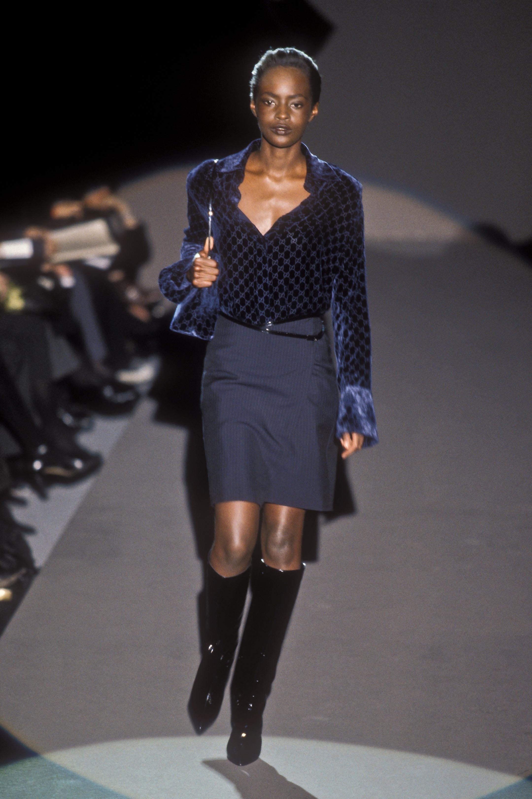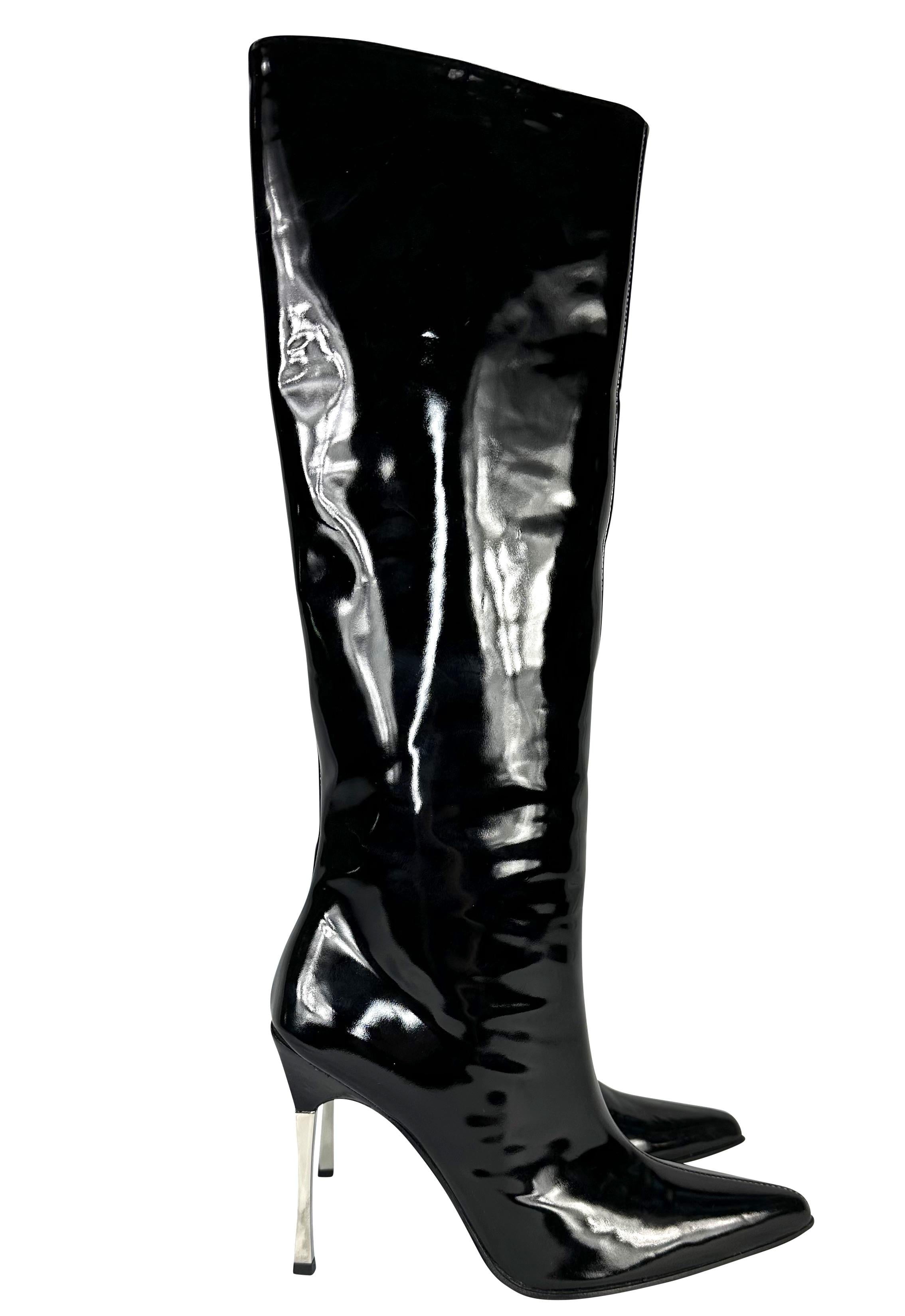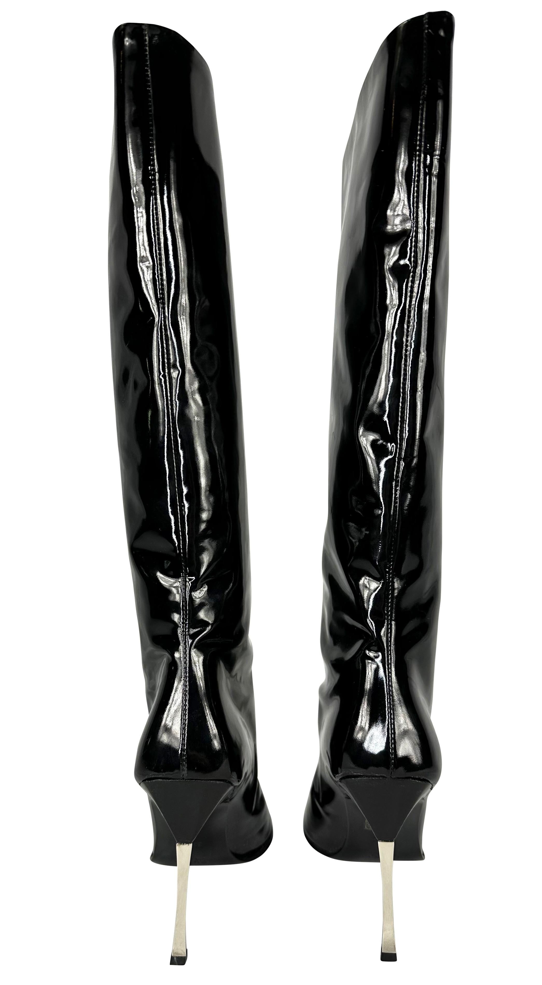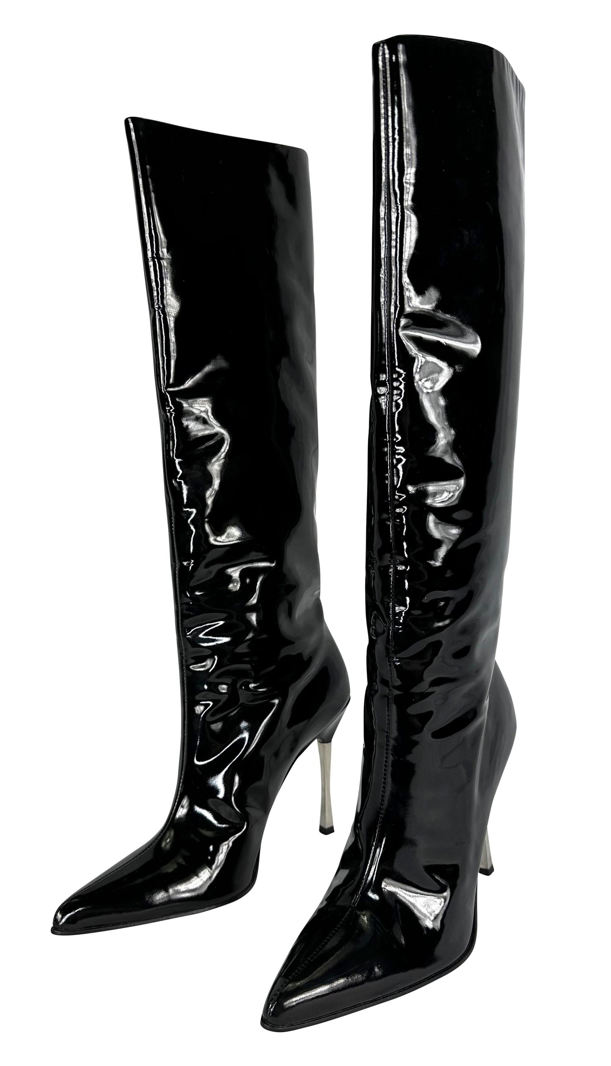 Presenting a pair of iconic black patent leather Gucci heeled boots designed by Tom Ford. From the Fall/Winter 1997 collection, these boots debuted on the season's runway and were also highlighted in the season's ad campaign, captured by Mario Testino. These never-before-worn boots feature a pointed toe, a glossy patent finish, and a silver-plated heel peg and are made complete with the original box. Indeed, a Gucci by Tom Ford lover's dream, these new boots from 25 years ago are a must-have addition to any wardrobe.