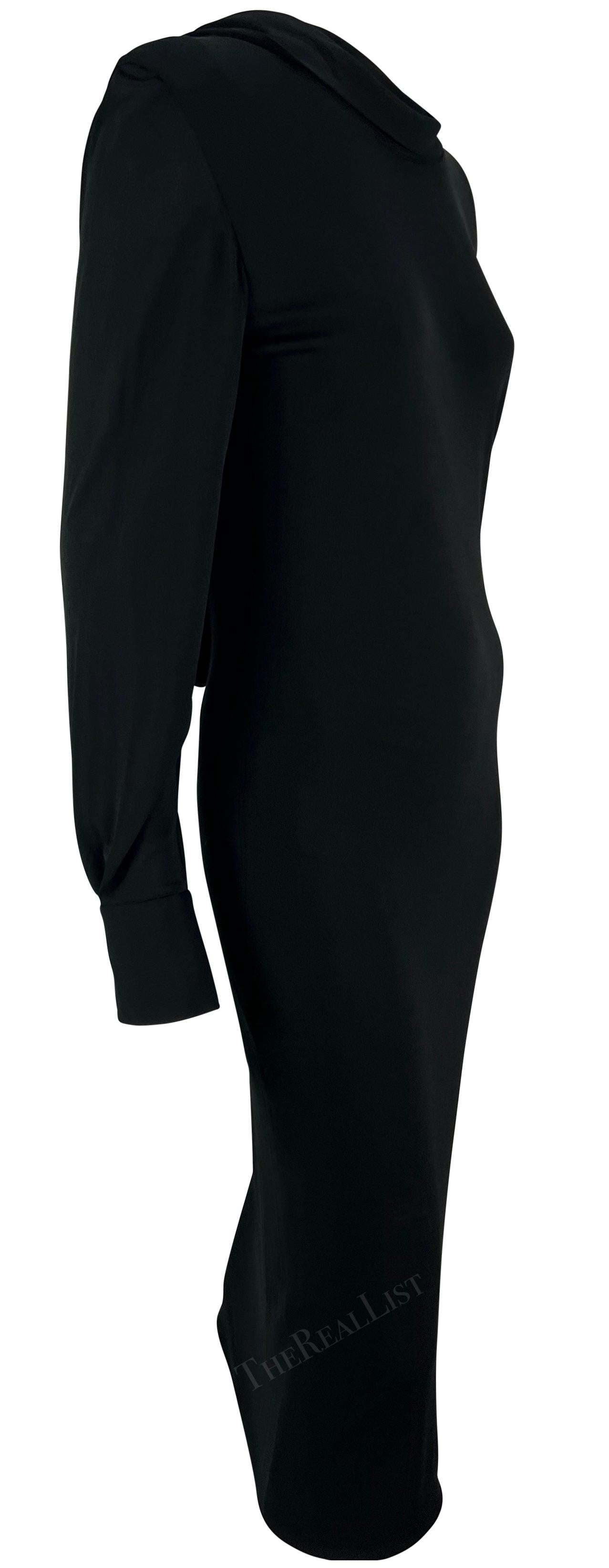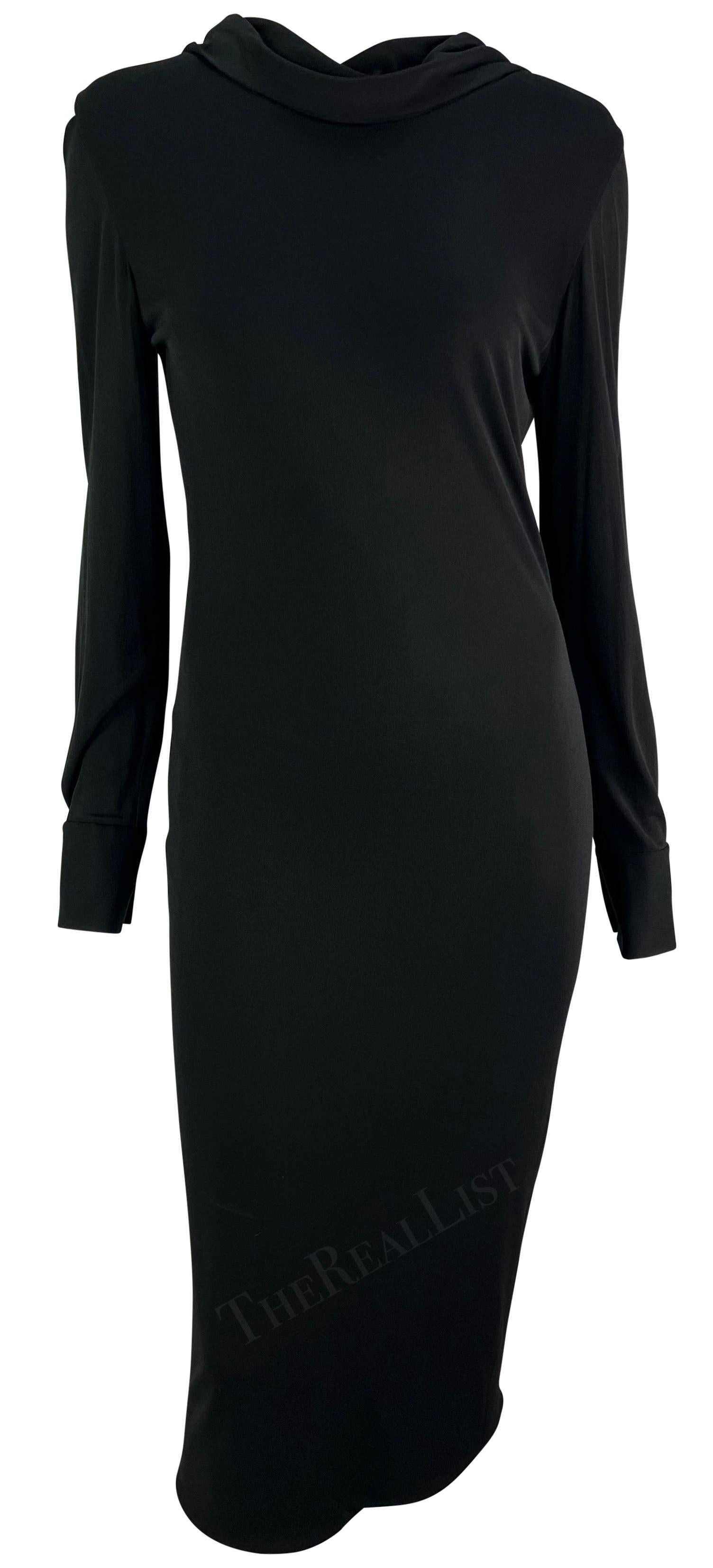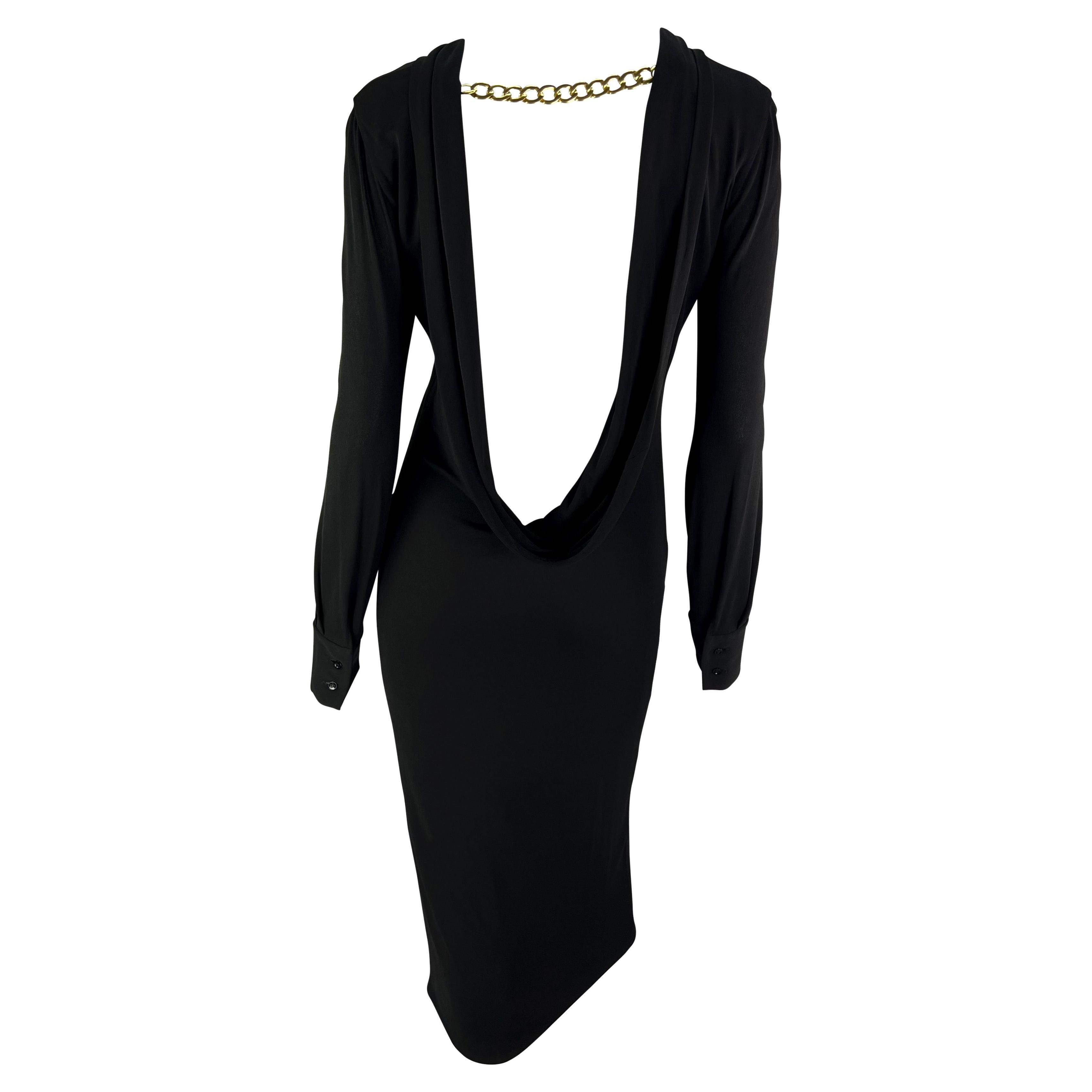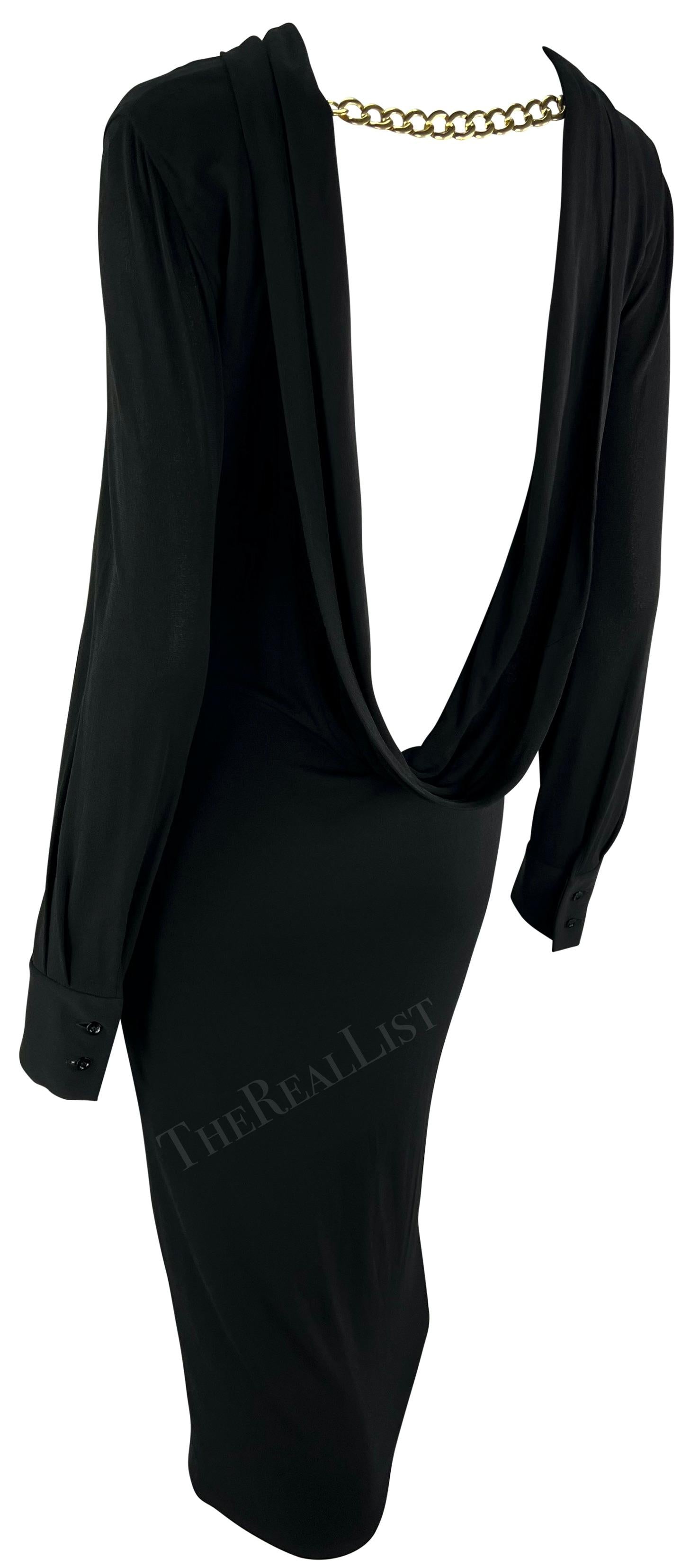 Presenting a gorgeous black Alexander McQueen backless dress, designed by Lee McQueen. From the Spring/Summer 2006 collection, this gorgeous knee-length dress features long sleeves and gathering at the neck. This stunning dress takes things up a notch with its open-back design, which gracefully drapes just above the hips. It also includes an eye-catching gold-tone chain embellishment that connects between the shoulders. Never worn before, this dress is made complete with the original tags still attached from over 15 years ago!