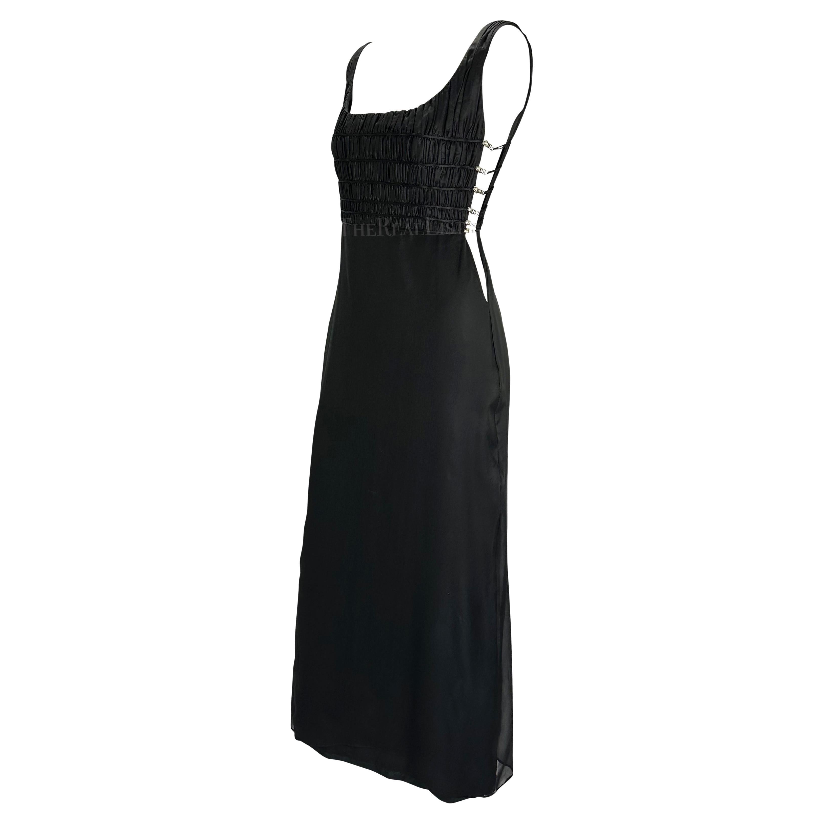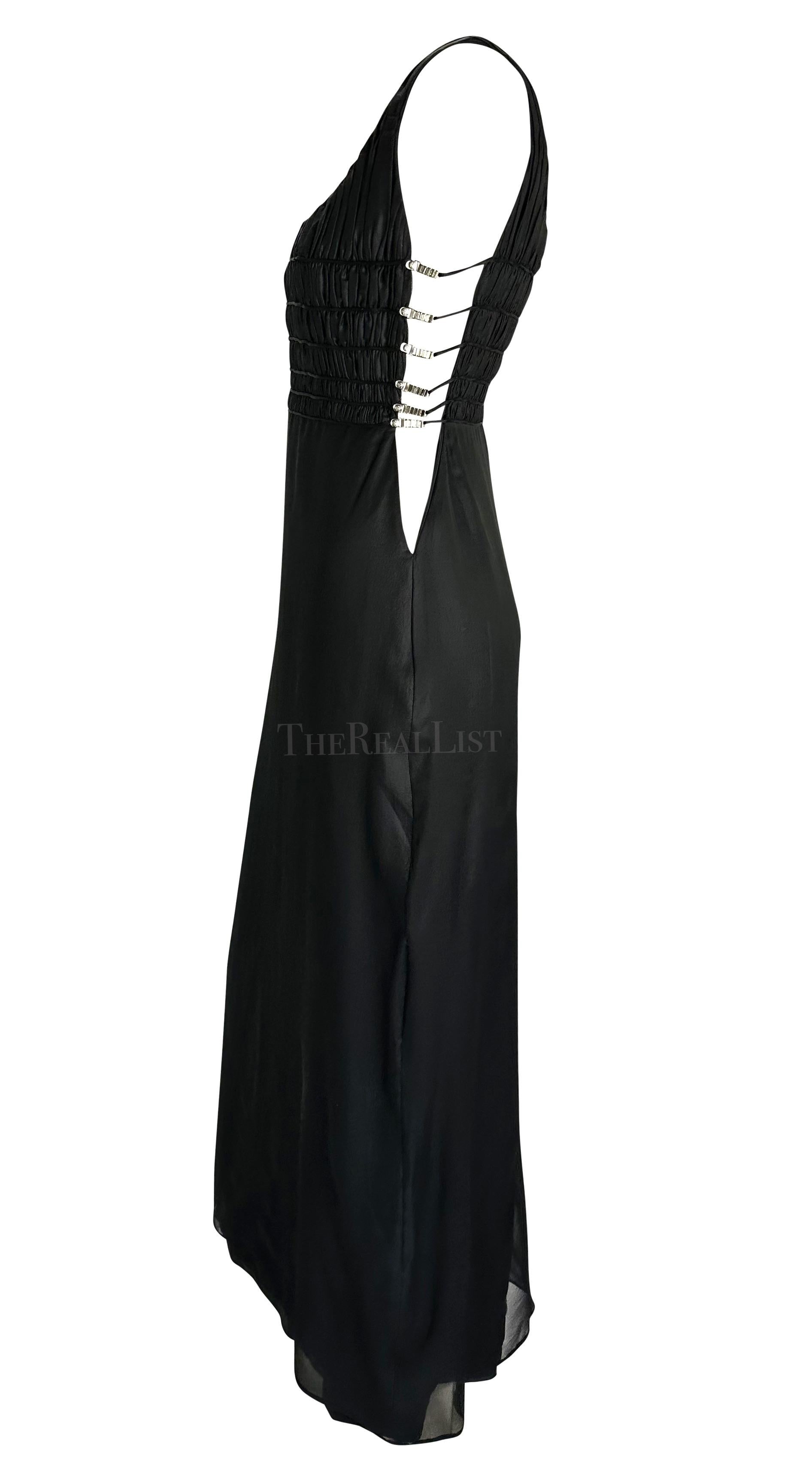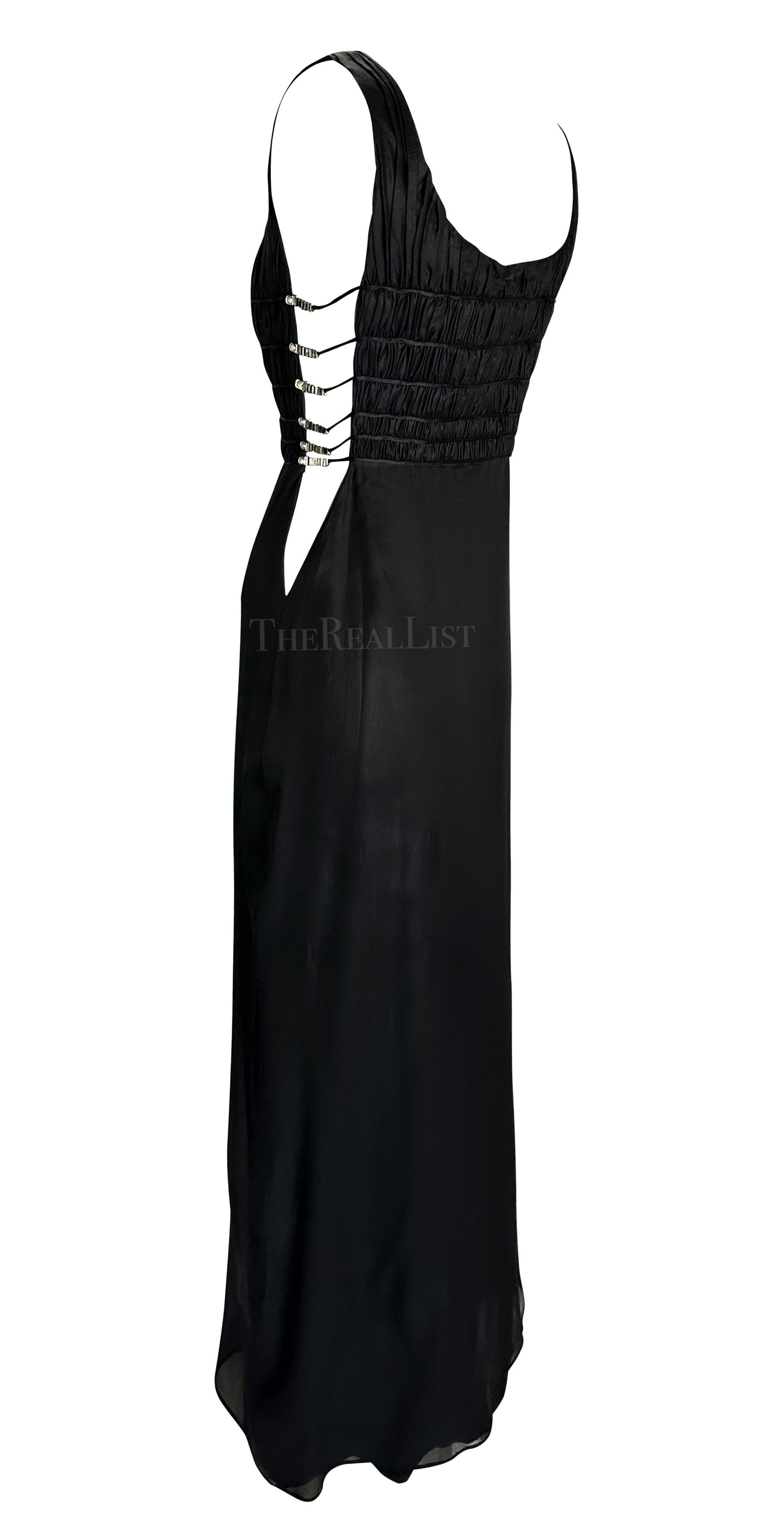 Presenting a black silk chiffon Grecian/Roman-style gown by Donatella for Gianni Versace Couture. As part of the Fall/Winter 1998 collection, this dress represents Donatella's first F/W collection at the helm of Versace after Gianni's death in 1997. Donatella's choice to reference ancient iconography stays true to her brother's well-established design principles. This piece features a revealing side slit accented with baguette rhinestoned Medusa hooked straps, continuing around the ruched bodice. Featured in the runway presentation on Natalia Semanova and on Jade Parfitt in the season's ad campaign shot by Steven Meisel.