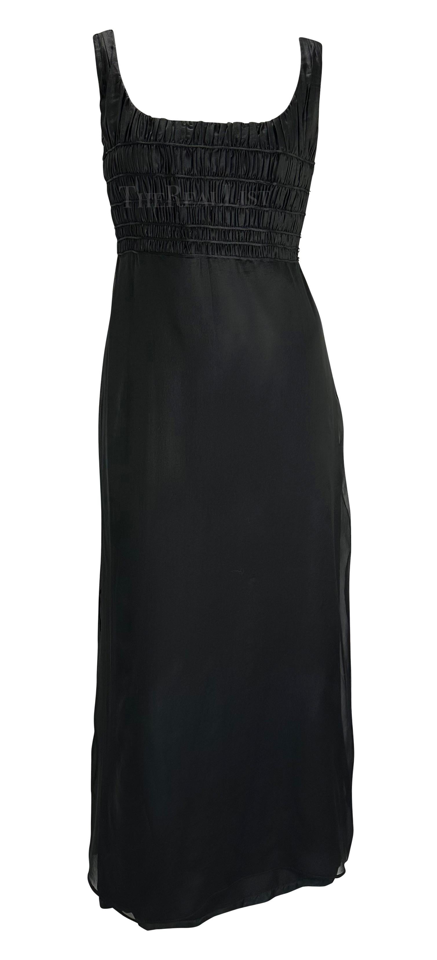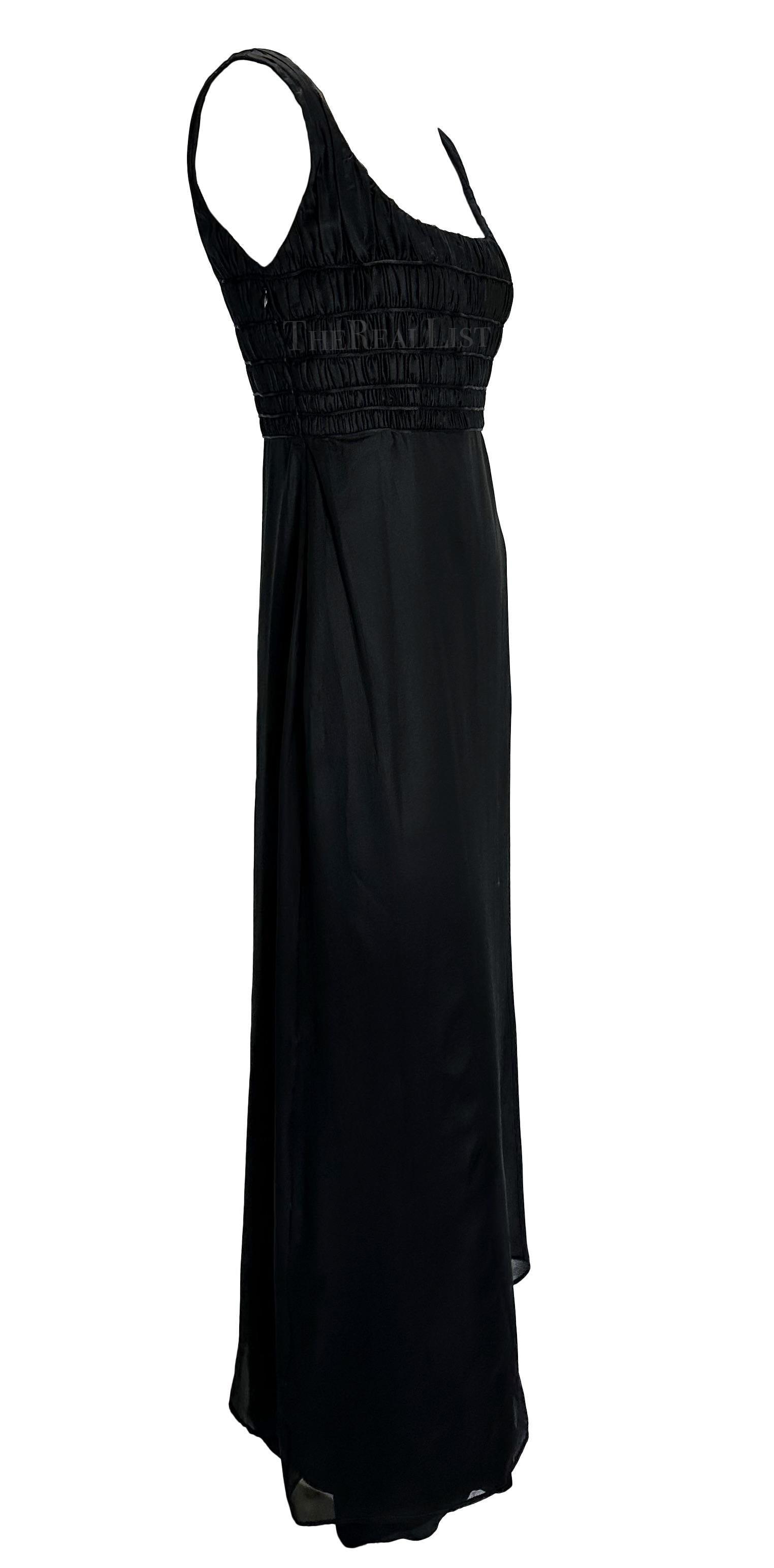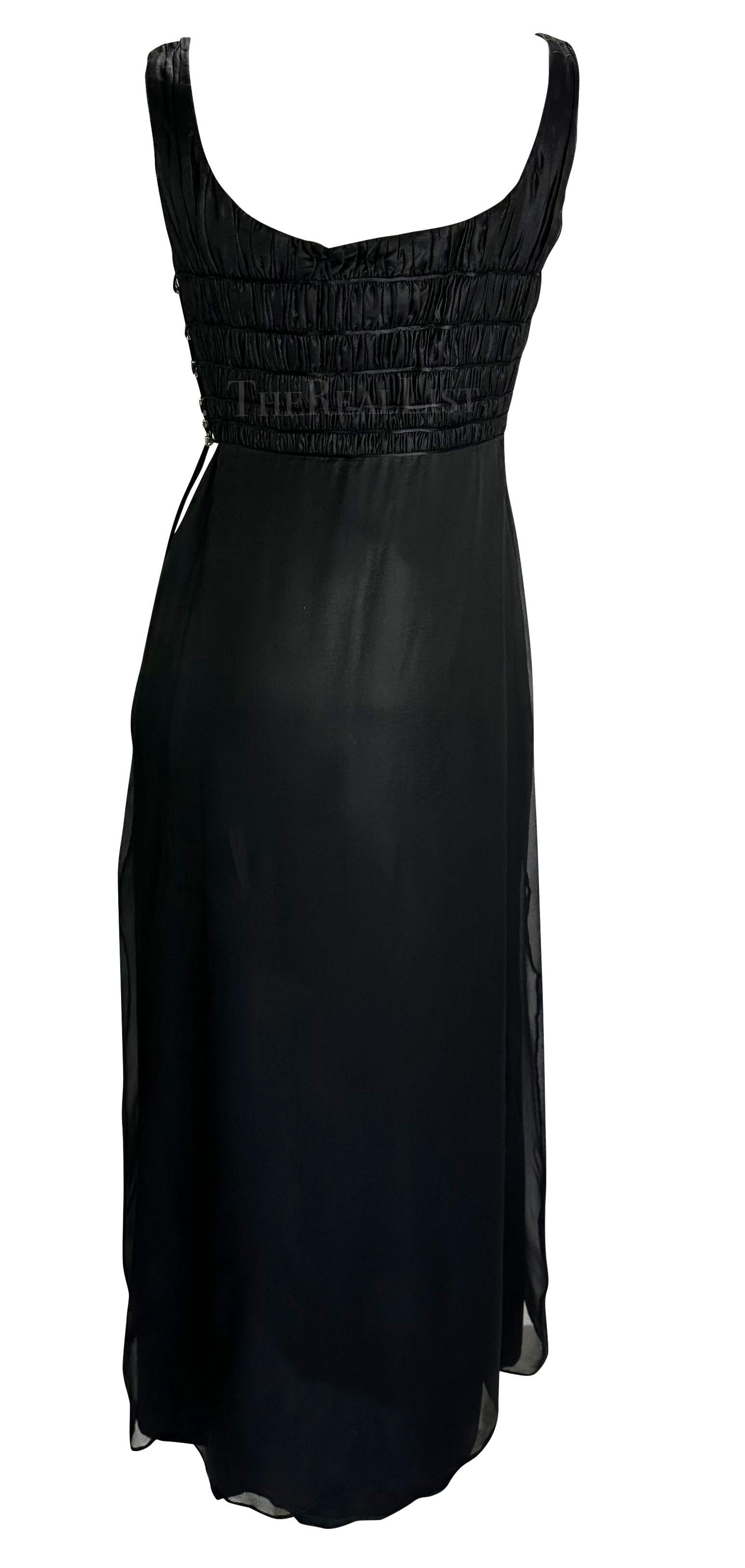 Presenting a black silk chiffon Grecian/Roman-style gown by Donatella for Gianni Versace Couture. As part of the Fall/Winter 1998 collection, this dress represents Donatella's first F/W collection at the helm of Versace after Gianni's death in 1997. Donatella's choice to reference ancient iconography stays true to her brother's well-established design principles. This piece features a revealing side slit accented with baguette rhinestoned Medusa hooked straps, continuing around the ruched bodice. Featured in the runway presentation on Natalia Semanova and on Jade Parfitt in the season's ad campaign shot by Steven Meisel.