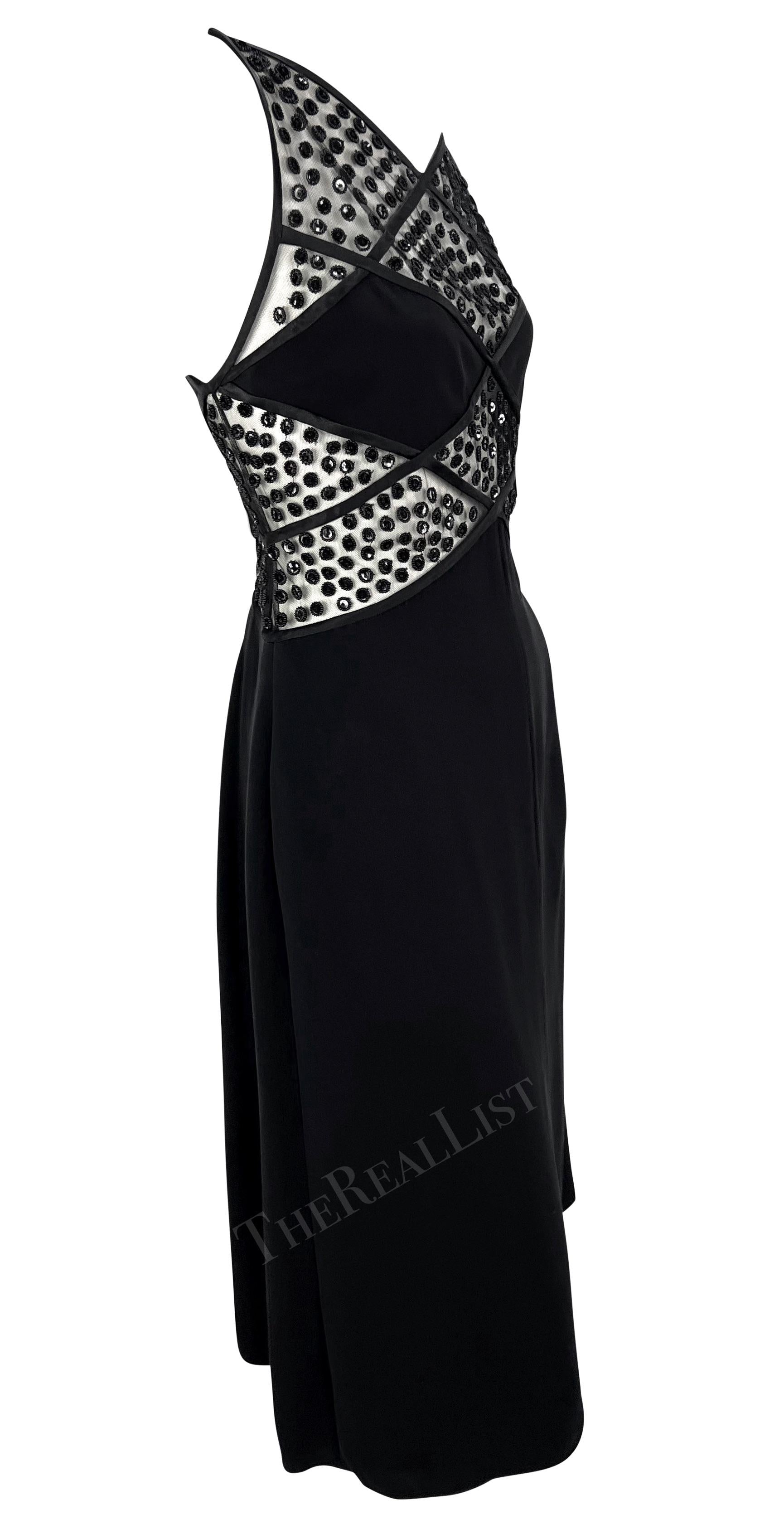 Introducing a fabulous black Valentino mini dress from the Fall/Winter 2001 collection. This ultra-sexy dress showcases diamond panels above the waistline adorned with hand-sewn clusters of sequins and beads. Black silk diamond panels cover the beasts and part of the back, allowing the midriff to be fully exposed. Never worn before, this Valentino mini dress comes complete with the original brand tags still attached to the dress.