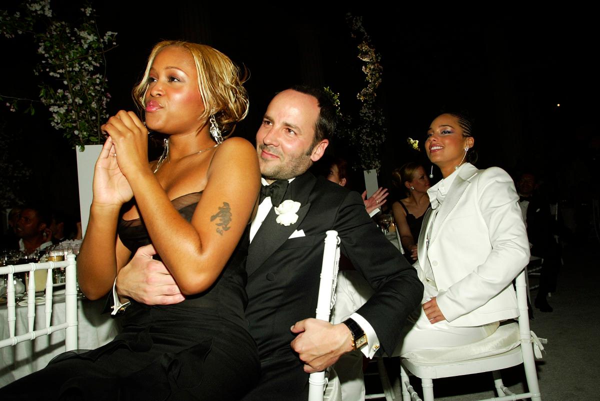 This Tom Ford for Gucci black ruffled evening gown from the Fall/Winter 2003 collection is a rare archival piece. While not shown on the runway or in the campaign, the design mirrors the gown worn by Eve to the 2003 Met Gala. The dress features a plunging neckline secured with a leather strap, an open back with a web of leather detailing, and additional leather accents at the waist that emphasize the silhouette. Cascading ruffles along the skirt and a sweeping train complete the dramatic design. New with tags, this unworn Tom Ford for Gucci gown is an exceptional investment-worthy piece for collectors and a striking statement for red carpet and gala events.