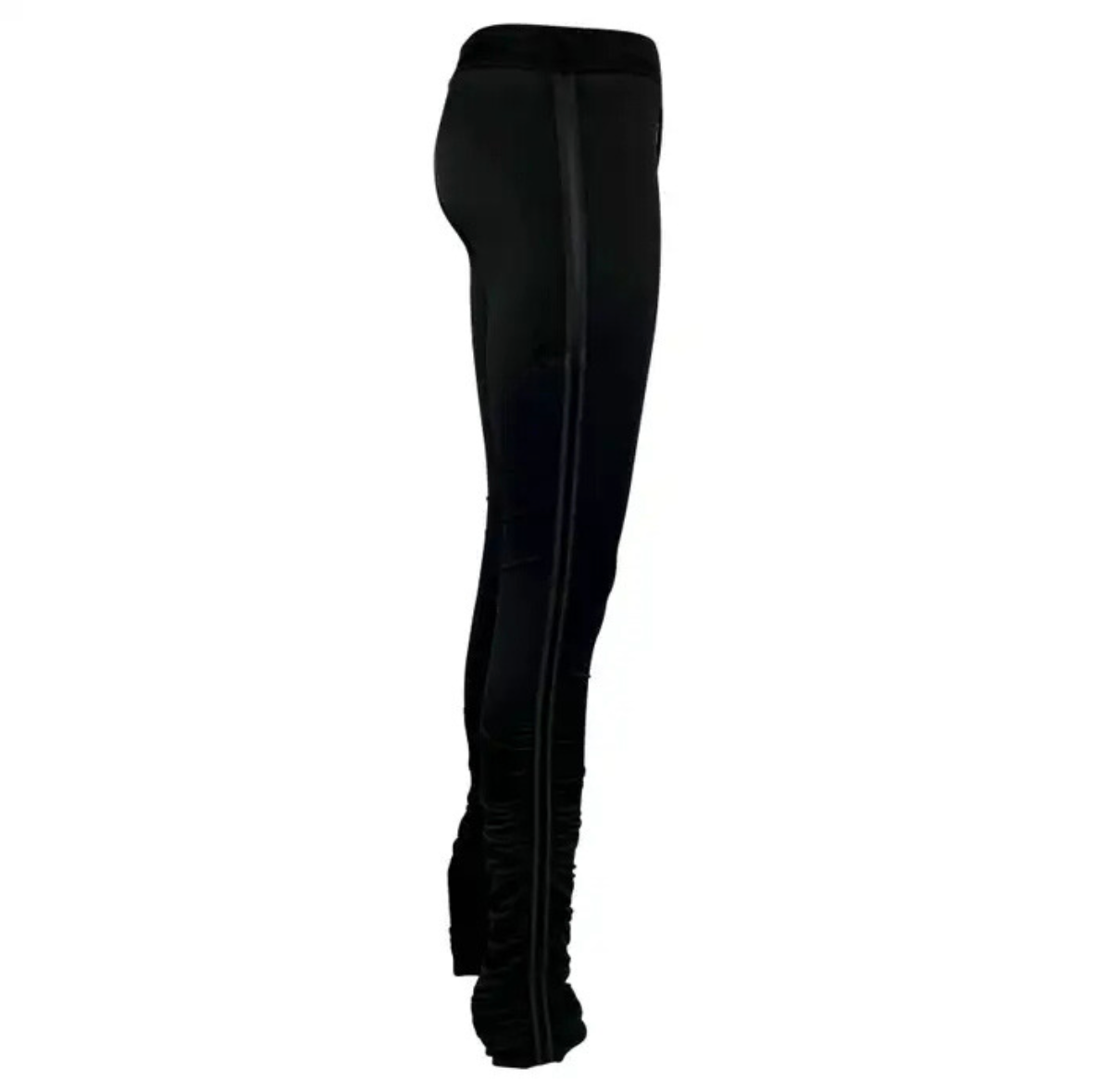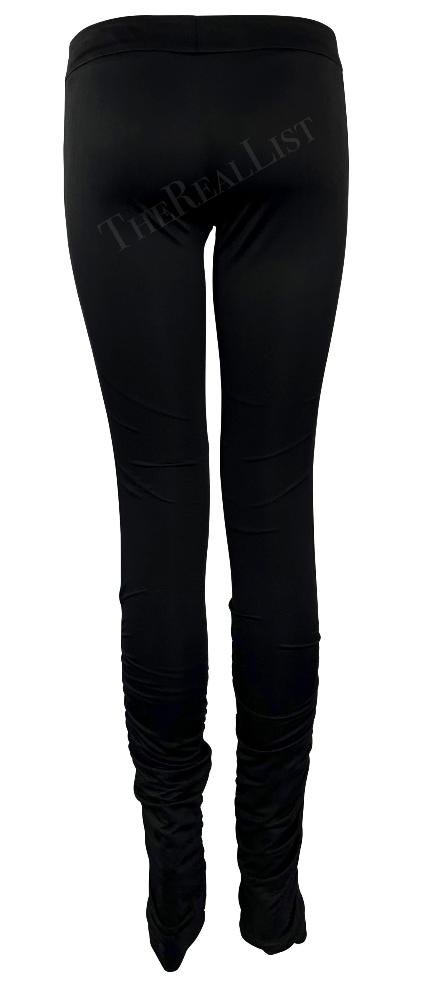 These new-with-tags Gucci pants from the Fall/Winter 2004 collection by Tom Ford are crafted in black stretch fabric and detailed with tonal ribbon trim running down each leg. The design features a slim fit with ruched accents along the back of the legs, creating texture and elongation. Part of Ford's final collection at Gucci, these pants are reminiscent of the ruched pants from Gucci's Fall/Winter 1999 collection.