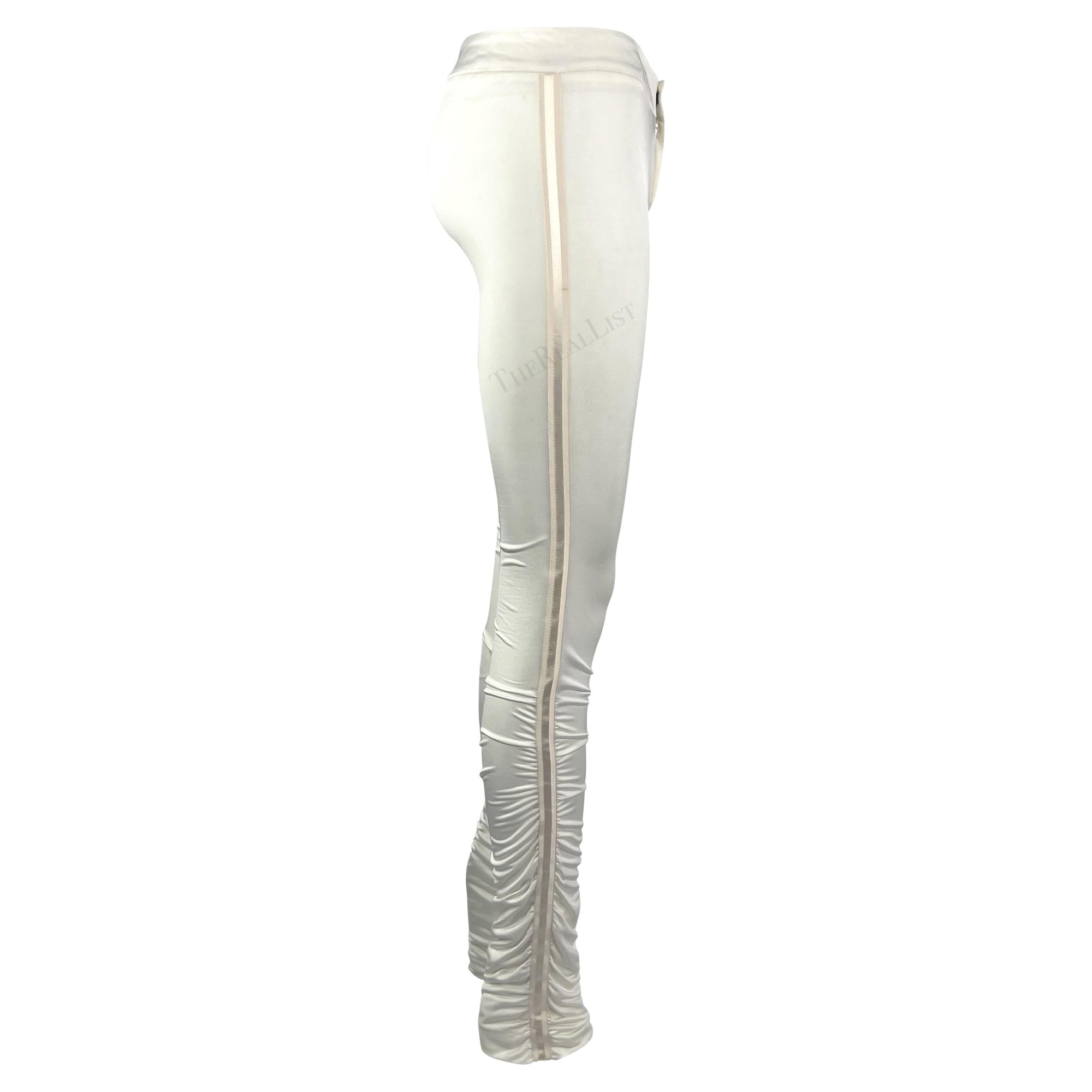 Presenting a pair of white Gucci pants, designed by Tom Ford. From the Fall/Winter 2004 collection, these form-fitting satin pants feature ruching at the calves and are made complete with a monochrome striped ribbon on either side. Never worn before, these fabulous Gucci by Tom Ford pants are made complete with the original brand tags still attached. Part of Ford's final collection at Gucci, these pants are reminiscent of the ruched pants from Gucci's Fall/Winter 1999 collection.