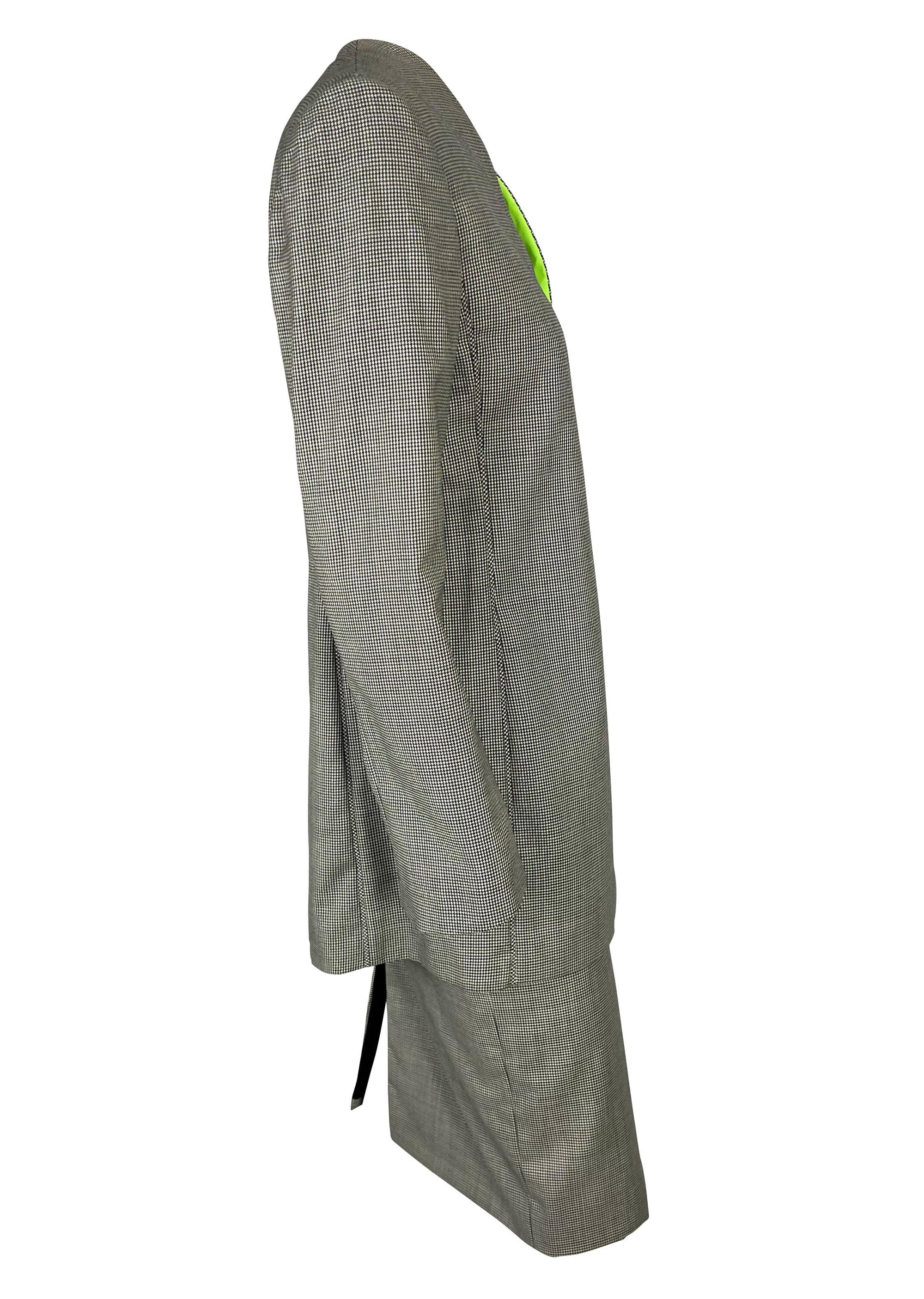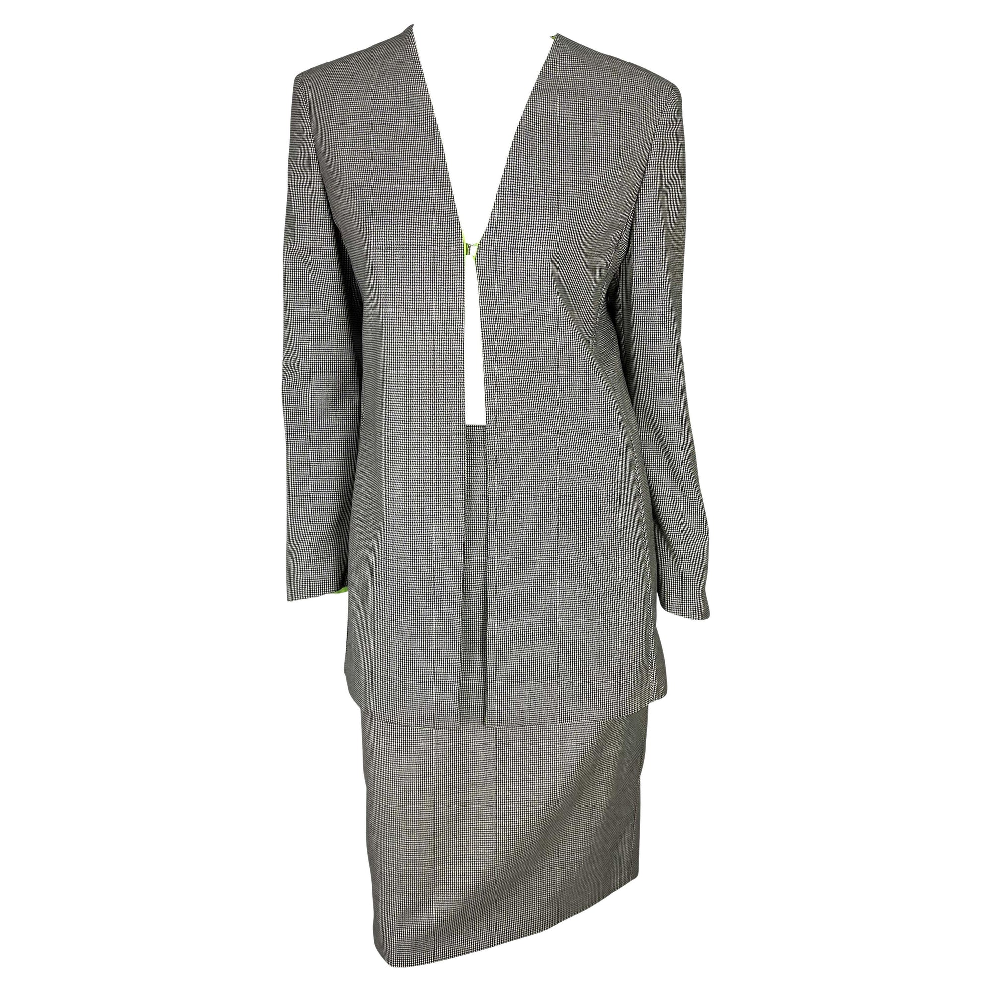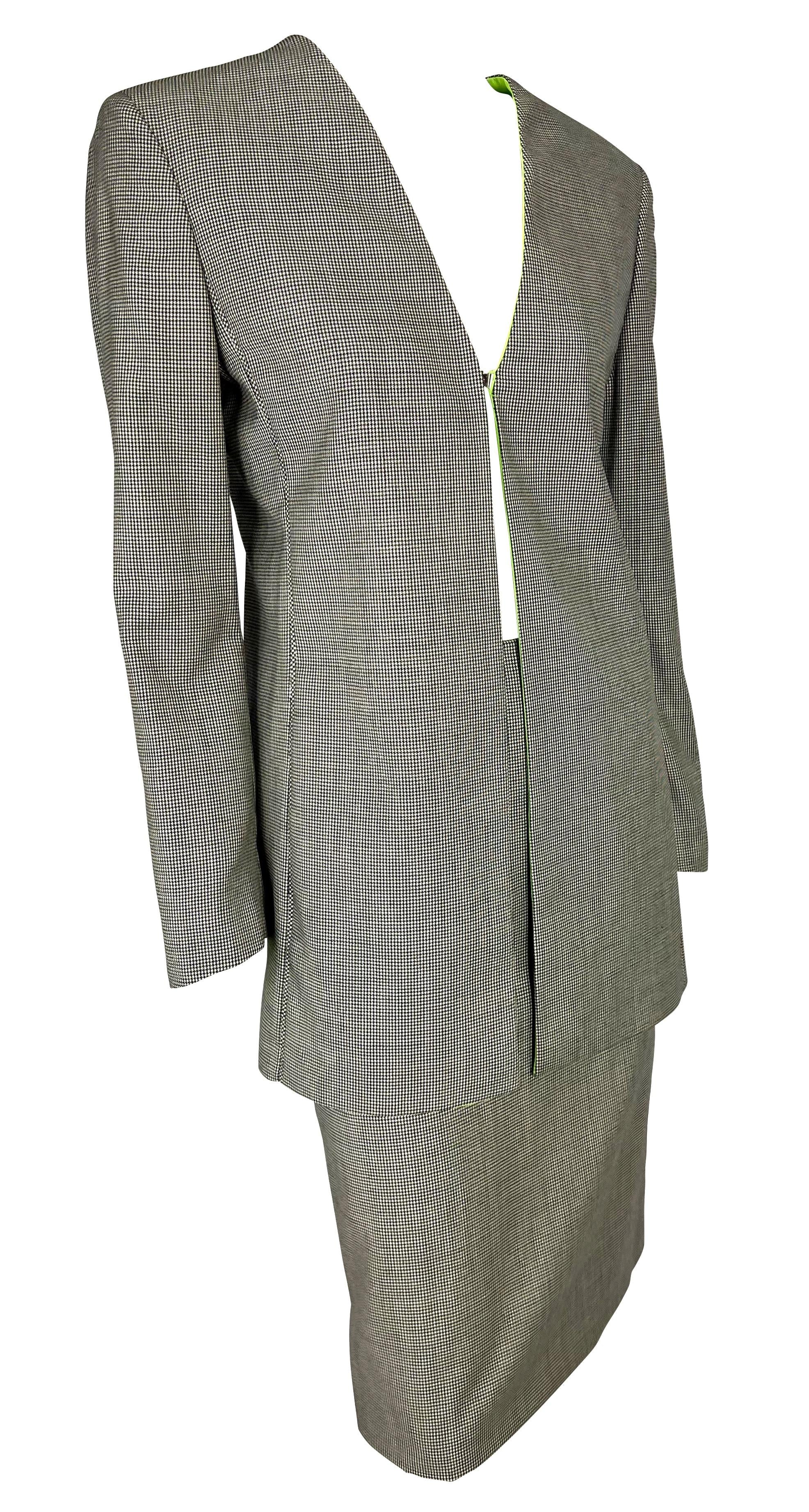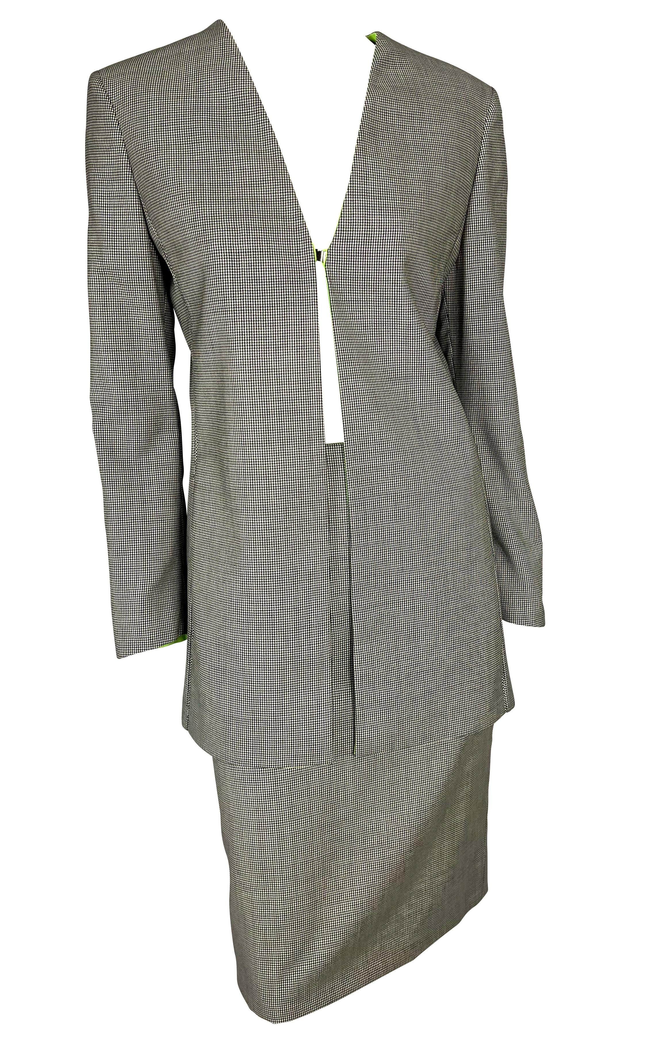 Presenting a fabulous grey houndstooth Gianni Versace tunic suit designed by Donatella Versace. From the Spring/Summer 1998 collection, a similar open-front jacket debuted on the season's runway. This fabulous set is comprised of a tunic-style coat and matching pencil skirt. The jacket features a deep v-neckline with an interior hook closure. The set features a bright green lining that pokes through the coat and at the skirt's back slit. Never worn before, this set is made complete with the original brand tags from nearly 25 years ago.
