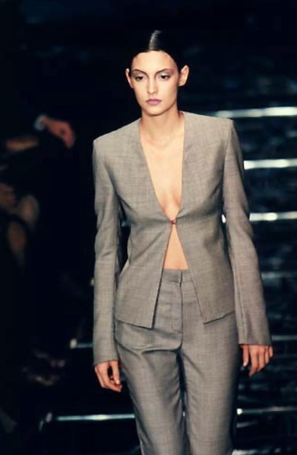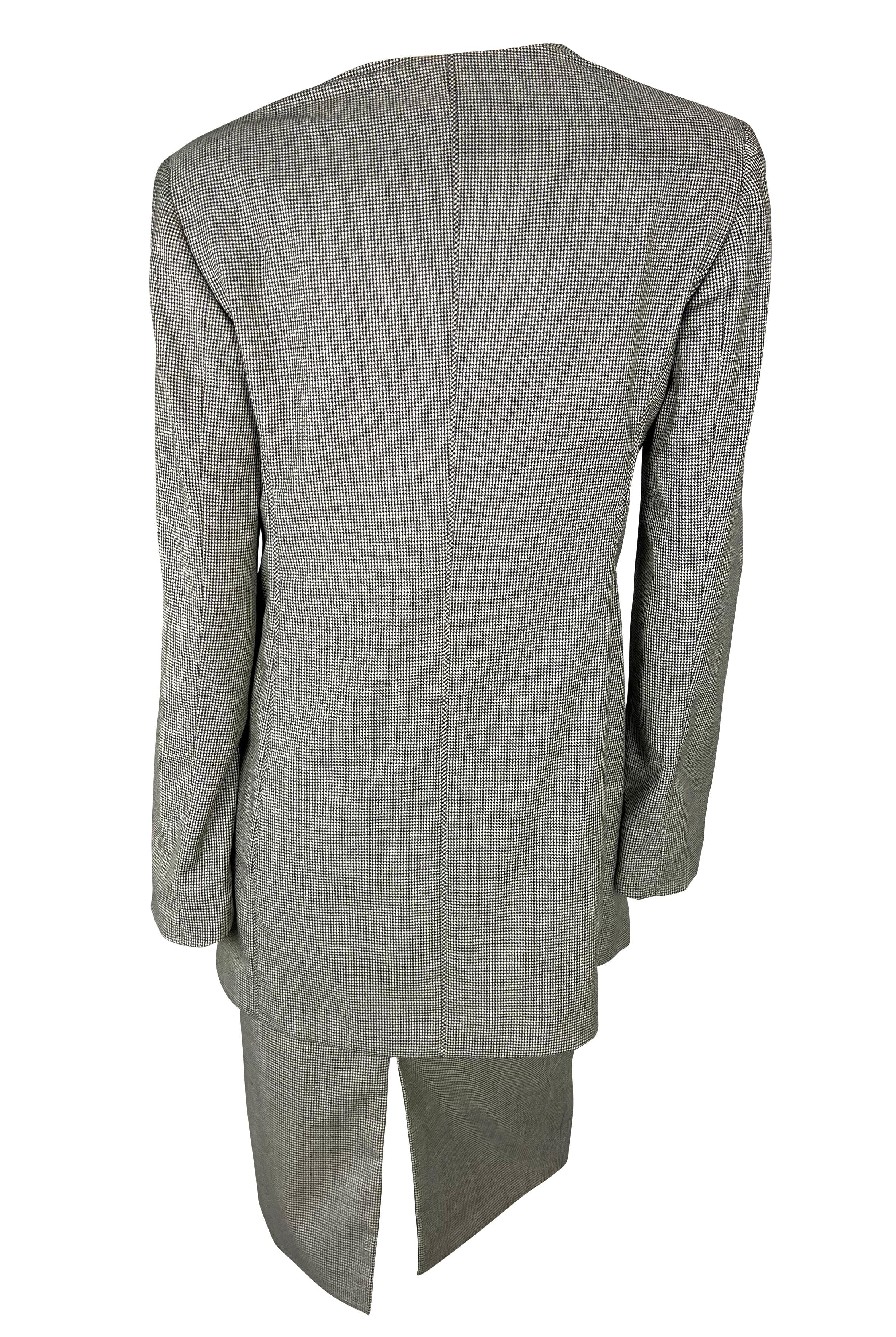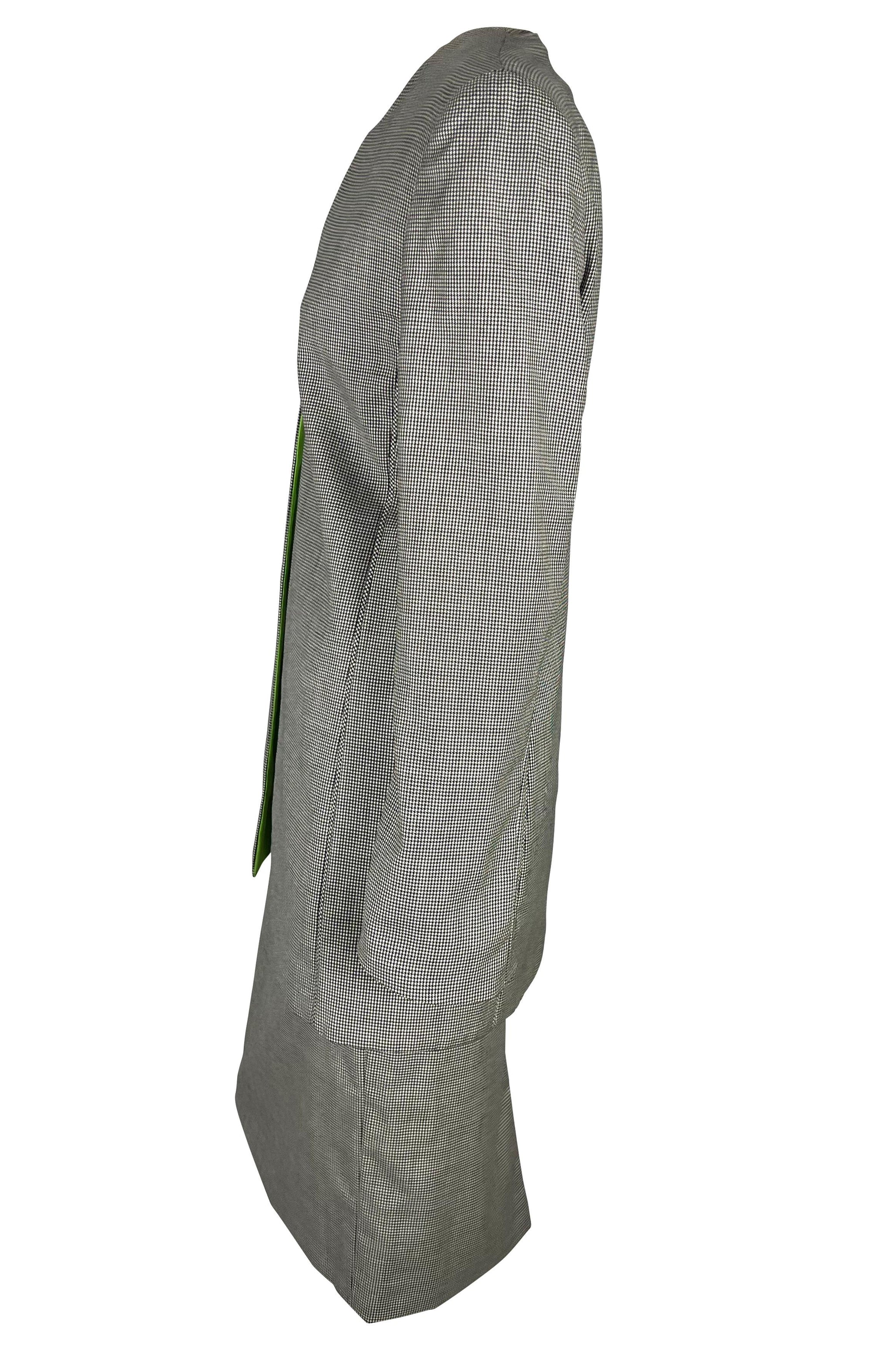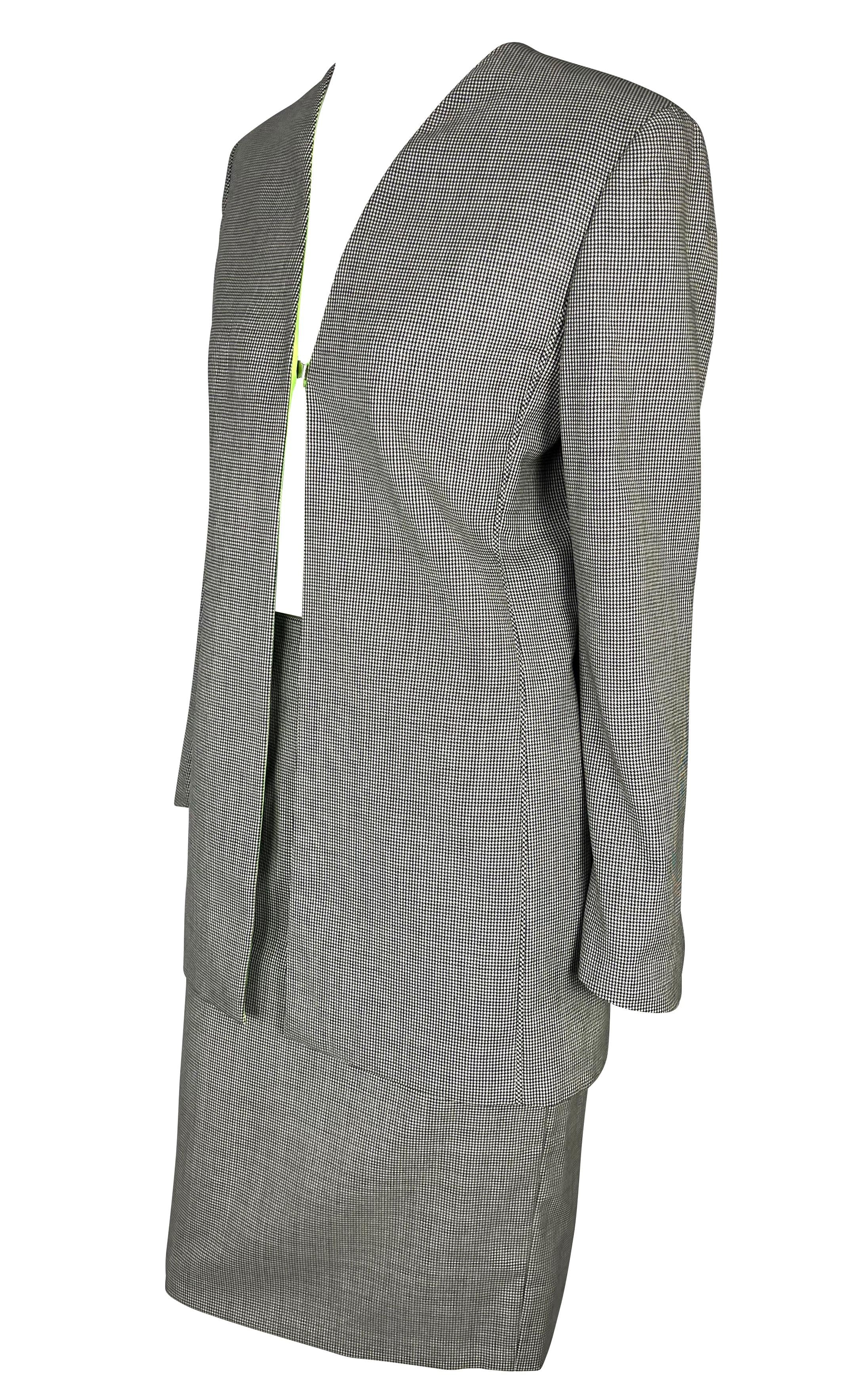 Presenting a fabulous grey houndstooth Gianni Versace tunic suit designed by Donatella Versace. From the Spring/Summer 1998 collection, a similar open-front jacket debuted on the season's runway. This fabulous set is comprised of a tunic-style coat and matching pencil skirt. The jacket features a deep v-neckline with an interior hook closure. The set features a bright green lining that pokes through the coat and at the skirt's back slit. Never worn before, this set is made complete with the original brand tags from nearly 25 years ago.