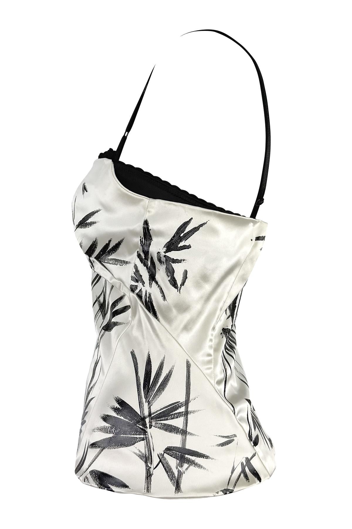 From Dolce & Gabbana’s Spring/Summer 1999 collection, this white satin bustier top features a black bamboo motif hand-painted across its fitted silhouette. This never worn piece is finished with interior black bra with lace trim and adjustable straps.