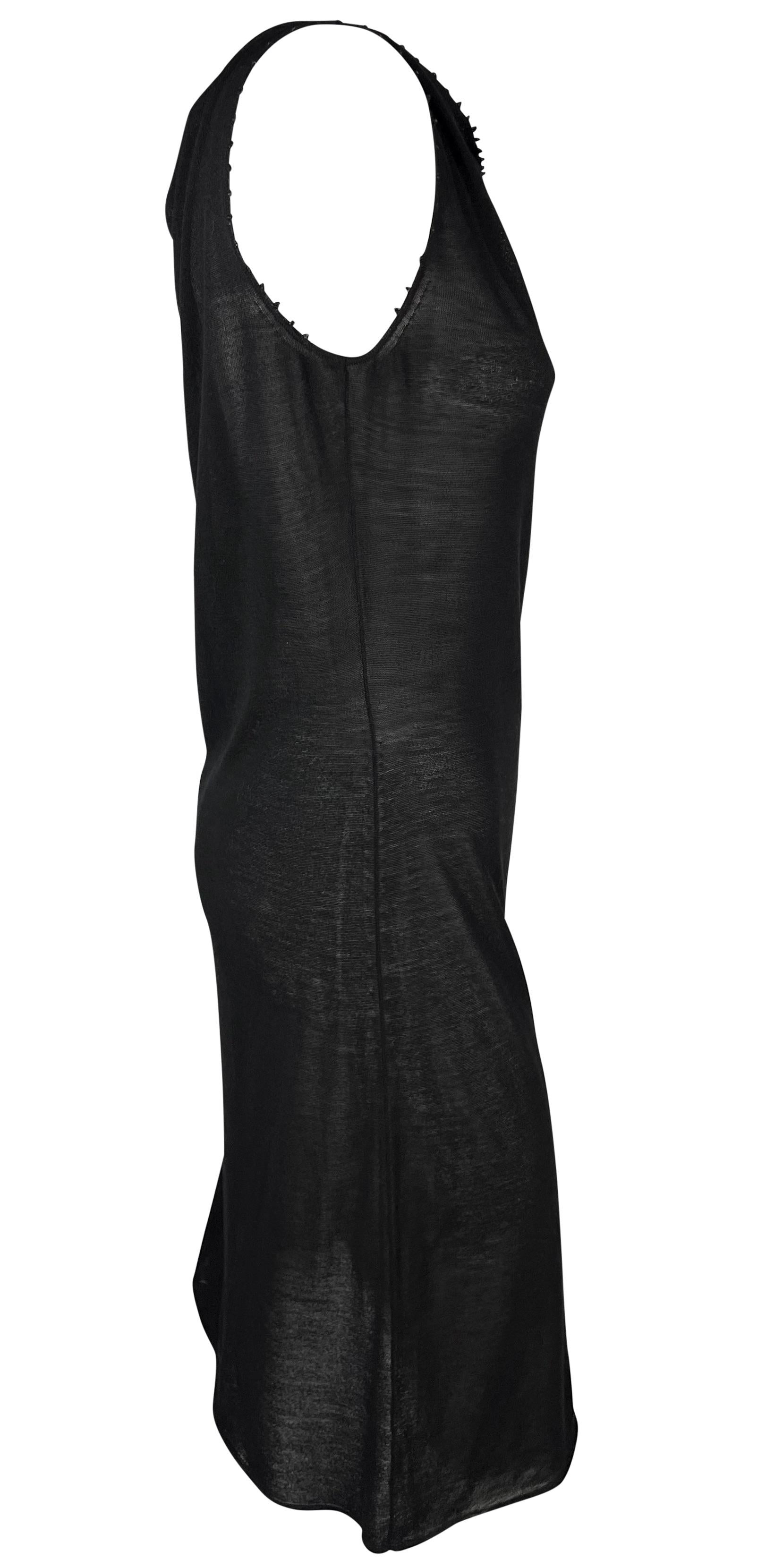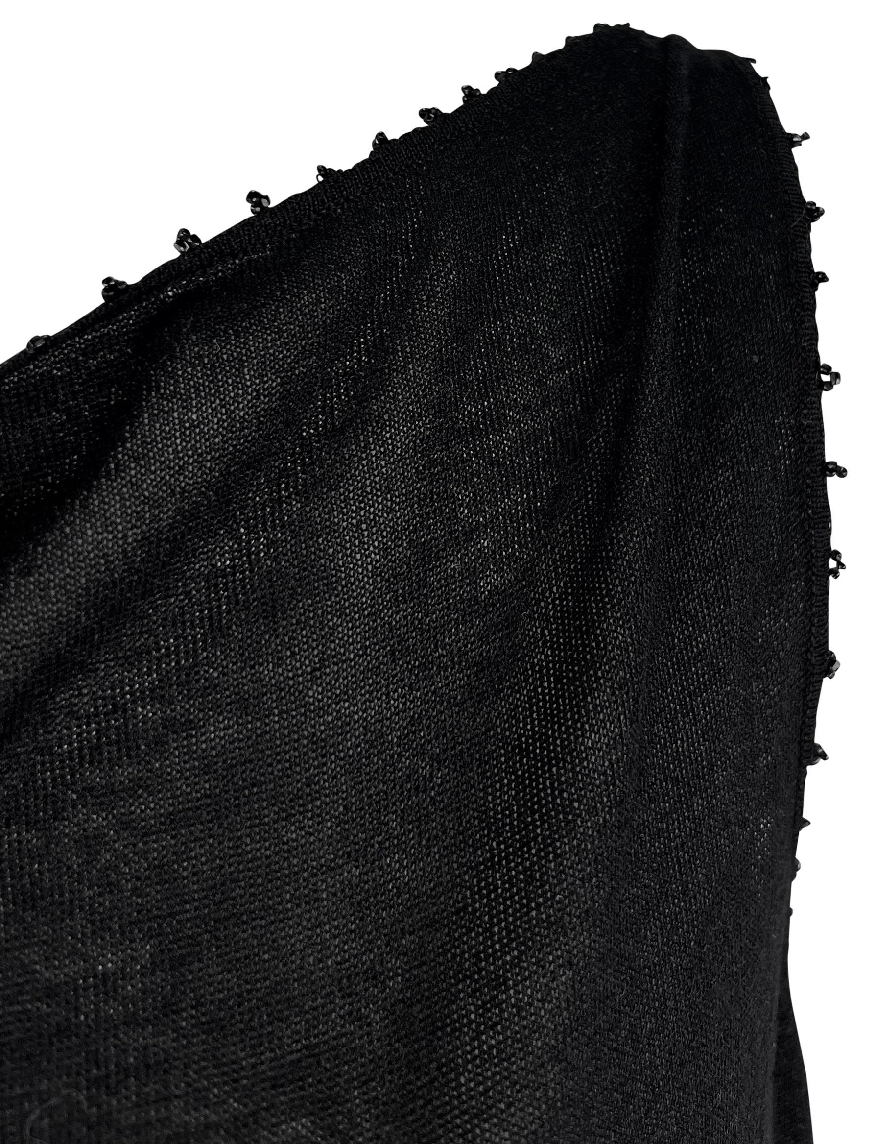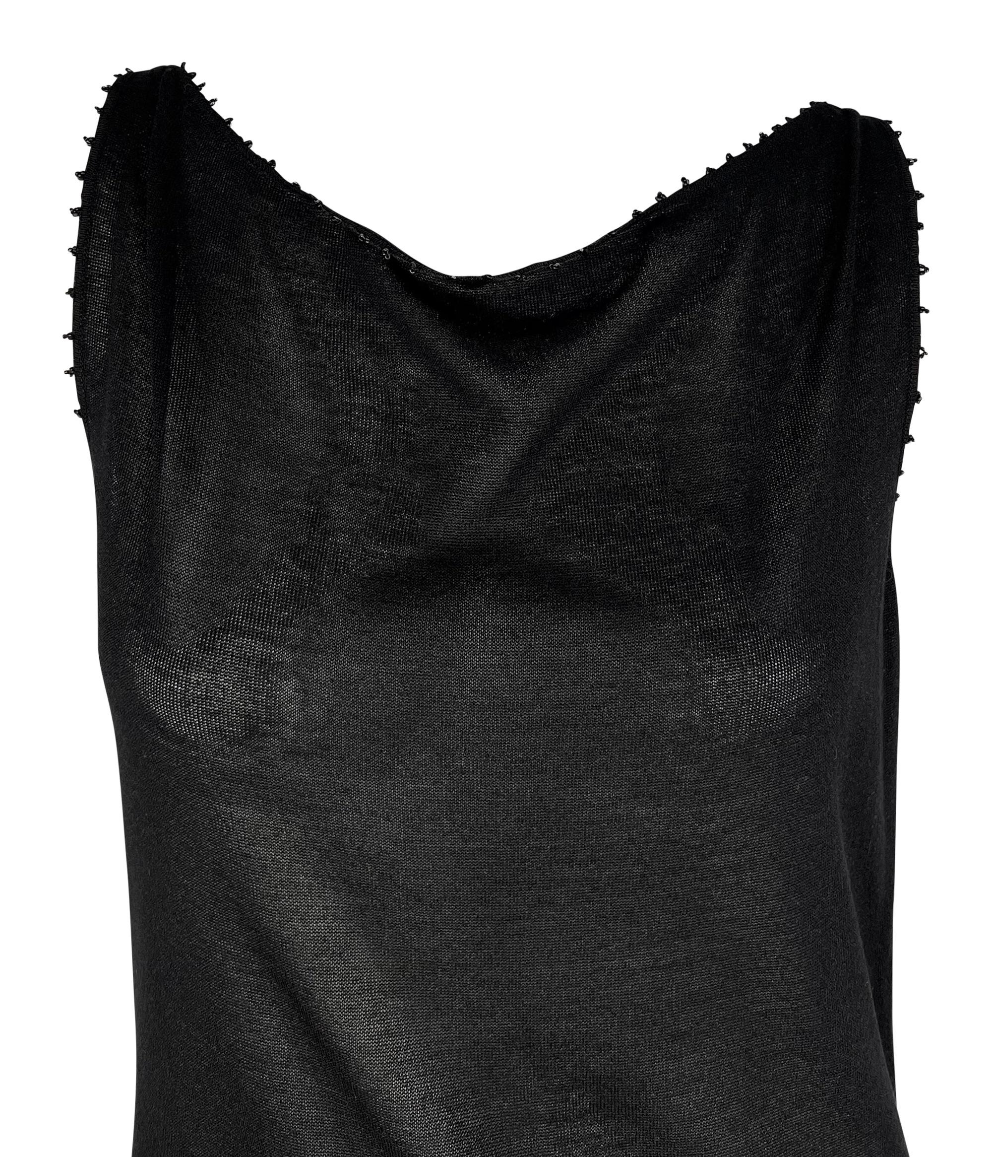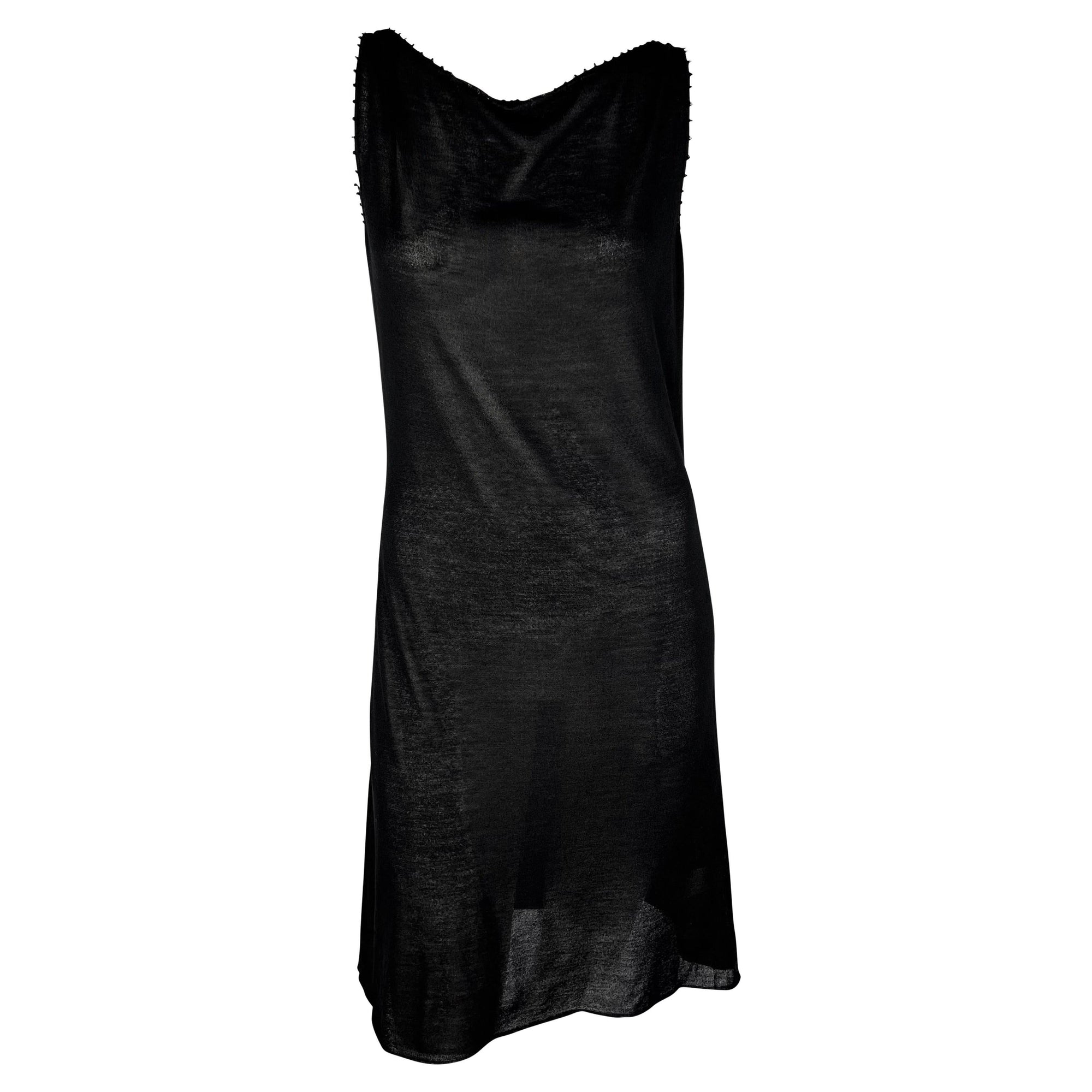 Accented with black caviar beads around the neckline and sleeve openings, this sheer black Gucci by Tom Ford knit dress has never been worn before and comes with the original tags still attached. This mini dress from the Spring/Summer 1999 collection features a flare cut and a bateau neckline with a light pinch at the shoulder strap. Effortlessly chic and new with tags, this mini dress is a must-have for any Gucci by Tom Ford lover or collector.