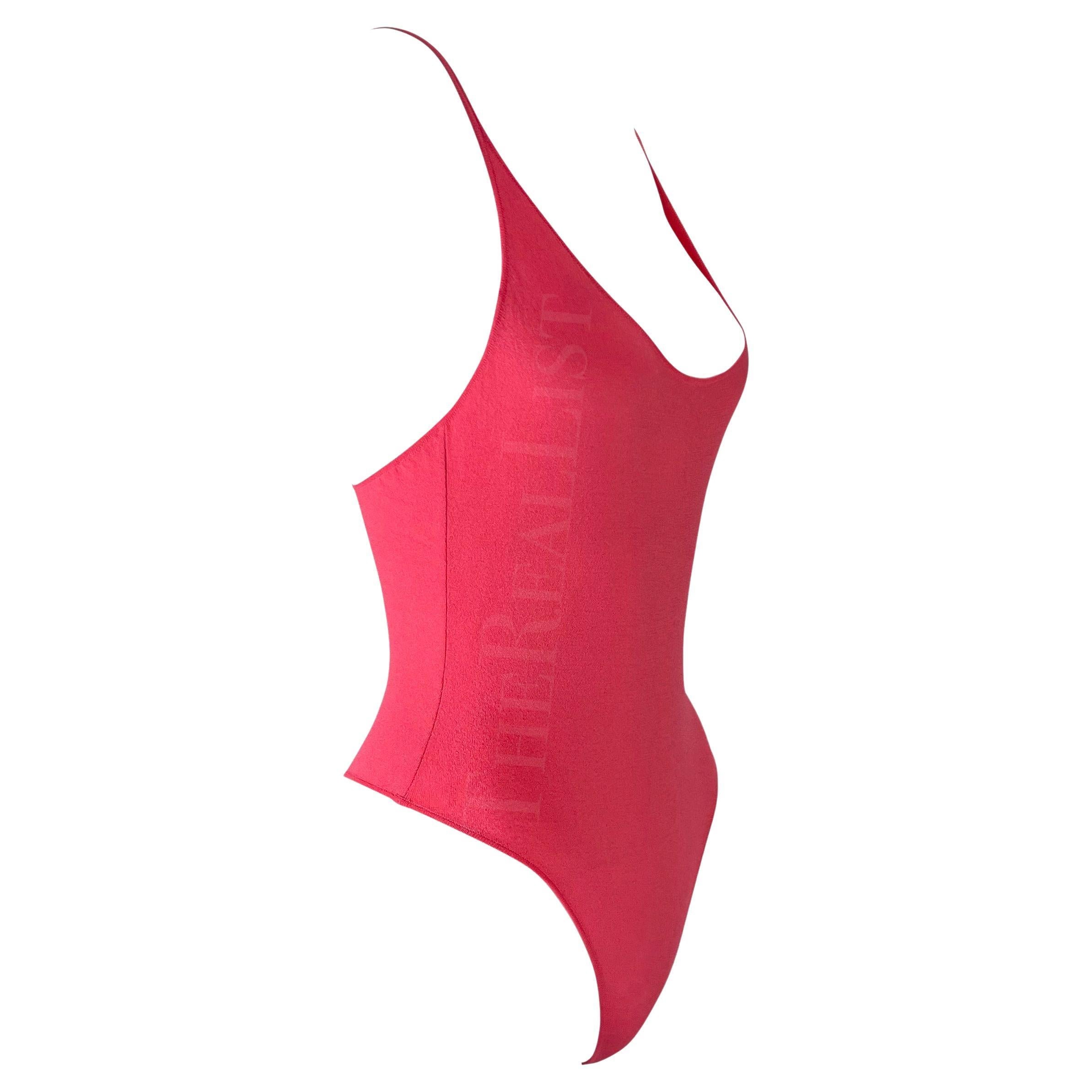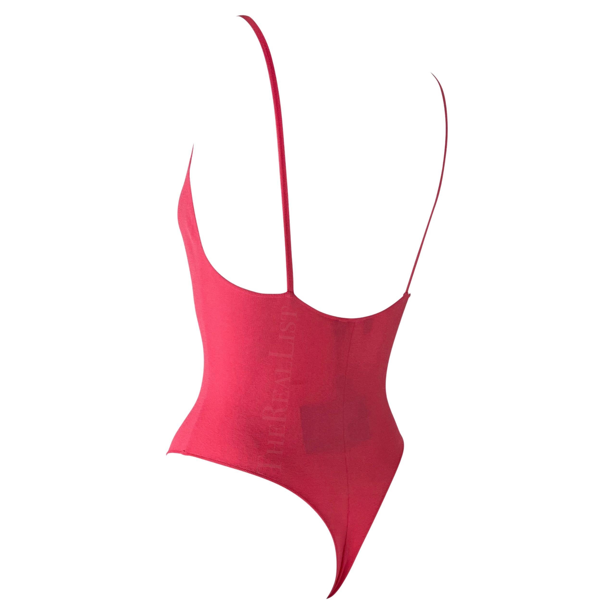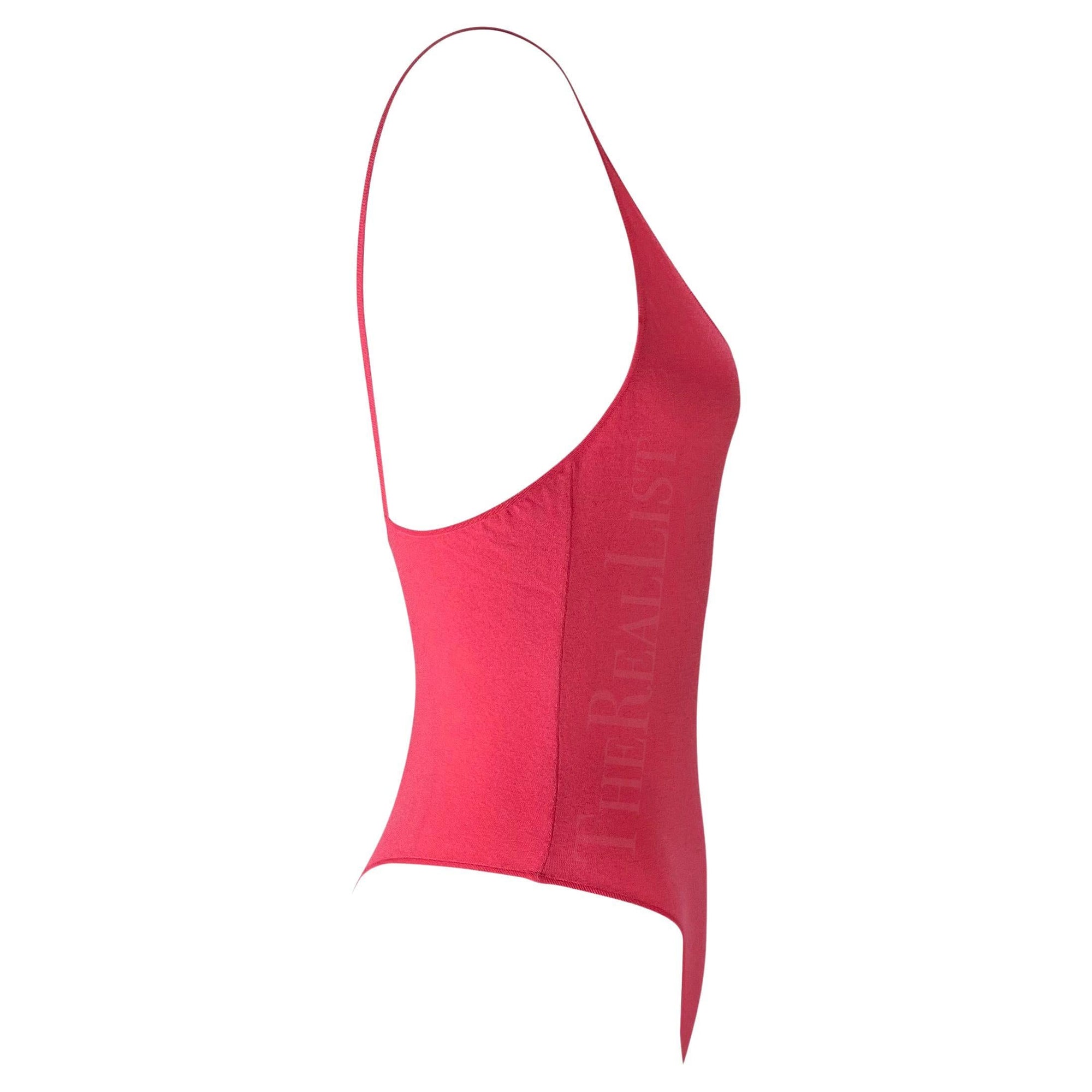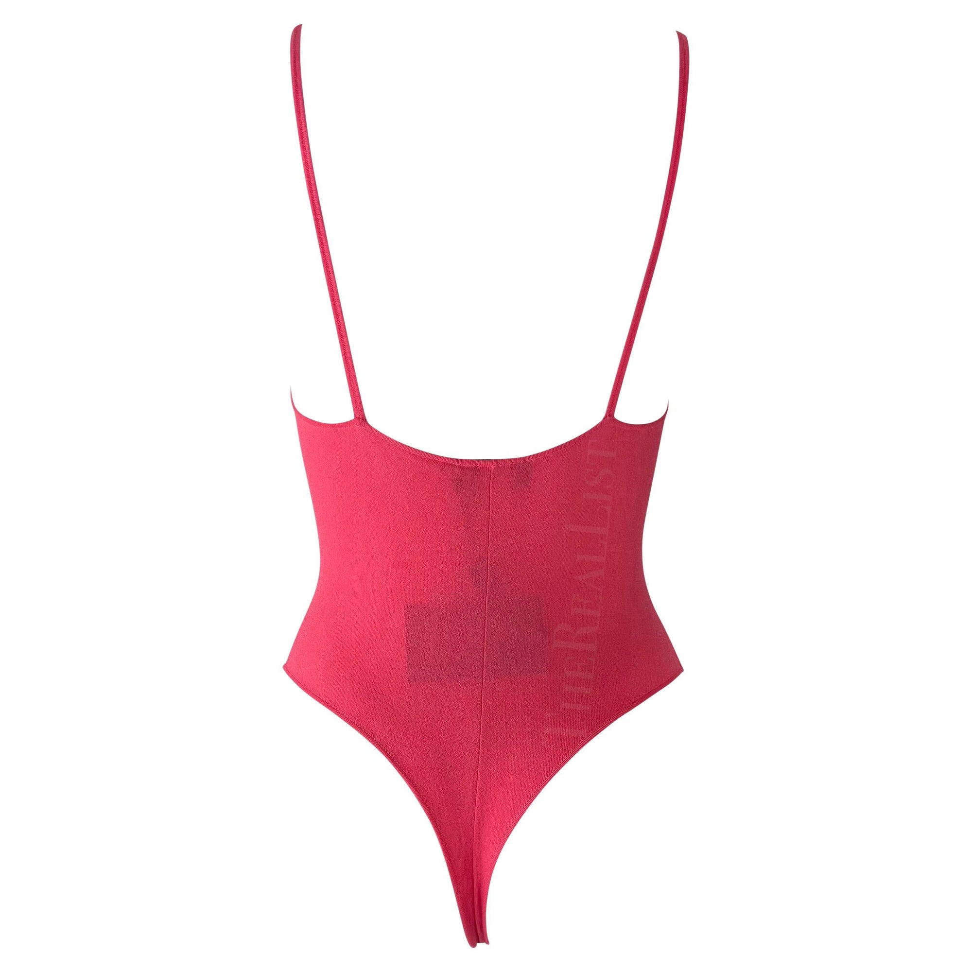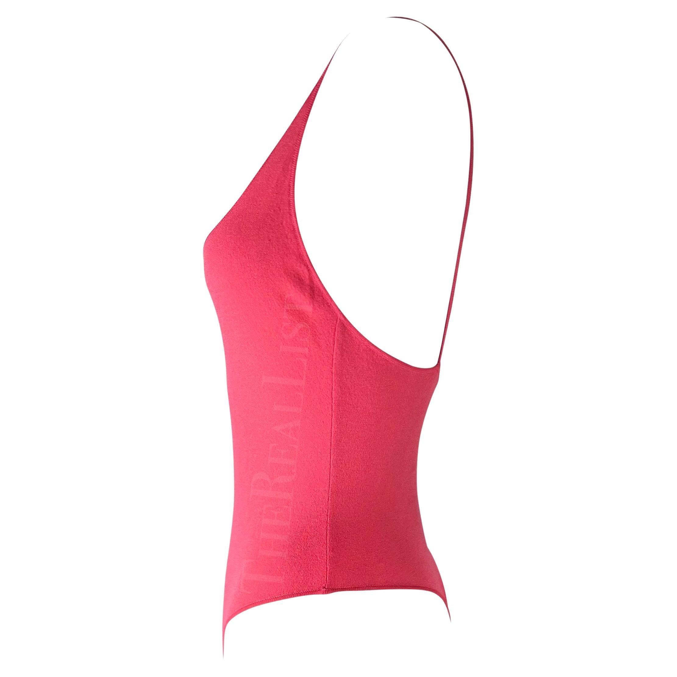 Presenting a fabulous neon pink Gianni Versace bodysuit, designed by Donatella Versace. From the Spring/Summer 2003 collection, this bodysuit debuted on the season's runway as part of look 36 modeled by Georgina Grenville. This stretchy bodysuit features a wide scoop neckline, spaghetti straps, and a low back. Never worn before, this rare piece is made complete with the original tags still attached from 20 years ago!