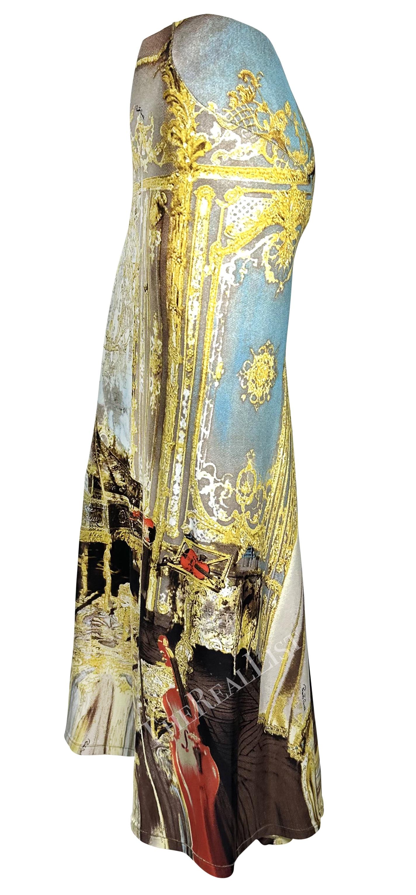 Presenting a fabulous baroque print Roberto Cavalli high-waisted maxi skirt. From the Spring/Summer 2003 collection, this skirt depicts a baroque-style room with musical instruments. Similar prints were featured in the season's runway presentation. The skirt features a flared cut and is the perfect Y2K Roberto Cavalli addition to any wardrobe!