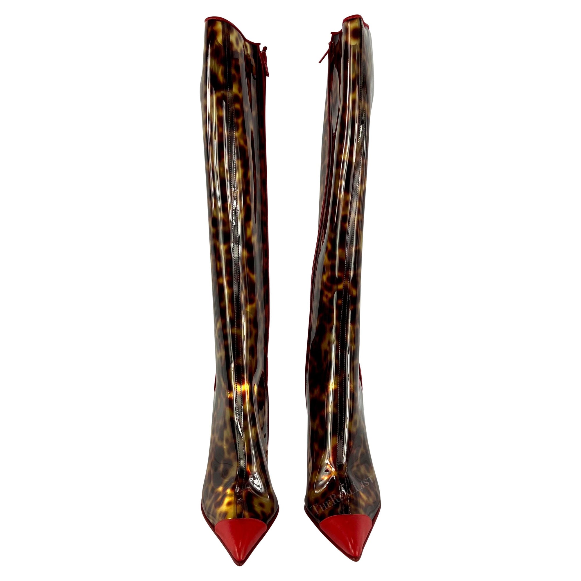Presenting a pair of spotted brown PVC Roberto Cavalli heeled boots. From the Spring/Summer 2003 collection, these fabulous boots are constructed of spotted brown PVC, reminiscent of tortoiseshell, and feature bright red leather accents. Never worn before, these pointed-heeled boots from over 20 years ago come complete with the original box.