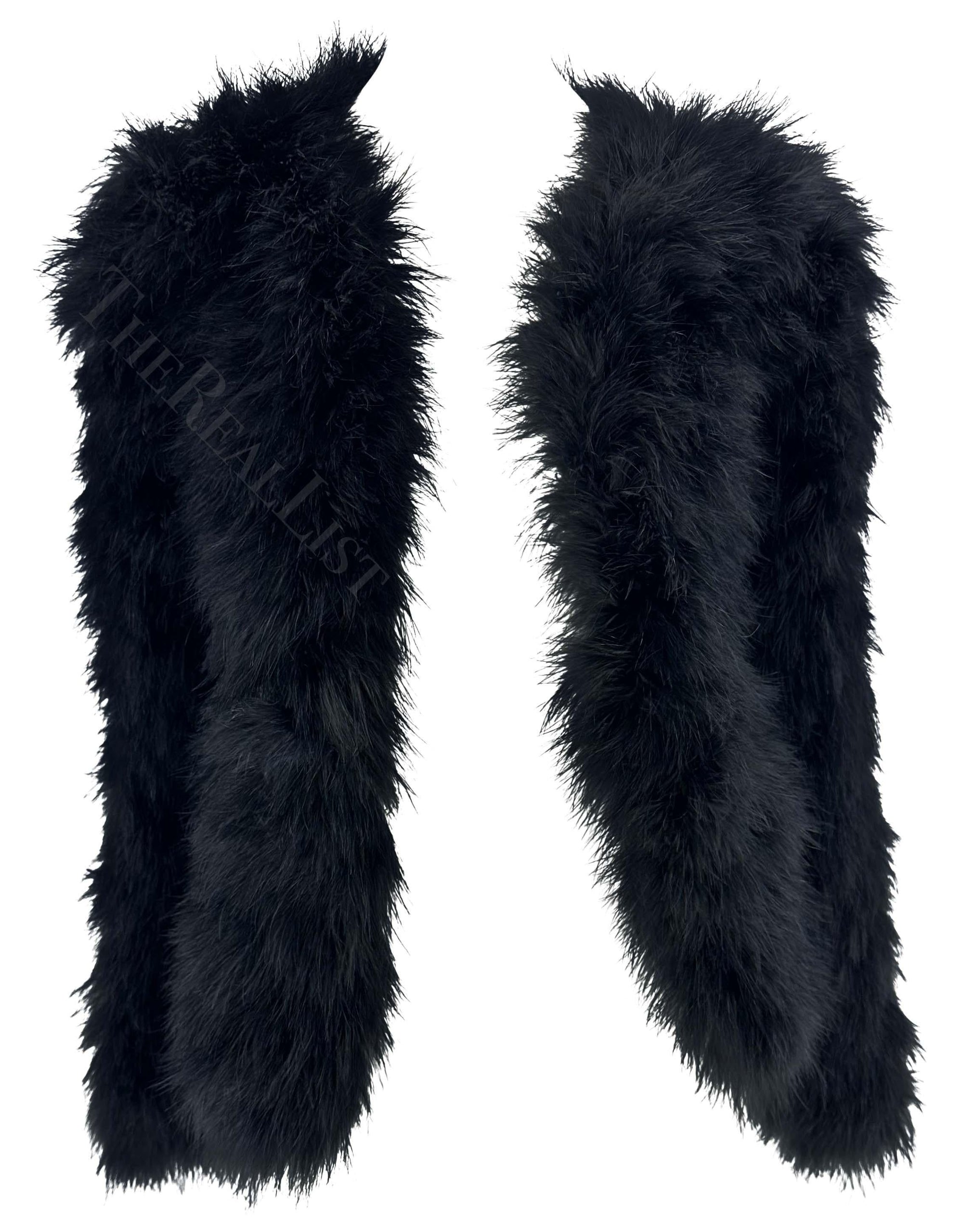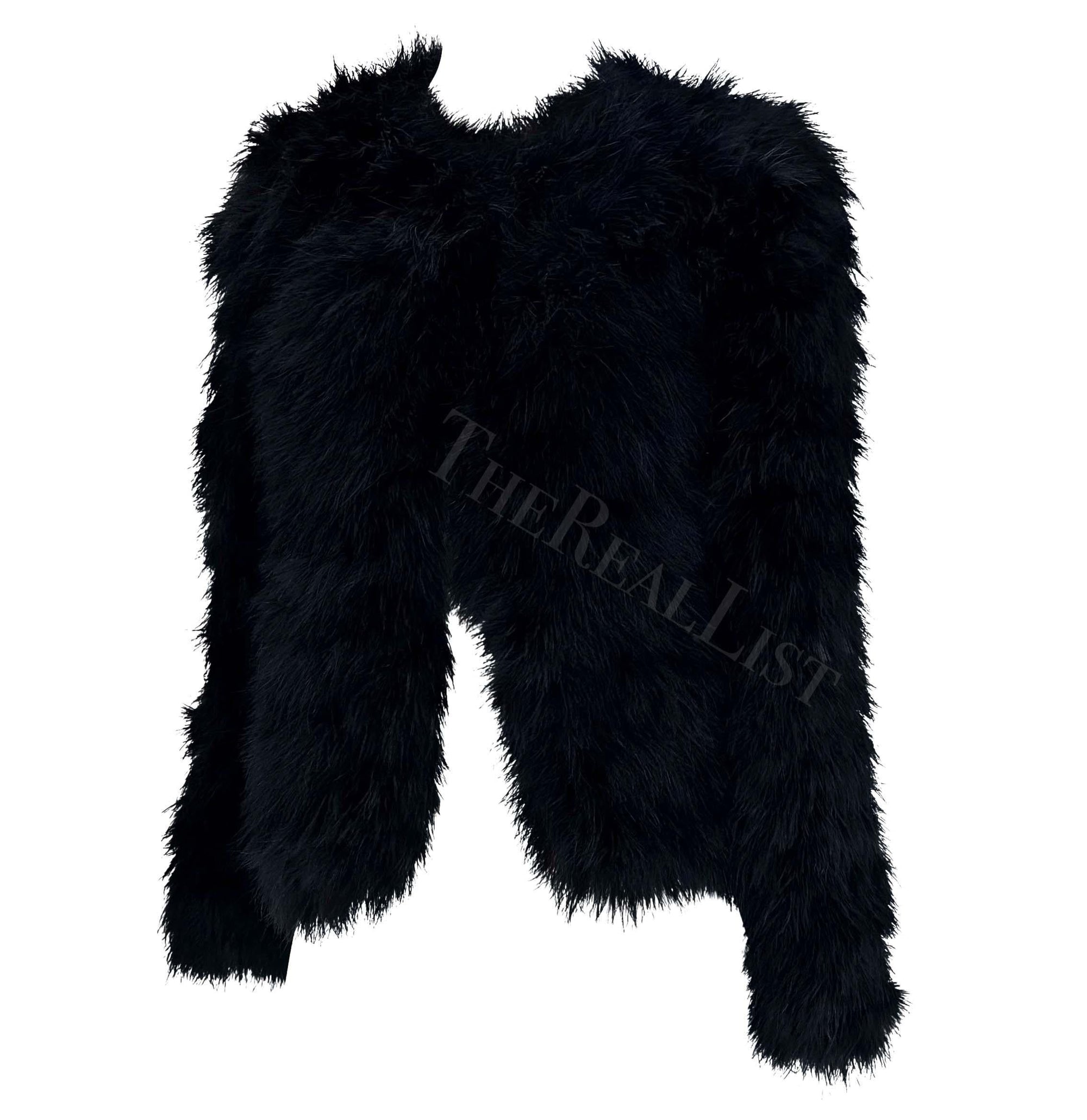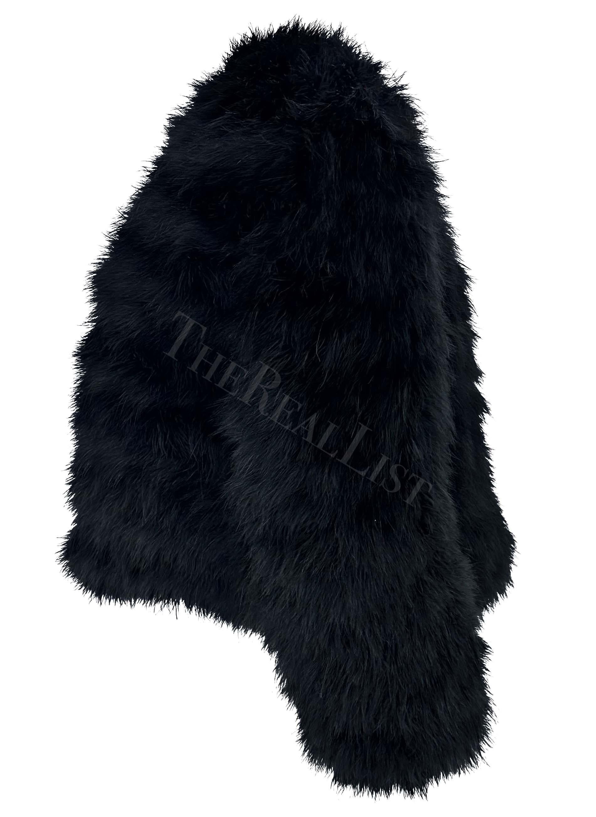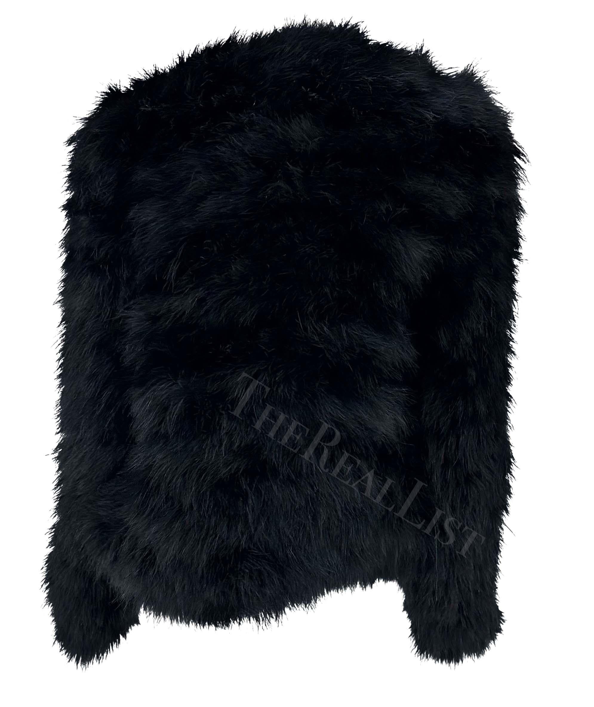 This incredible black caribou feather Gucci coat, designed by Tom Ford, is from the Spring/Summer 2004 collection. A cropped version of this luxurious coat made its debut on the runway as part of Look 35, worn by Mariacarla Boscono. Crafted from silk and entirely covered in marabou feathers, the coat has a crew neckline and a single hook closure at the neck. As a rare piece from Ford's penultimate collection at Gucci, this never worn before chubby coat comes with the original brand tags still attached, making it an essential addition to any discerning wardrobe.