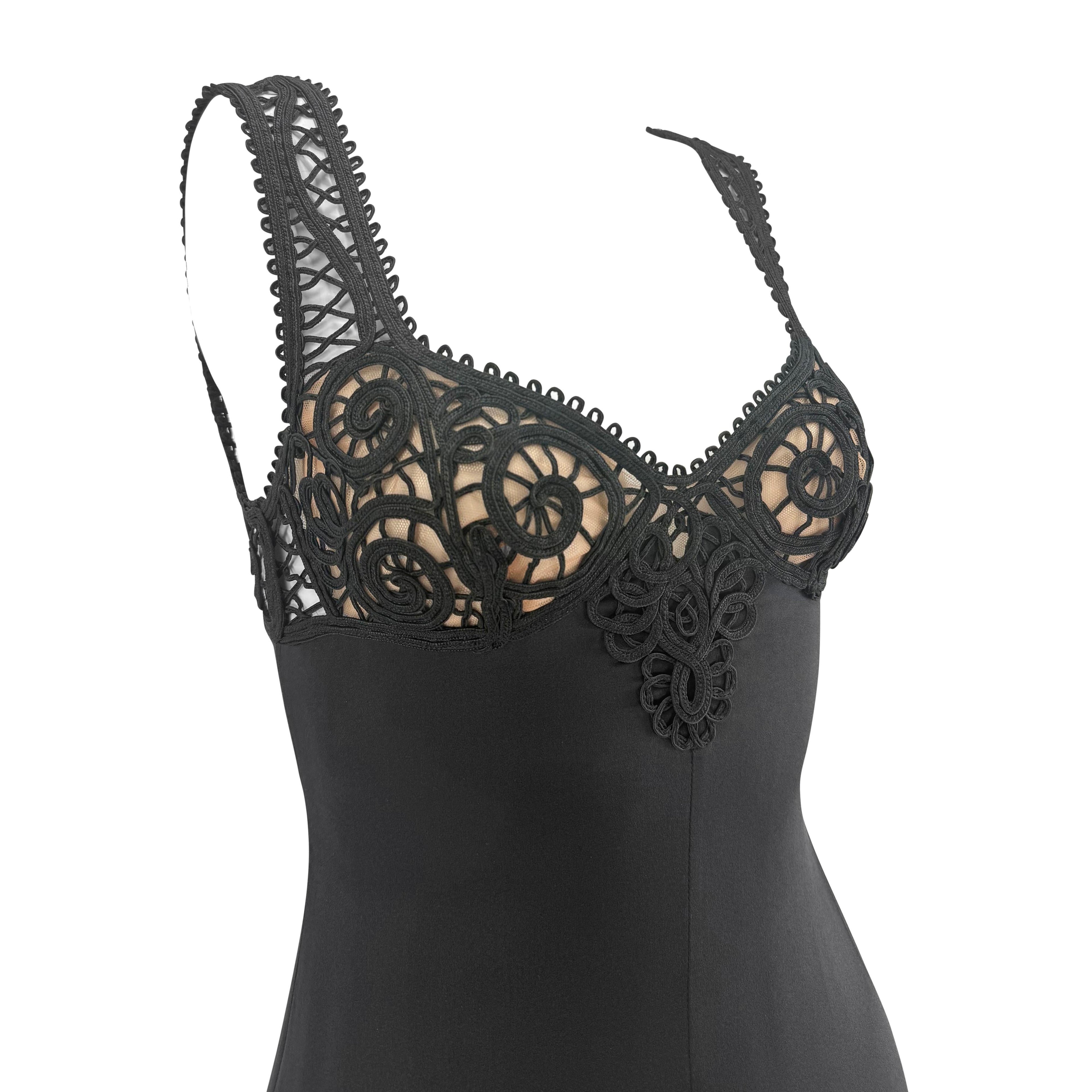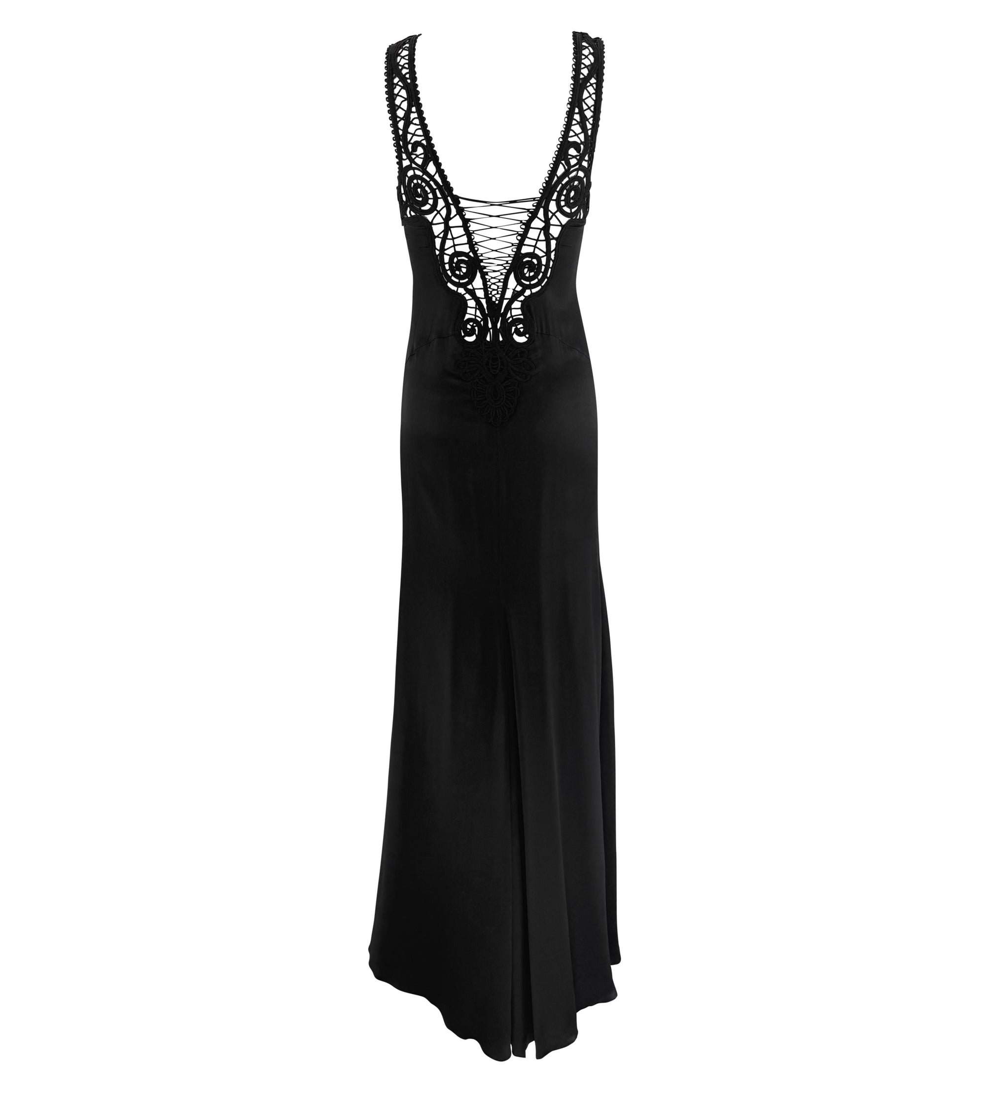 The dress features soutache appliqué in an ornate baroque-inspired scrollwork design that forms the shoulder straps. Constructed from intricate cording sewn directly onto the silk satin fabric or open space, the motif forms a dramatic deep-V silhouette, finished with a corset-style latticework. Beige mesh added behind the cording at the bust area for added coverage.