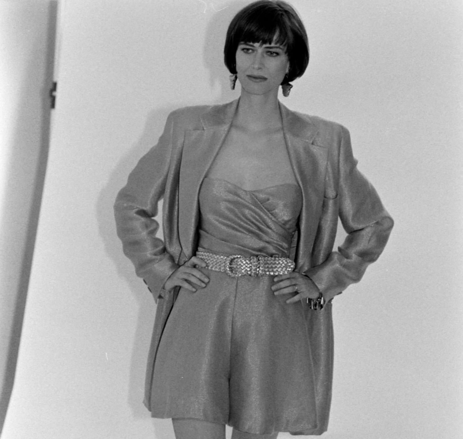 From Donna Karan's Resort 1992 collection, this strapless bustier top is crafted from gold linen lurex with a subtle metallic sheen. Modeled on the runway by Gina Di Bernardo, the sculpted silhouette features elegant ruching and a sweetheart neckline.