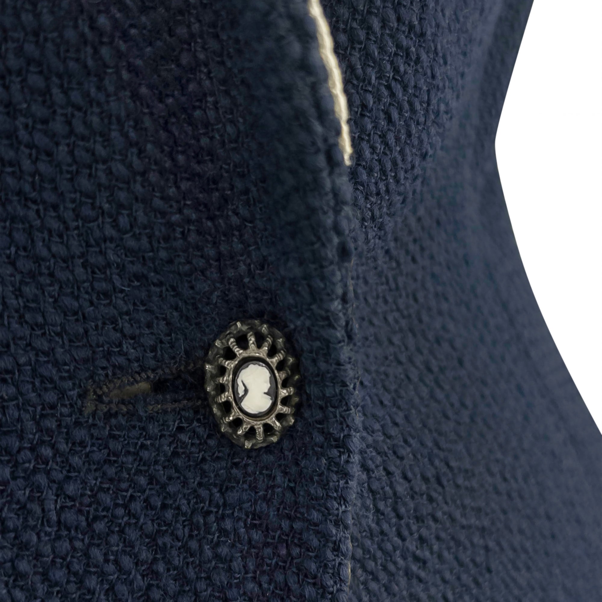 This Christian Dior long jacket from the Spring/Summer 1998 collection, designed by John Galliano, captures the season’s romantic yet structured aesthetic. Crafted in navy tweed, the jacket features a sharply tailored silhouette with a deep front cutaway, accentuated by a delicate white lace-trimmed collar. Additional lace and metallic trims embellish the cuffs. A single cameo-style button closure completes the design, emblematic of Galliano’s use of historical references.