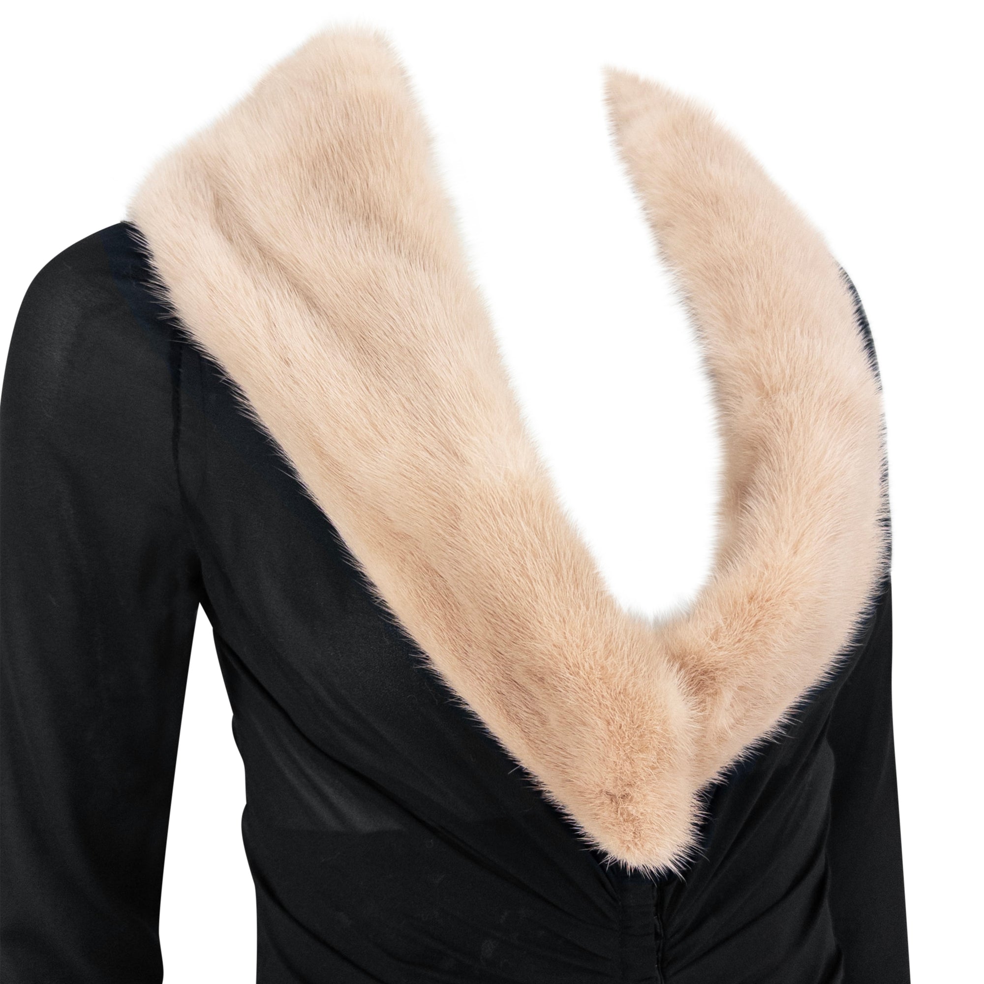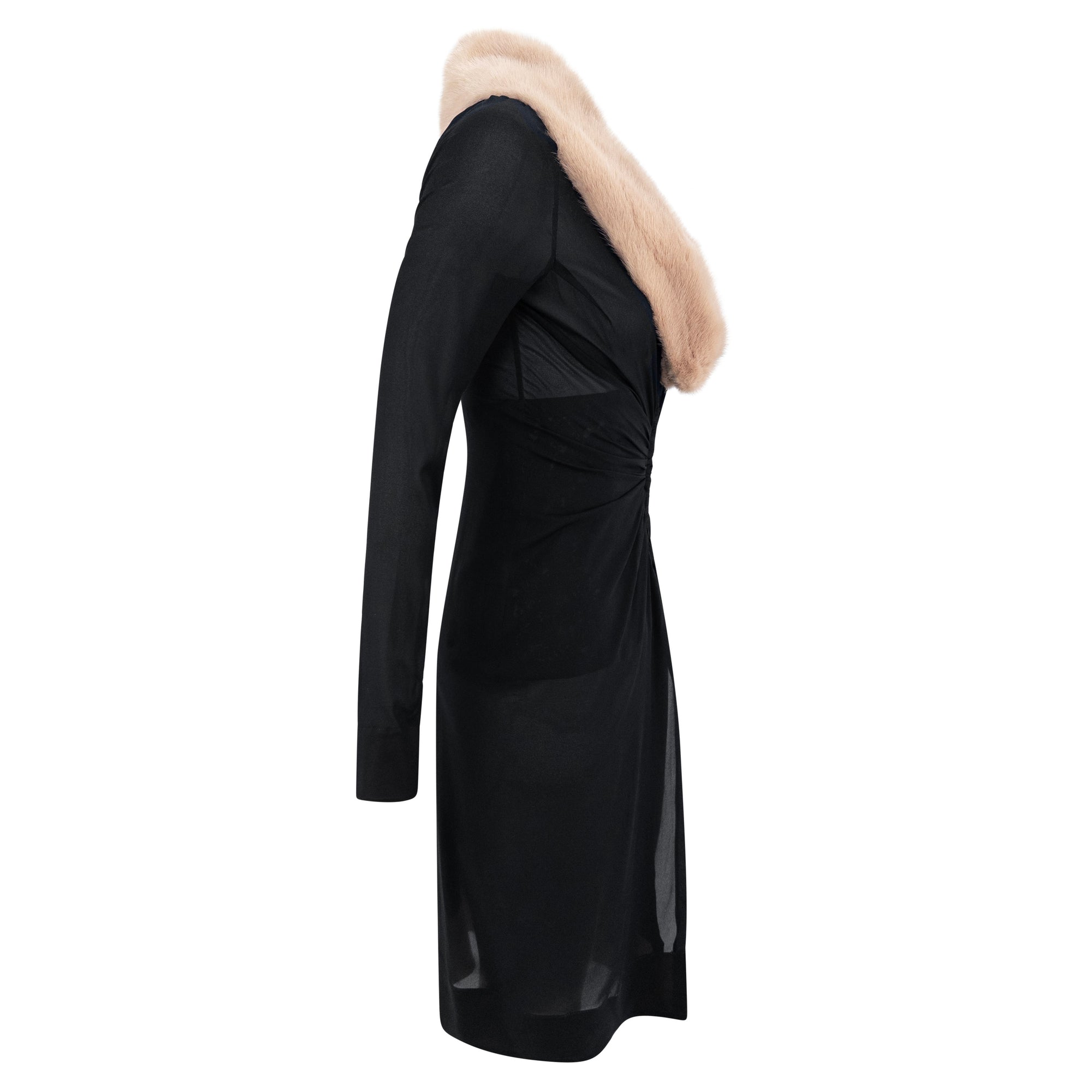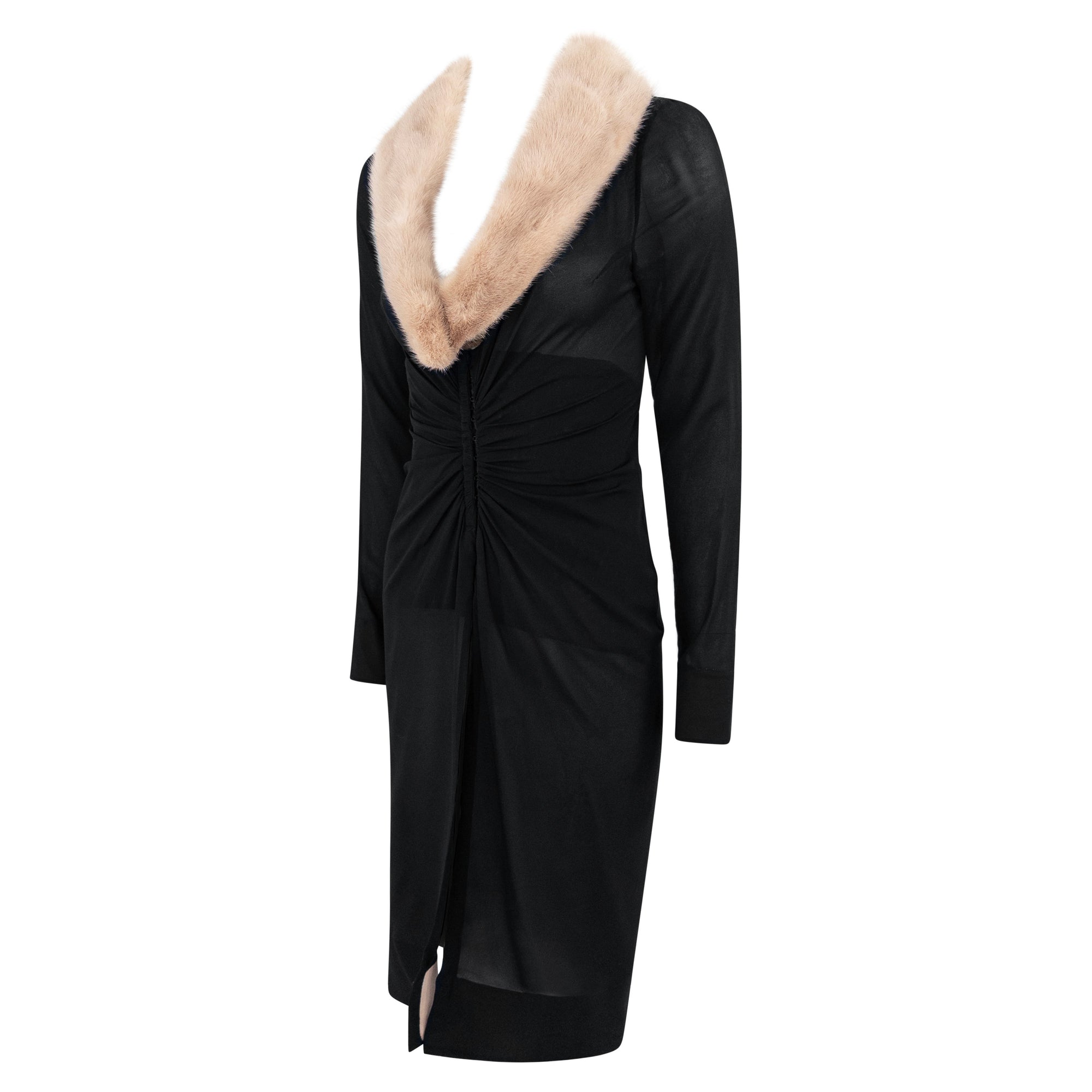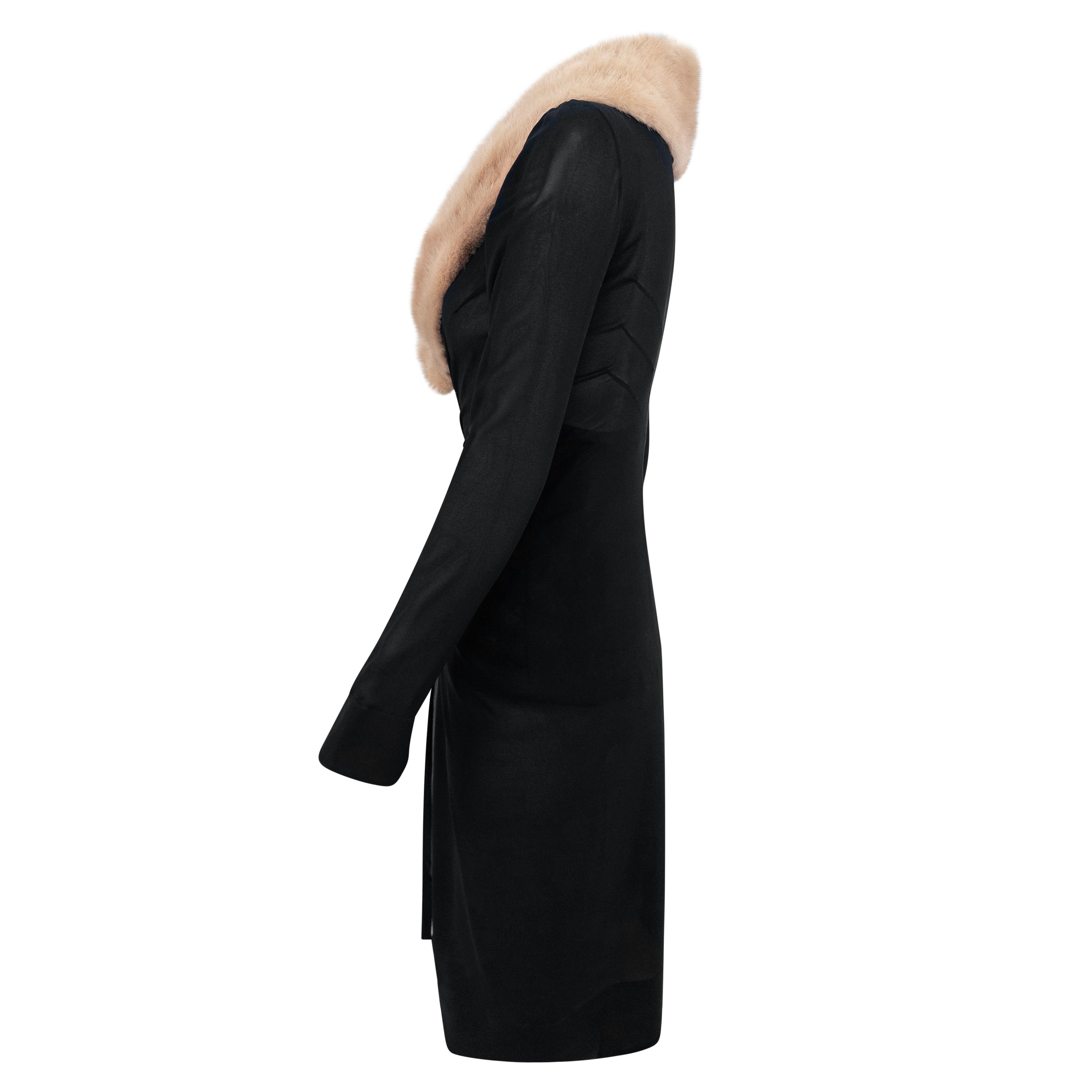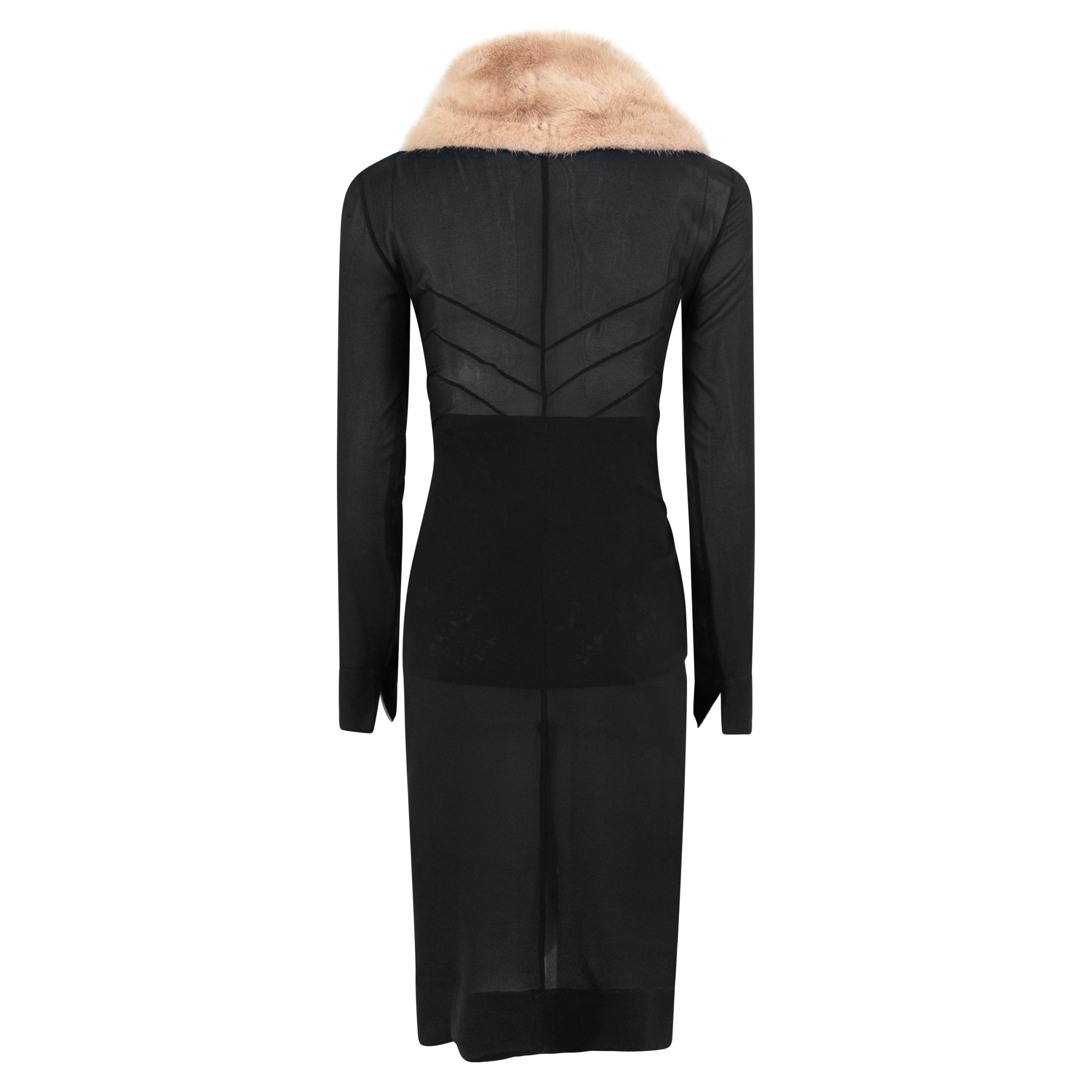 This Dolce & Gabbana sheer black coat dress from the Spring/Summer 1998 collection is designed with a corseted construction that sculpts the waistline. The dress features long sleeves and a deep V-neckline framed by a luxurious beige mink fur collar. Gathering at the center front creates a flattering draped effect, while the back reveals structured seaming for definition.