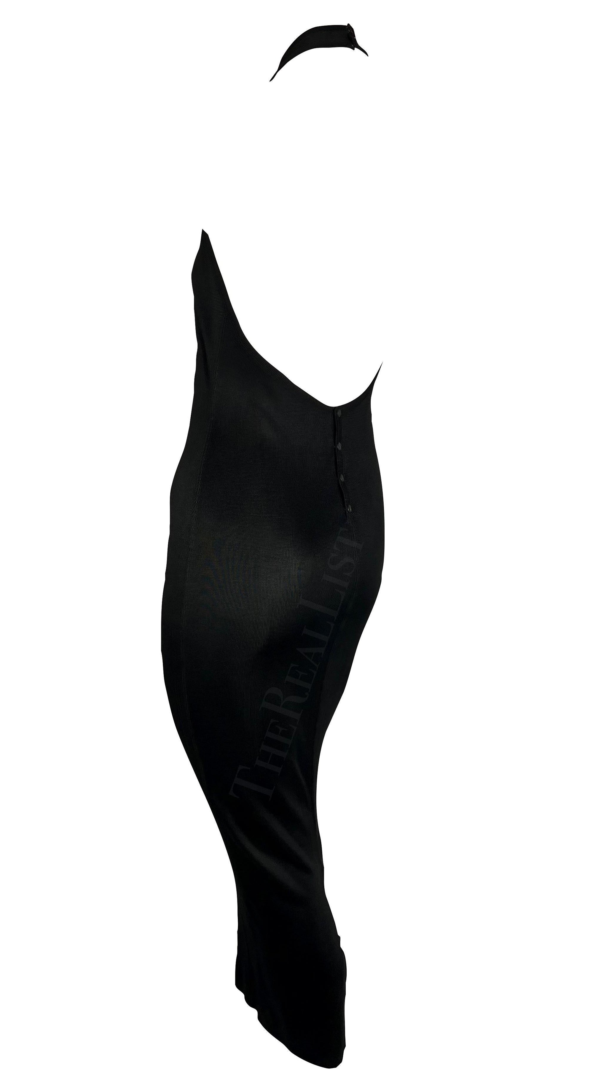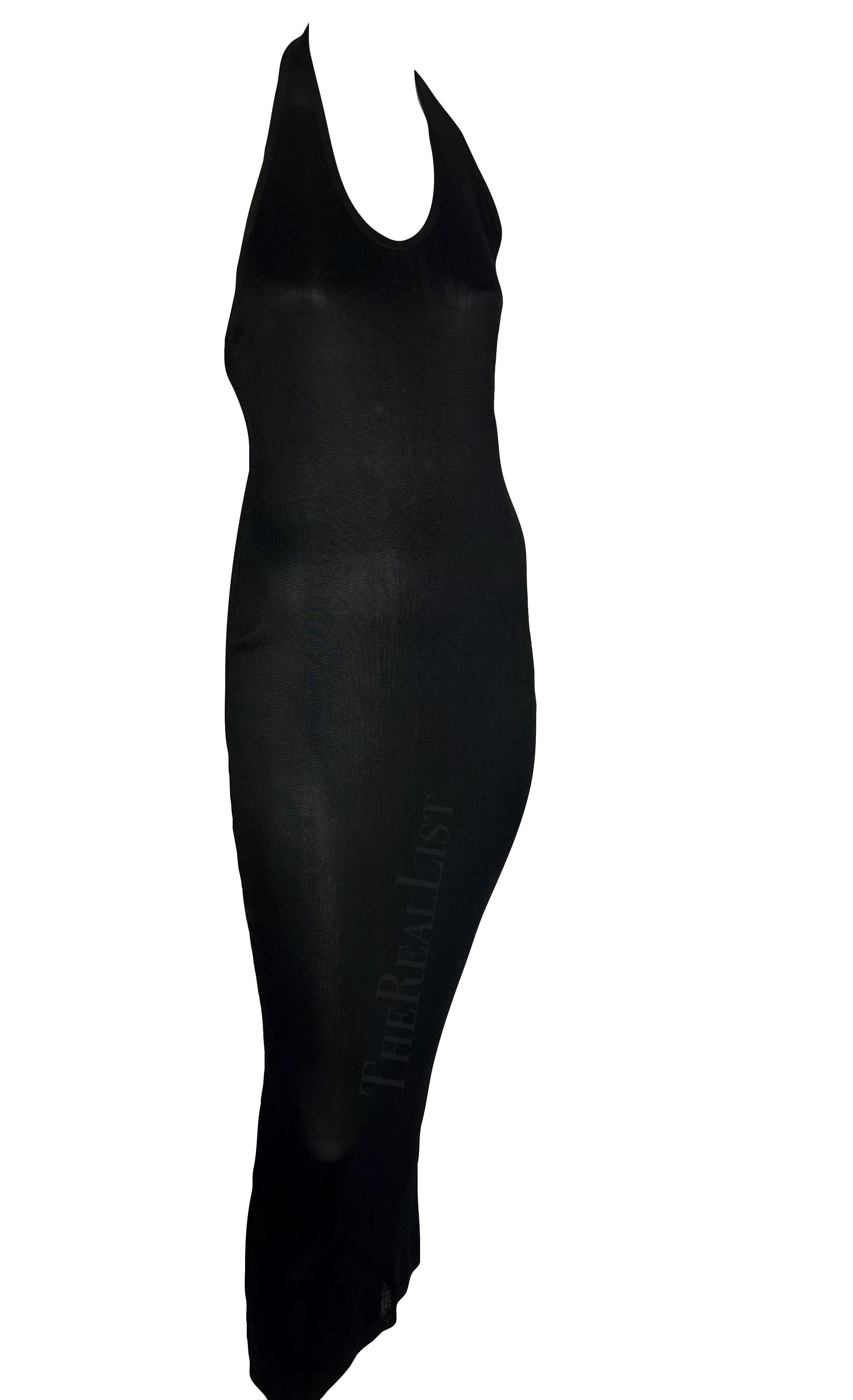 Presenting a fabulous black knit Alaia halterneck dress. From the Spring/Summer 1986 collection, this meticulously tailored dress accentuates the body's curves and showcases the brand's unparalleled craftsmanship. The dress's low scoop neckline and daring exposed back add an air of sensuality, while the subtle back slit and elegant snap details at the lower back elevate its allure. A quintessential sexy little black dress, this iconic piece effortlessly exudes sophistication and confidence. An embodiment of the perfect little black dress, this Alaia creation seamlessly combines timeless style with undeniable sexiness.