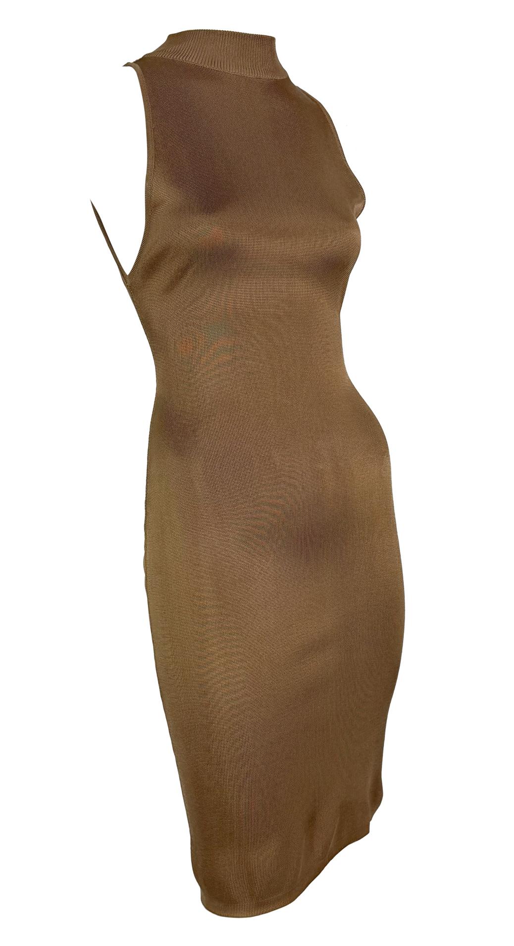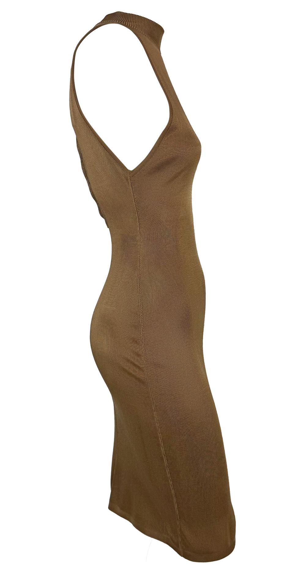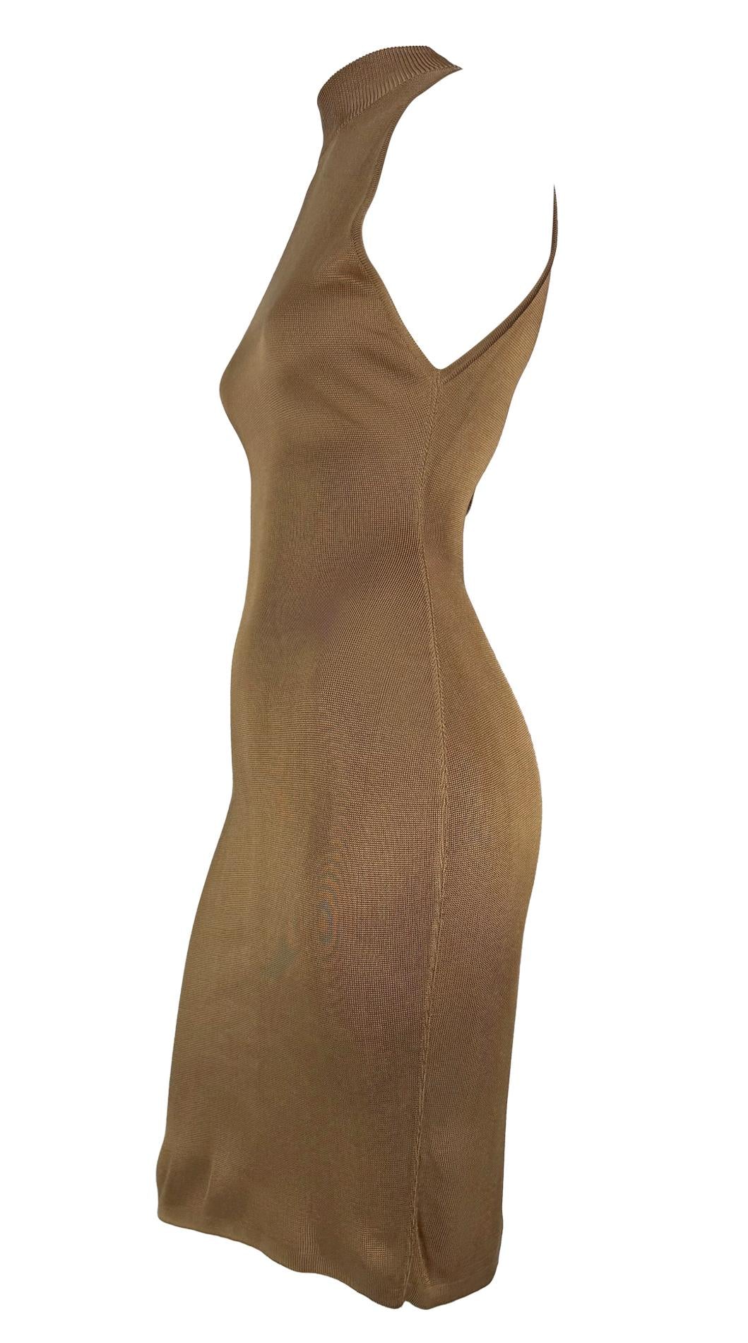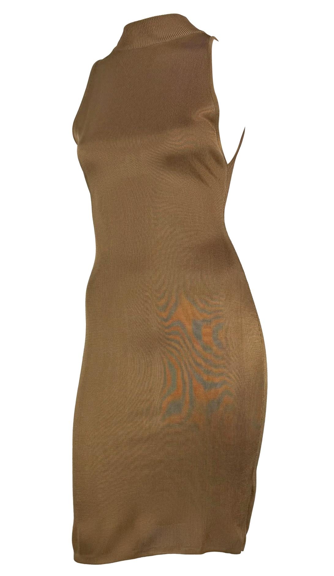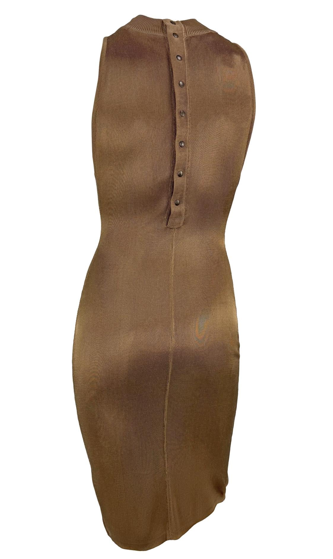 From Azzedine Alaïa's Spring/Summer 1986 collection, this bodycon dress debuted on the season's runway and is crafted from a shiny copper-tone knit. The sleeveless design features a high neckline and snaps at the back, showcasing Alaïa's mastery of form.