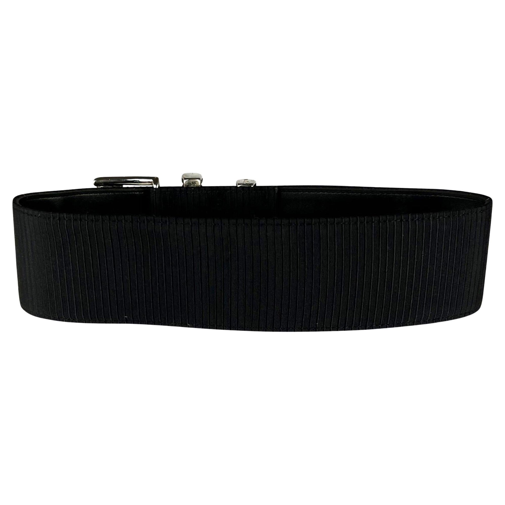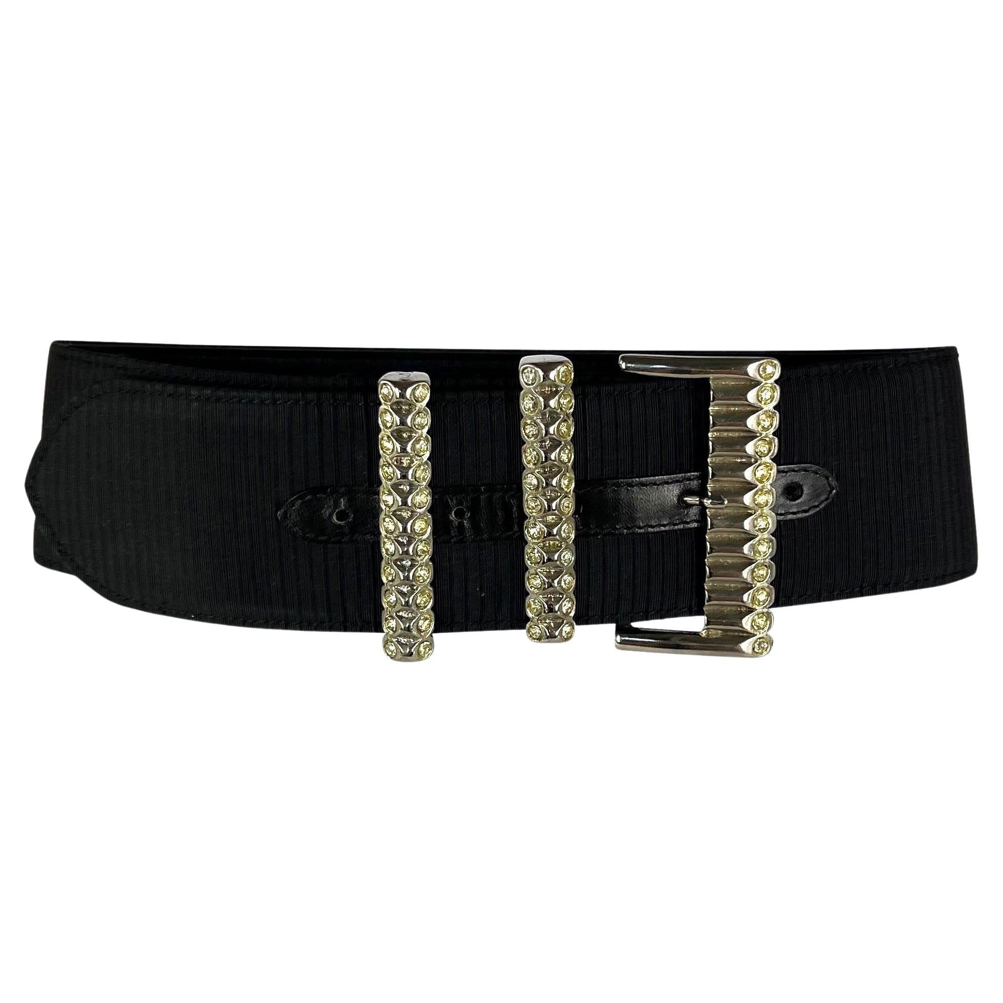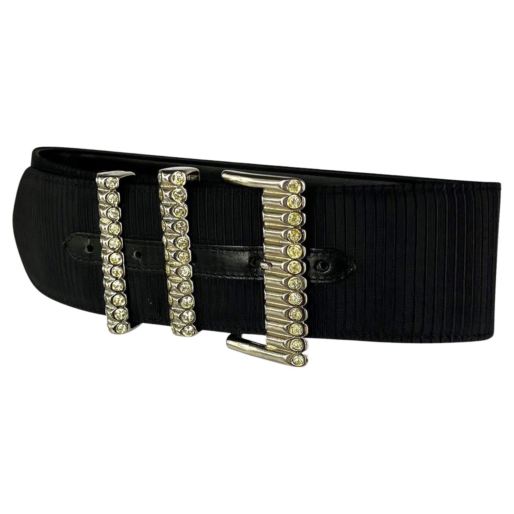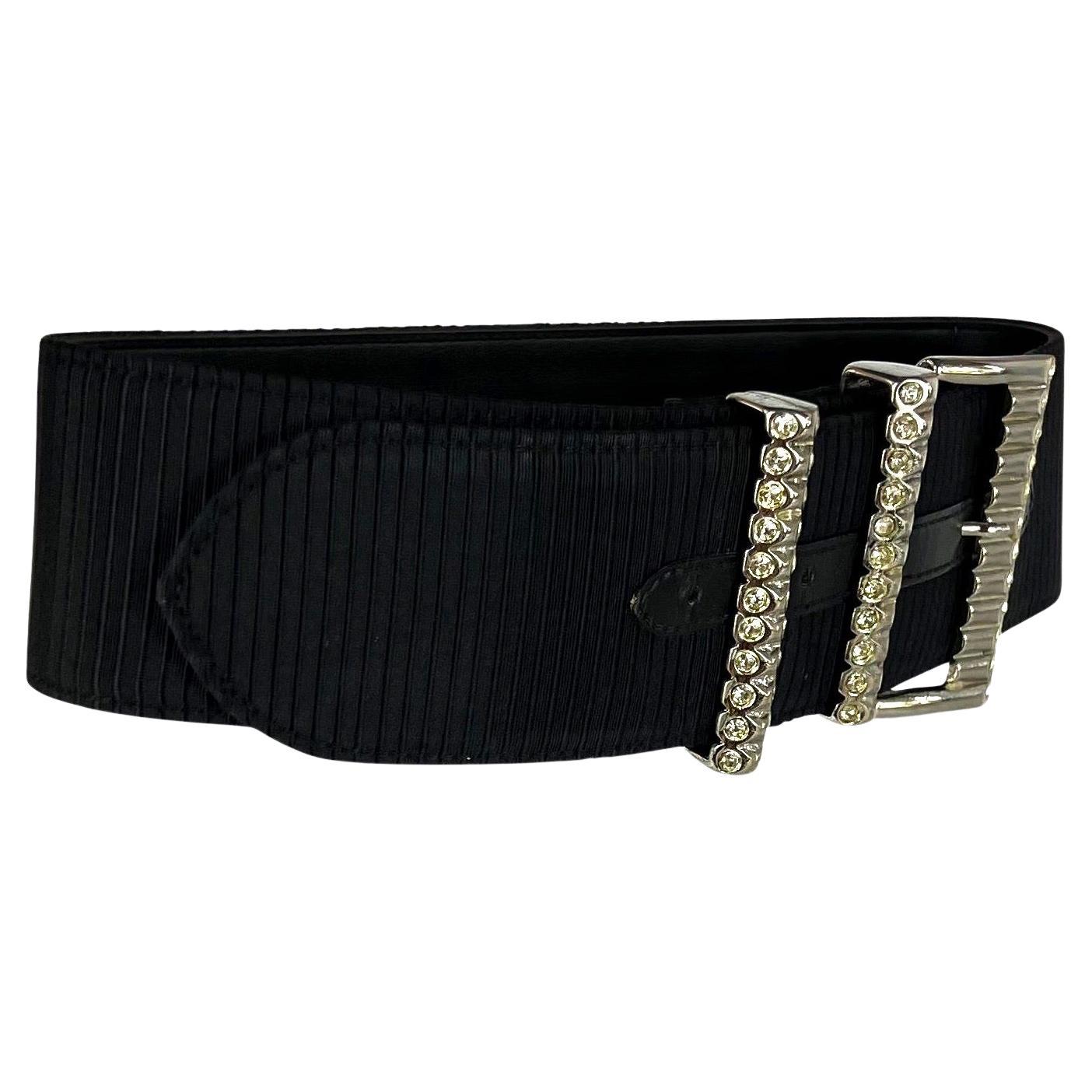 This wide black belt from Gianni Versace’s Spring/Summer 1988 collection is a documented archival accessory. Designed by Gianni Versace, it features a ribbed fabric strap paired with a large silver-tone buckle and rhinestone-embellished loops. The belt was also featured in the season’s ad campaign, worn by Brynja Sverris and photographed by Richard Avedon.
