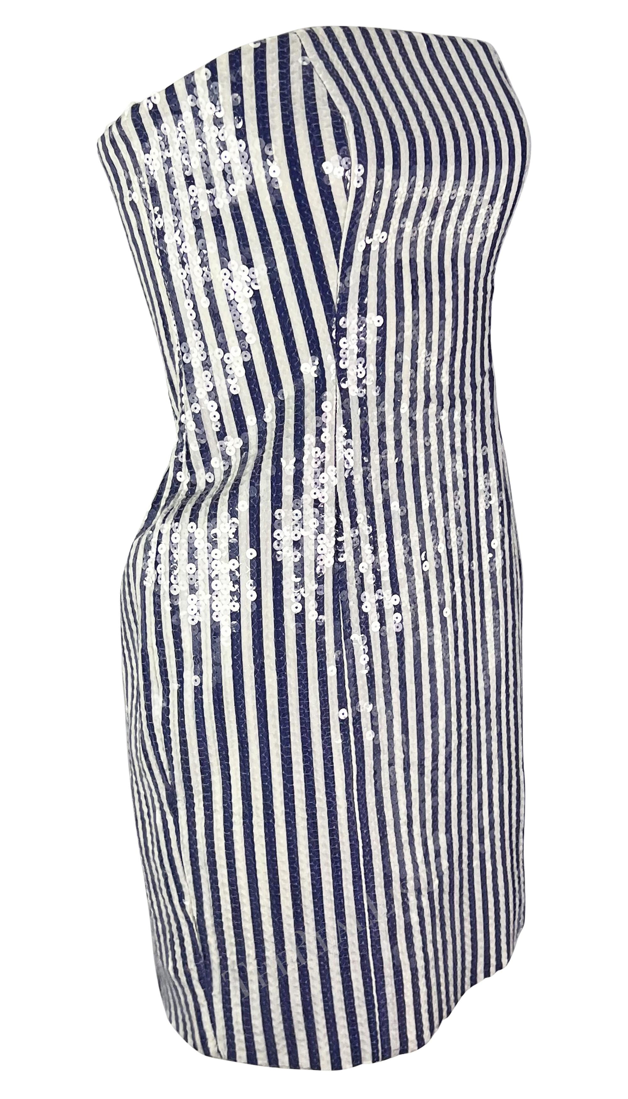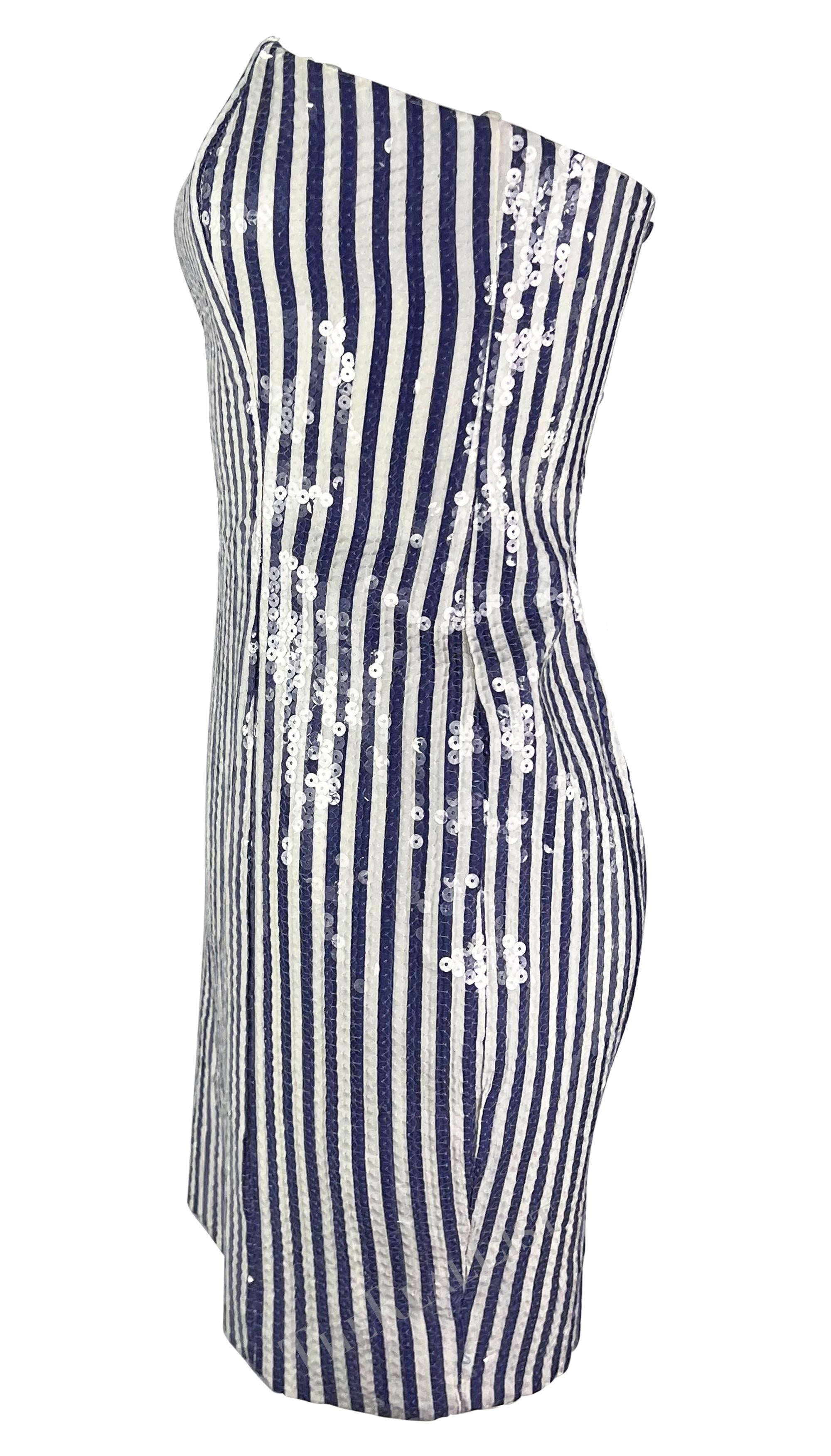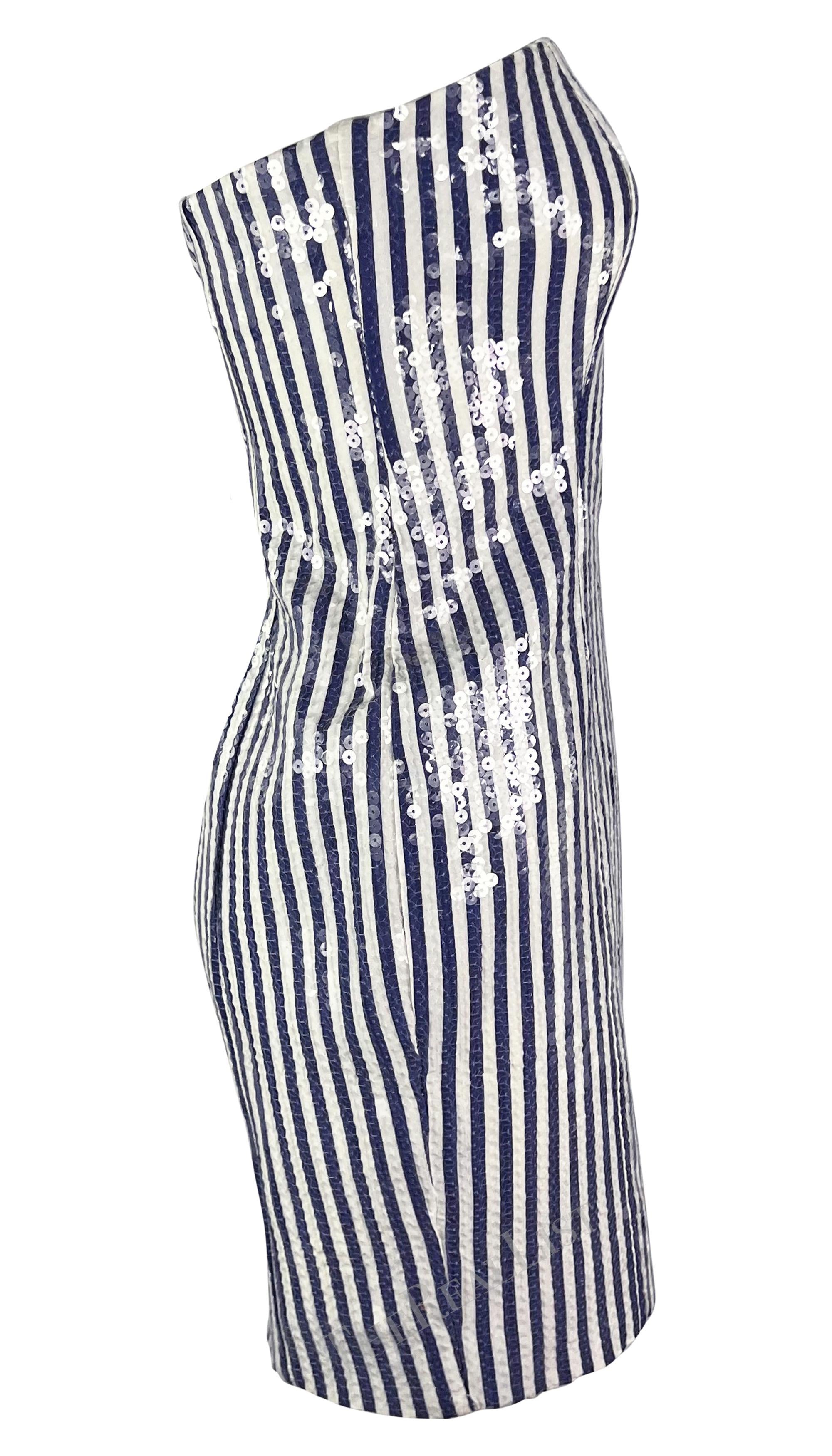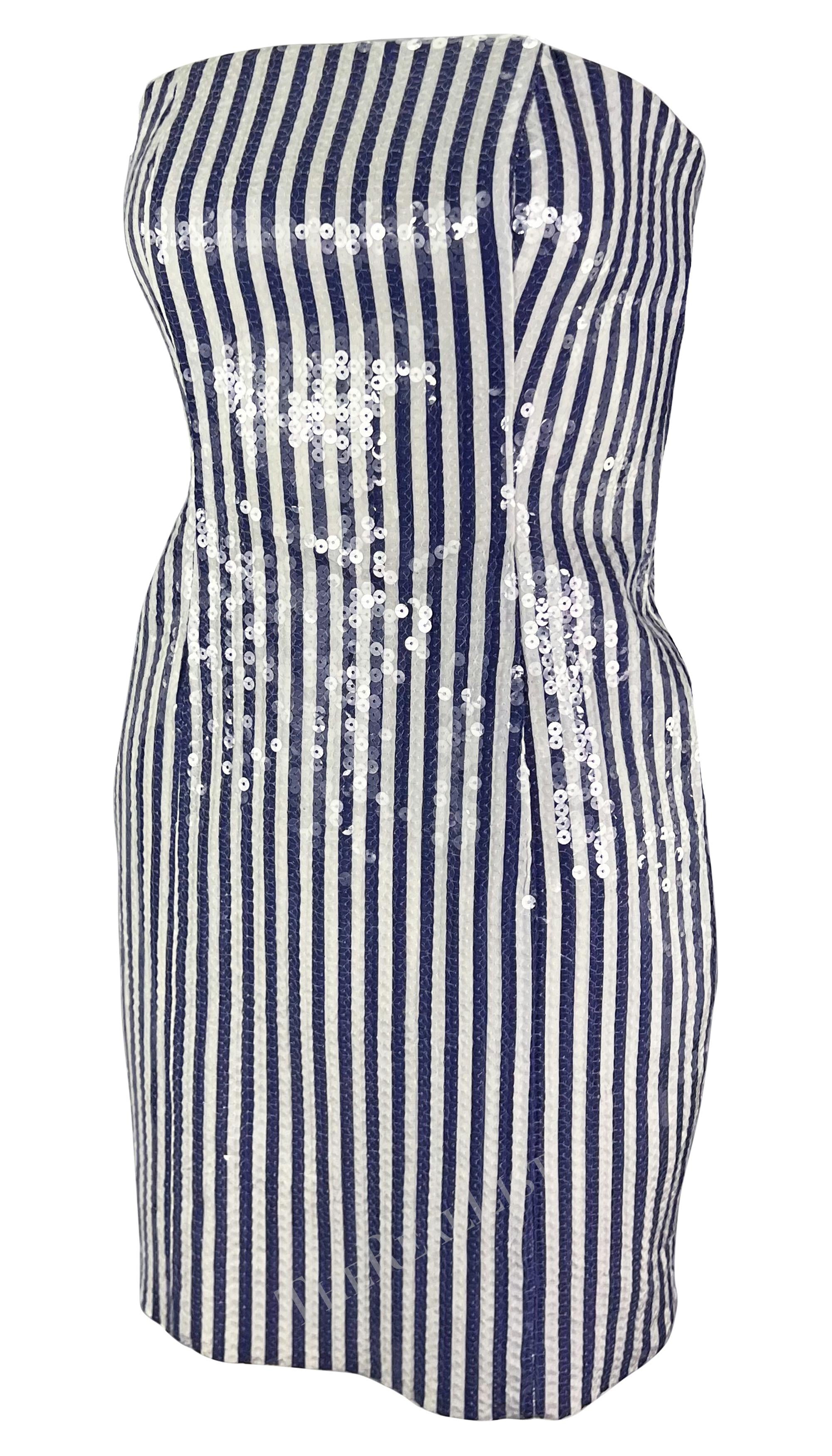 S/S 1990 Michael Kors Runway Blue White Sequin Striped Strapless Mini Dress