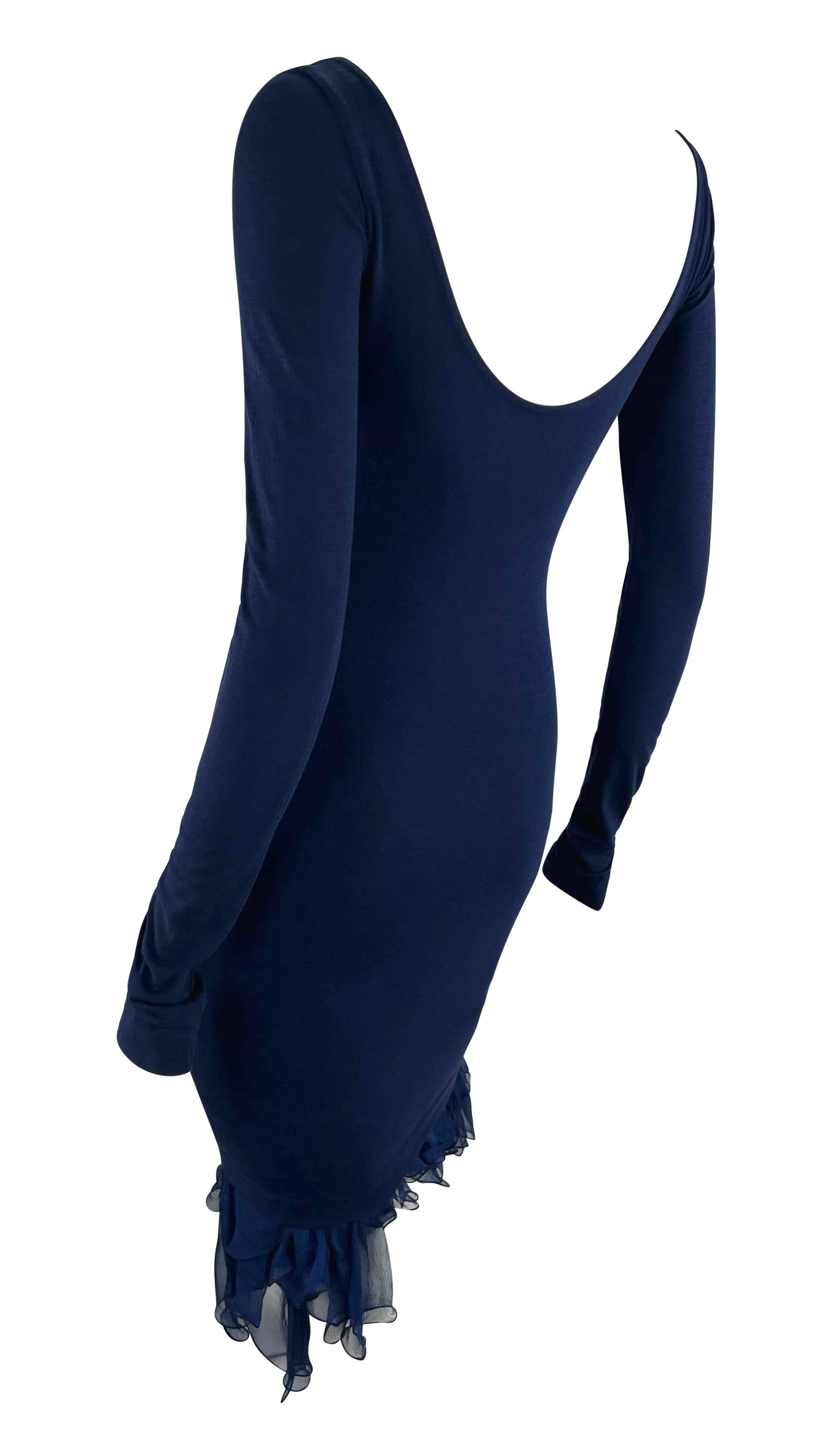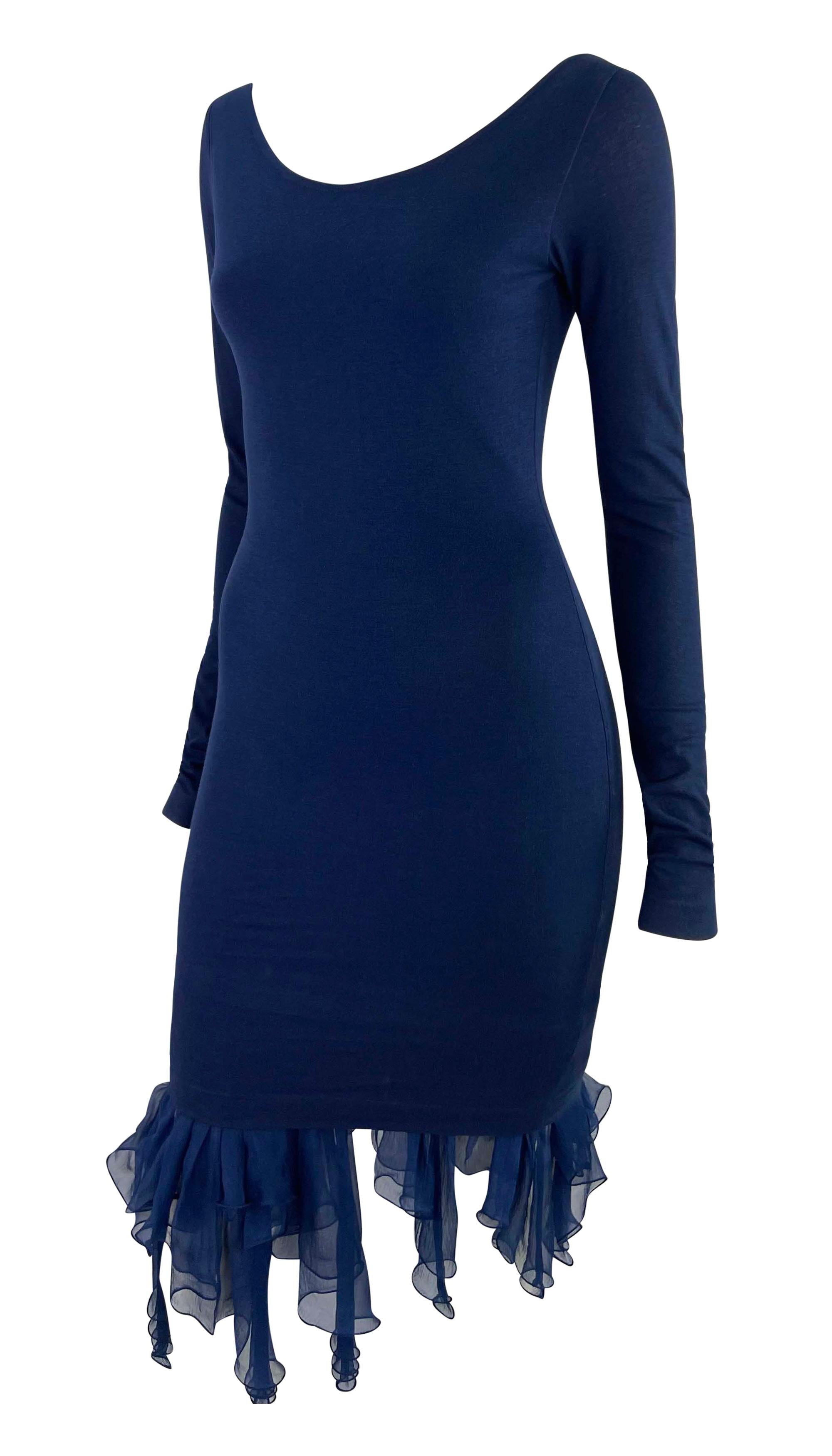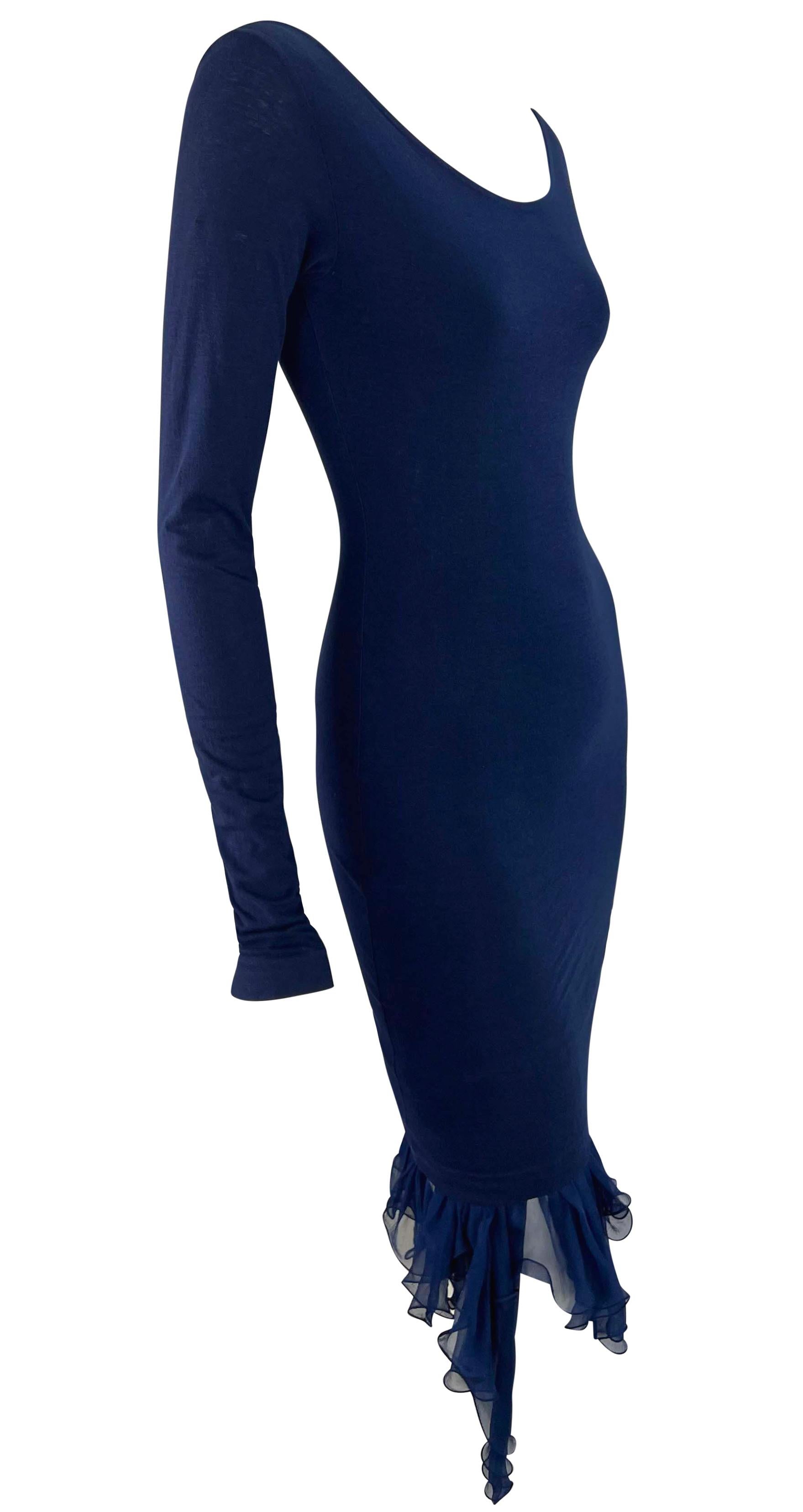 This blue bodycon dress by Dolce & Gabbana from the Spring/Summer 1991 collection features a scoop neckline and long sleeves. The silhouette is complemented by a ruffled chiffon hem, adding a soft, flowing touch to the form-fitting design.