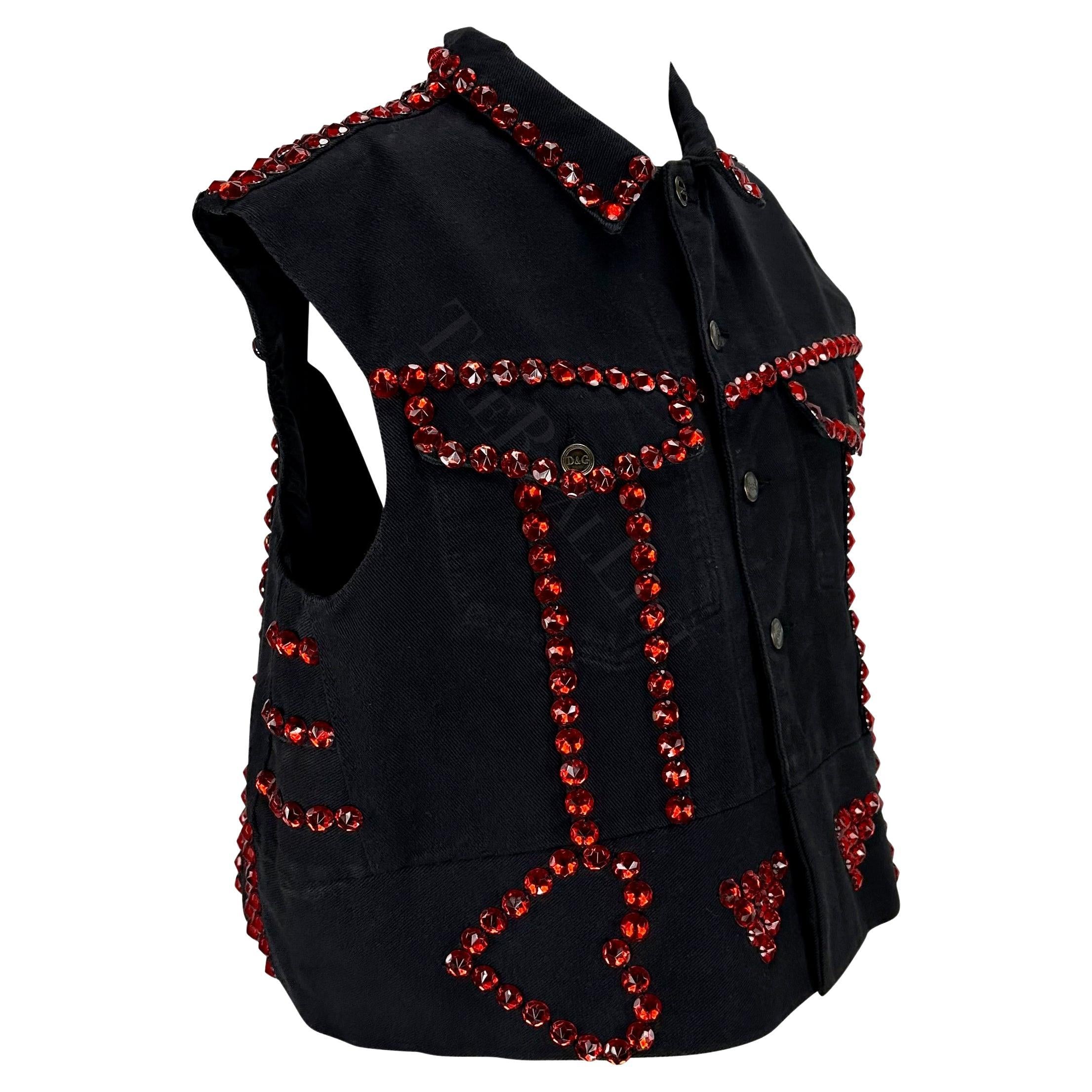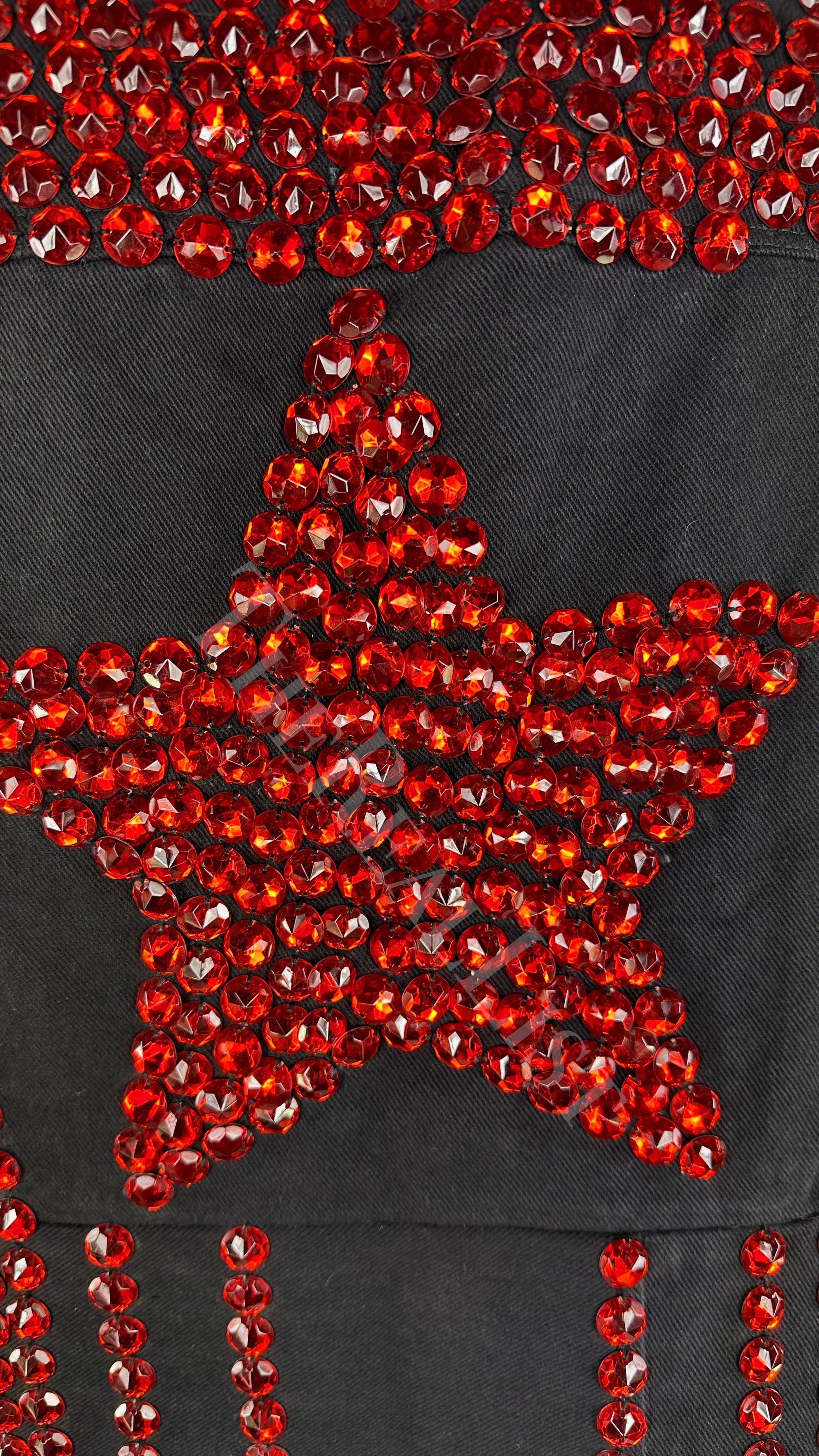 Presenting an incredible black denim Dolce and Gabbana denim vest. From the Spring/Summer 1992 collection, this flashy vest is covered in red rhinestones that line each seam and are used to create a heart design at the front and a large star at the back. A rare find, this Dolce and Gabbana 'gem' is a must-have addition to any wardrobe.