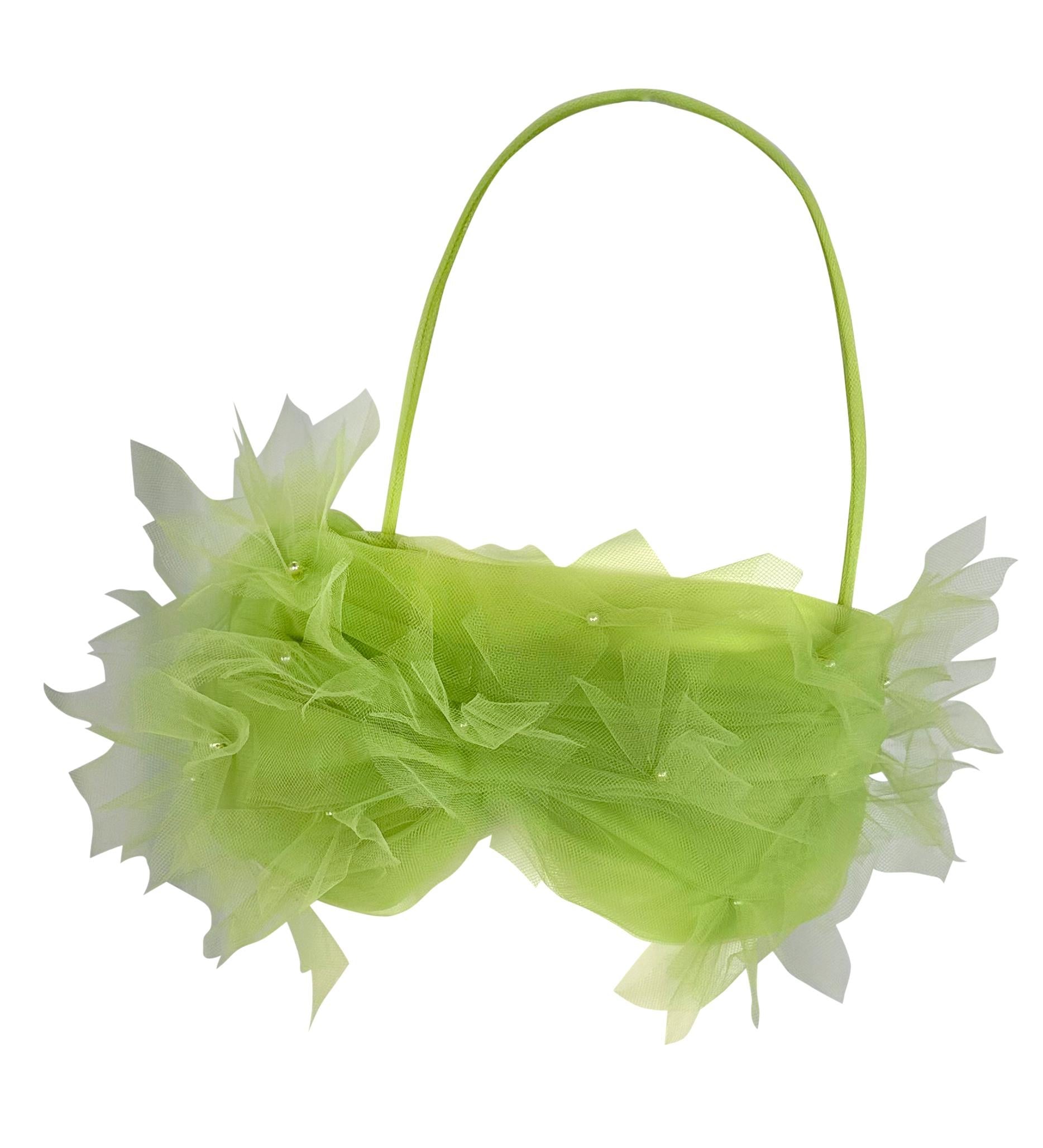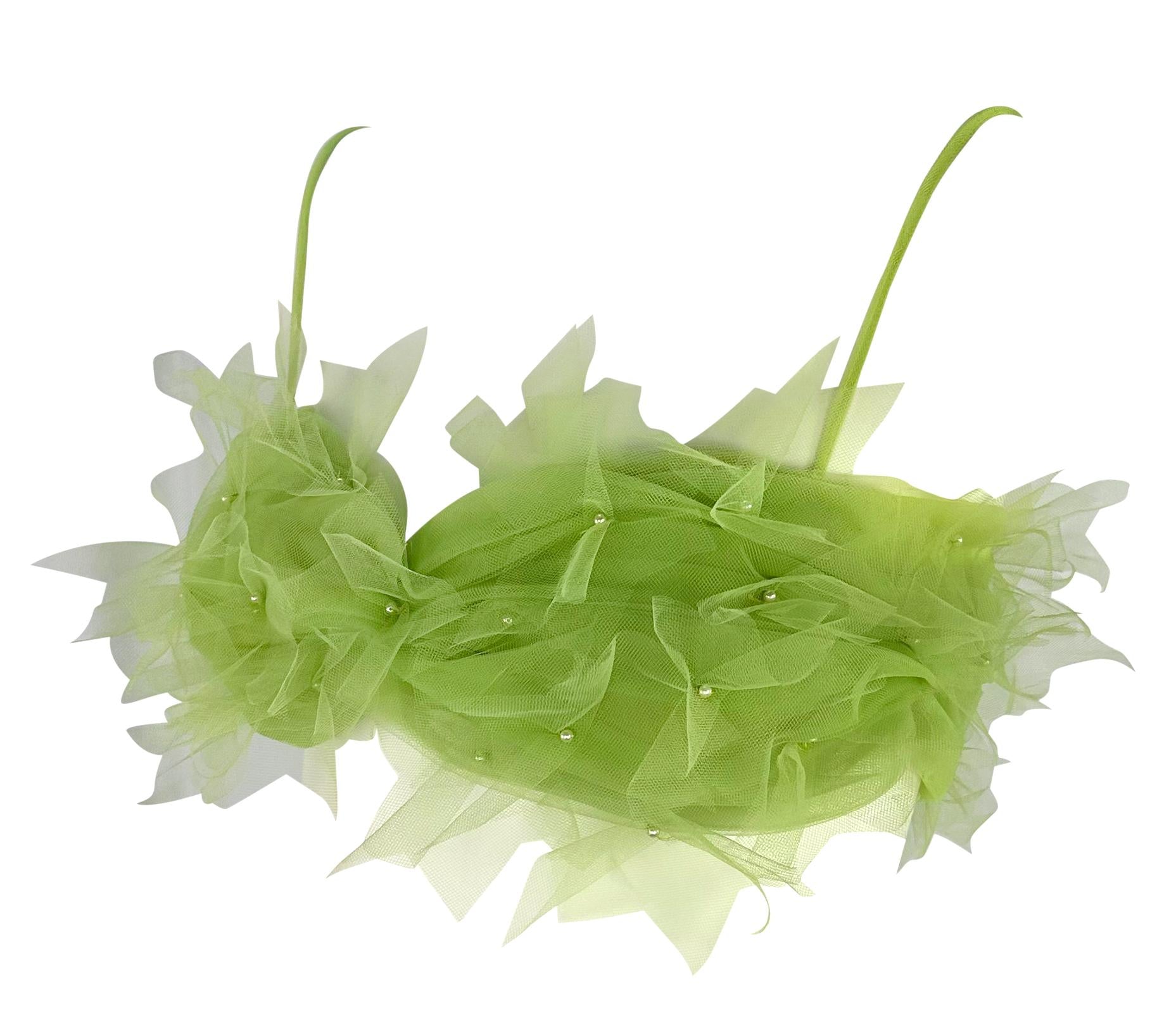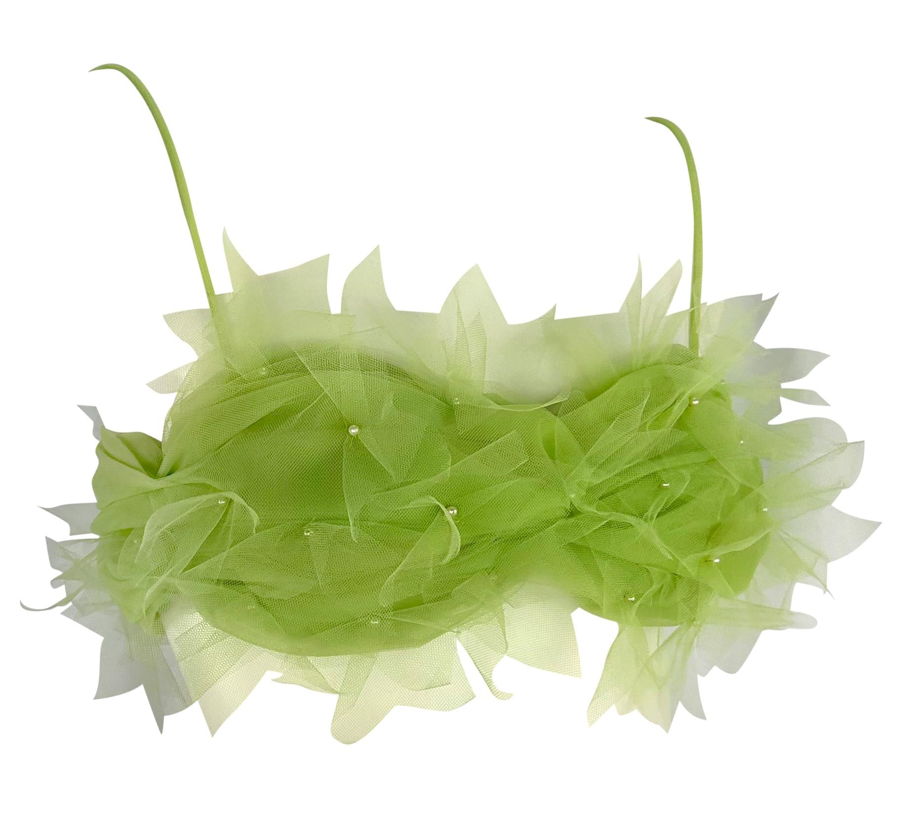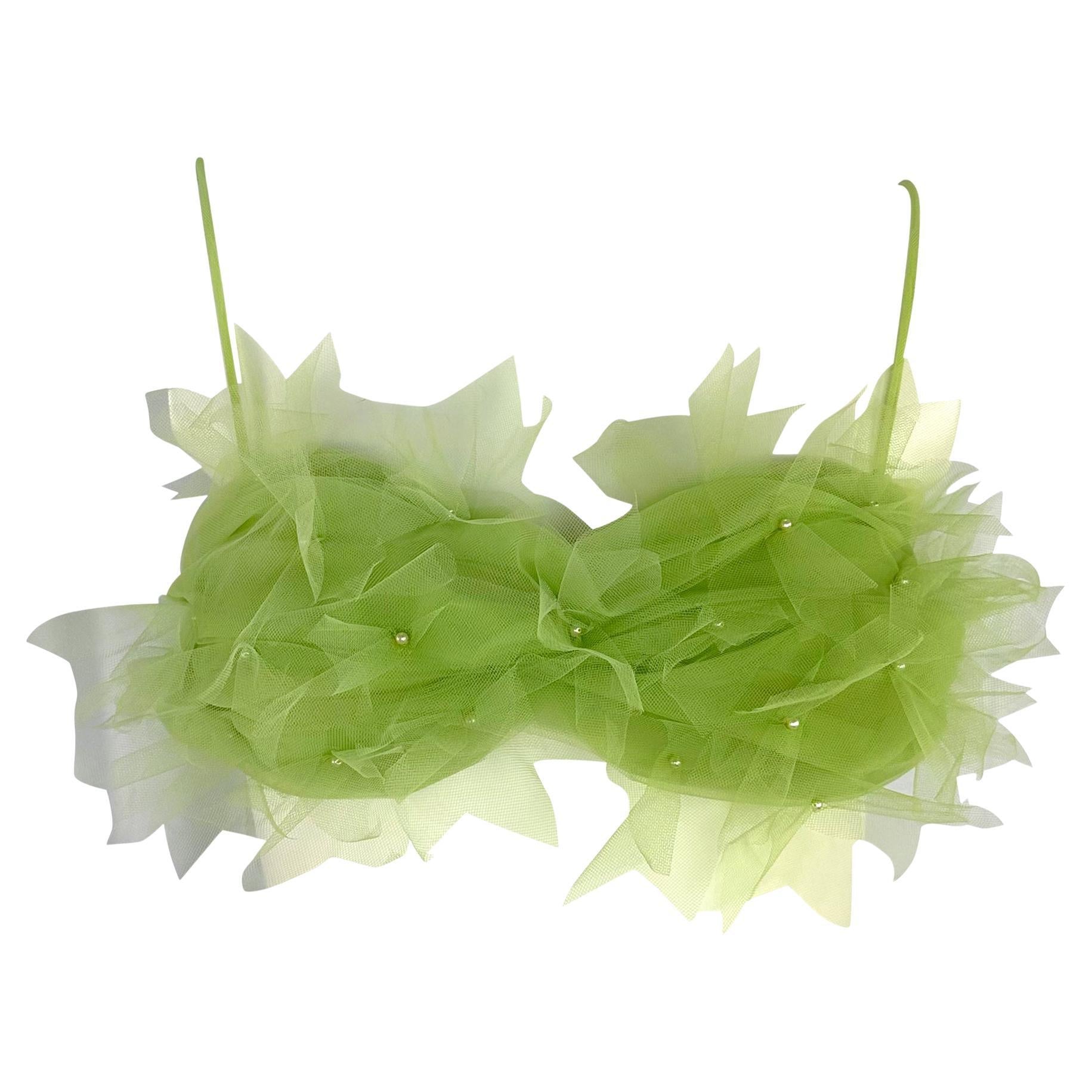 Presenting a lime green tulle bralette from Dolce & Gabbana's Spring/Summer 1992 collection. Debuting on the season's runway as part of look 24, modeled by Linda Evangelista, this airy piece is constructed from layered ruffled tulle embellished with scattered faux pearl beads. Also featured in the "Baby Doll" editorial for the February 1992 issue of Vogue Italia, captured by Walter Chin.